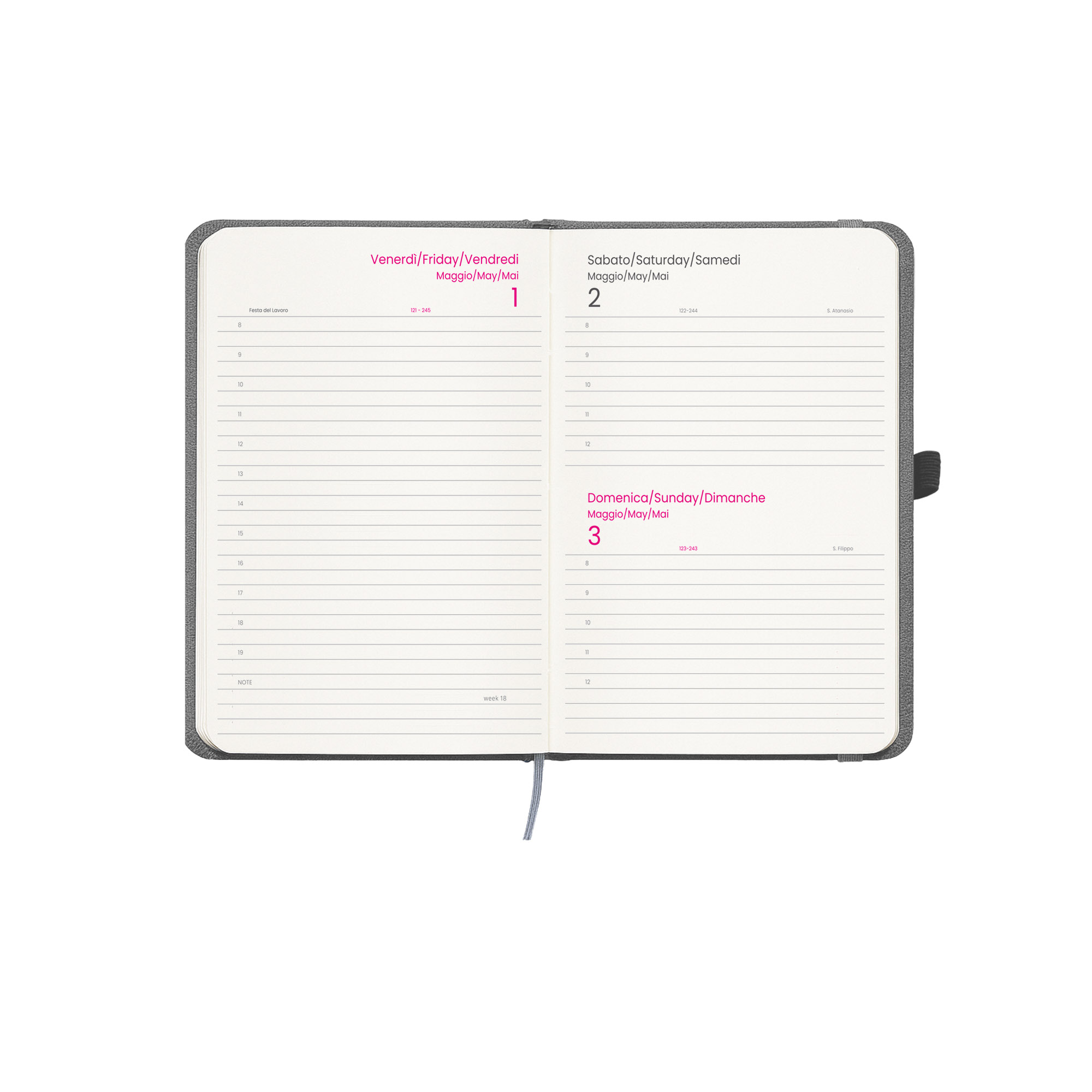 Agenda giornaliera 2026, copertina rigida in PET riciclato con effetto mélange e impuntura perimetrale. Con elastico per la chiusura e anello porta penna. 12 mesi. 176 pagine in carta bianca da 70 g/m2. Copertina personalizzabile. Scatola su richiesta 23799
