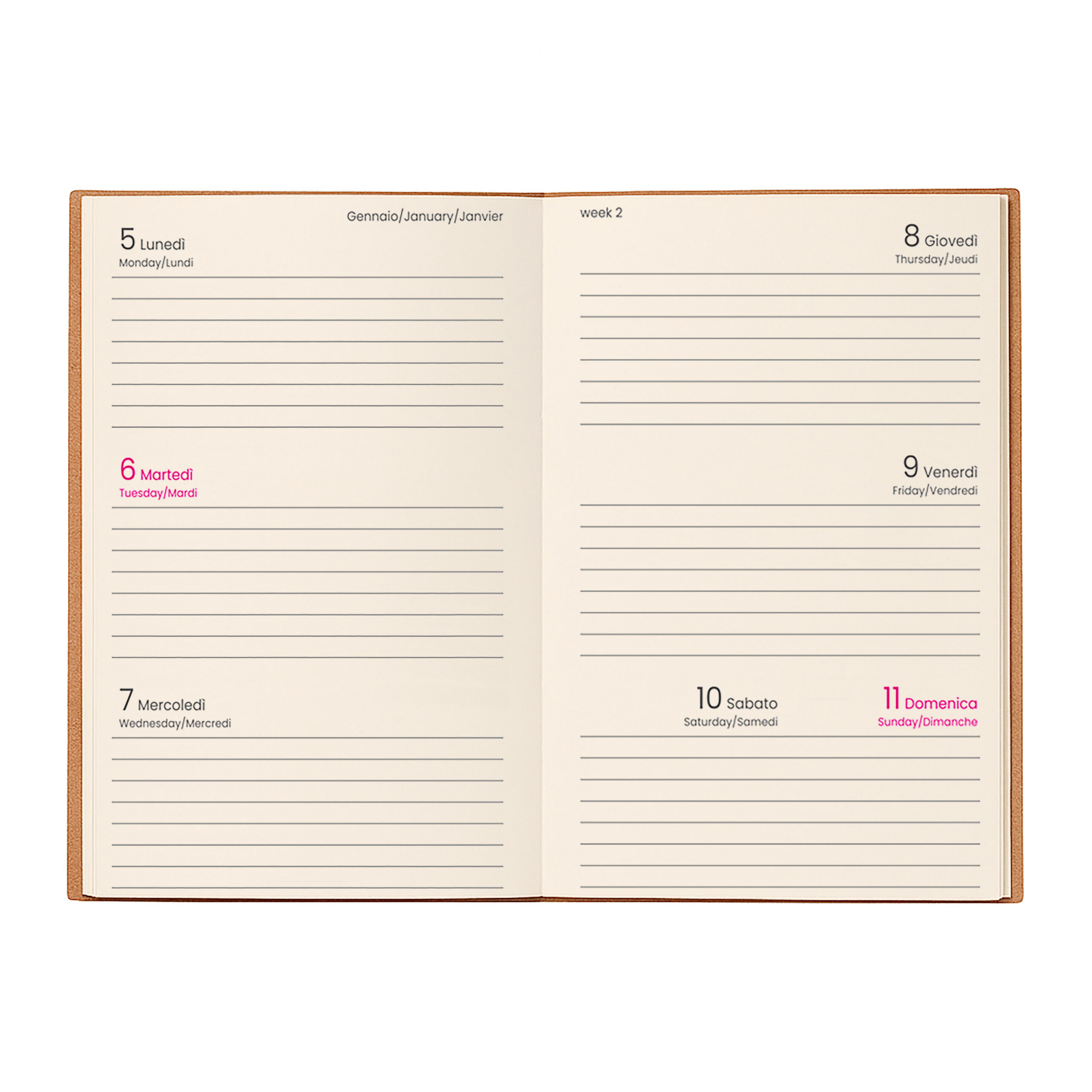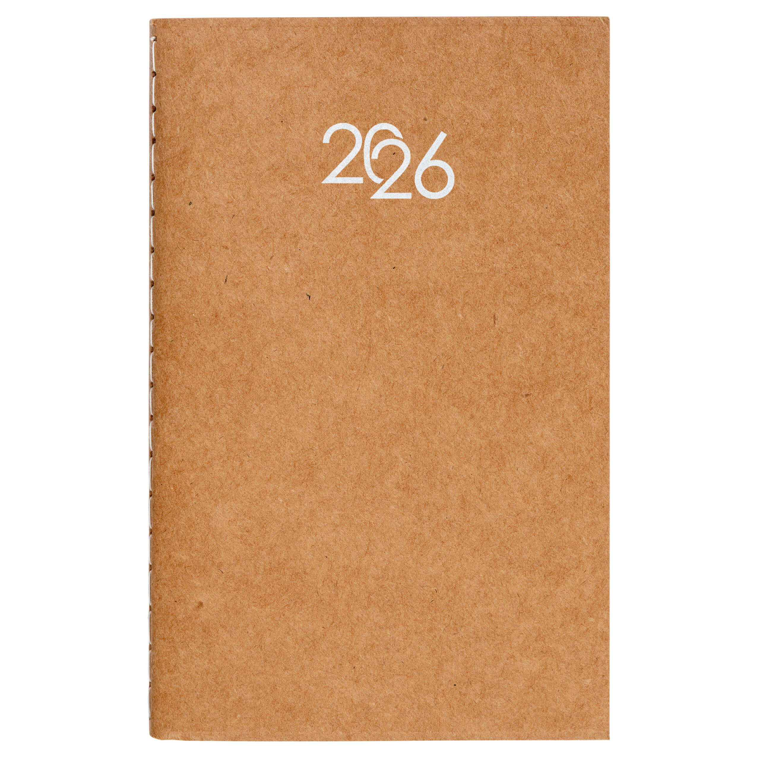 Agenda tascabile settimanale 2026 con copertina flessibile in cartoncino. 12 mesi. 64 pagine in carta avorio da 70 g/m2. Copertina personalizzabile.