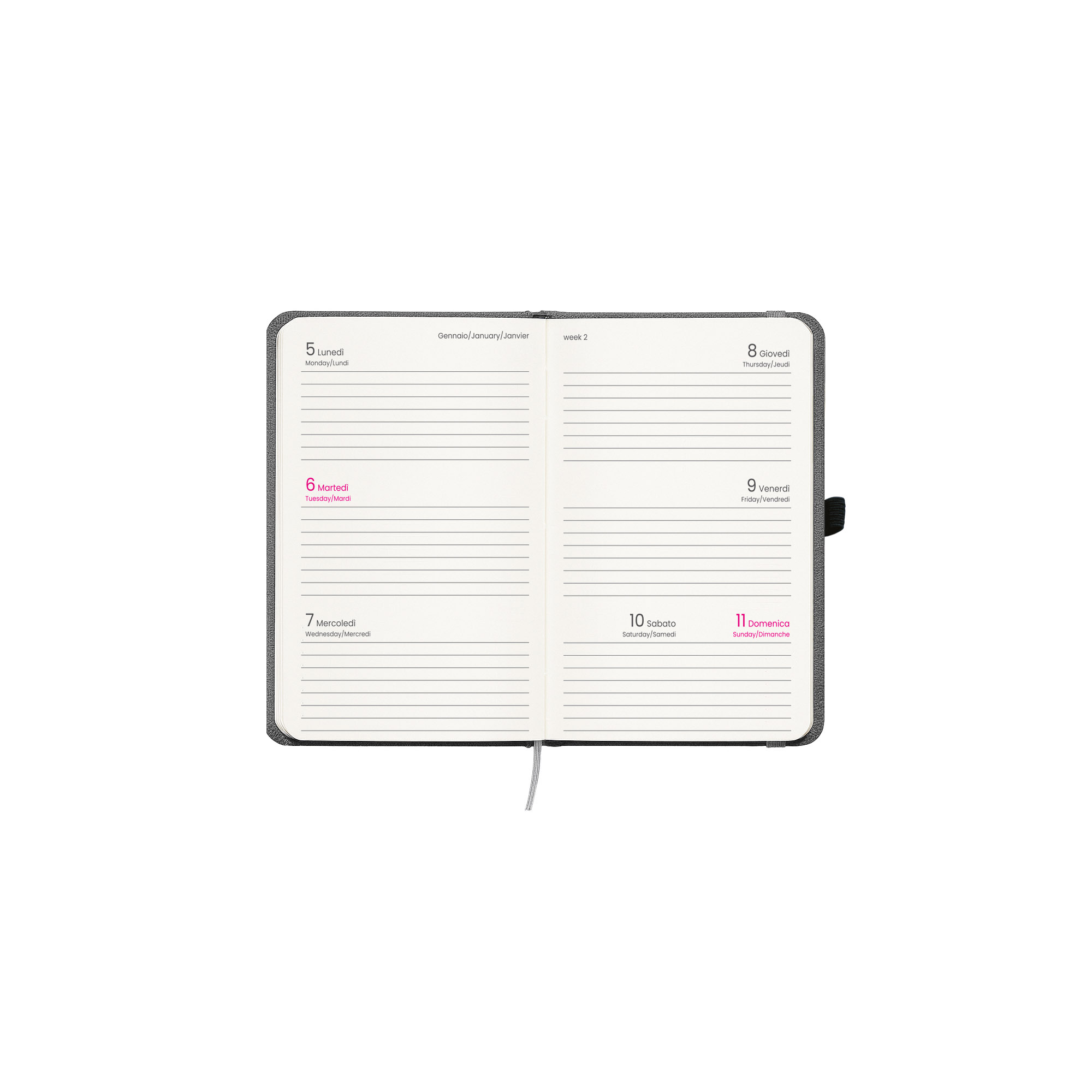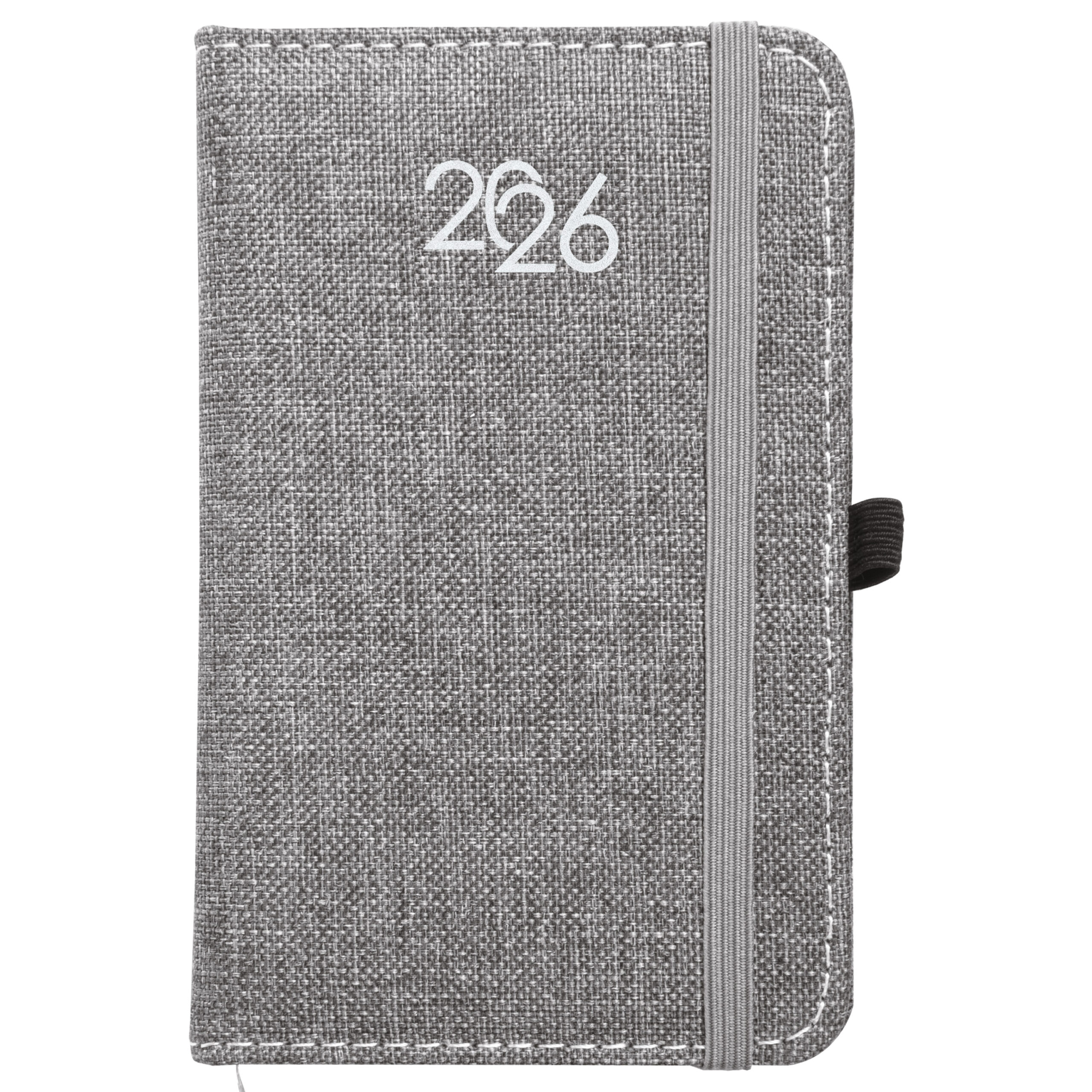 Agenda tascabile settimanale 2026, copertina rigida in PET riciclato con effetto mélange e impuntura perimetrale. Con elastico per la chiusura e anello porta penna. 12 mesi. 64 pagine in carta bianca da 70 g/m2. Copertina personalizzabile. Scatola su richiesta 23794