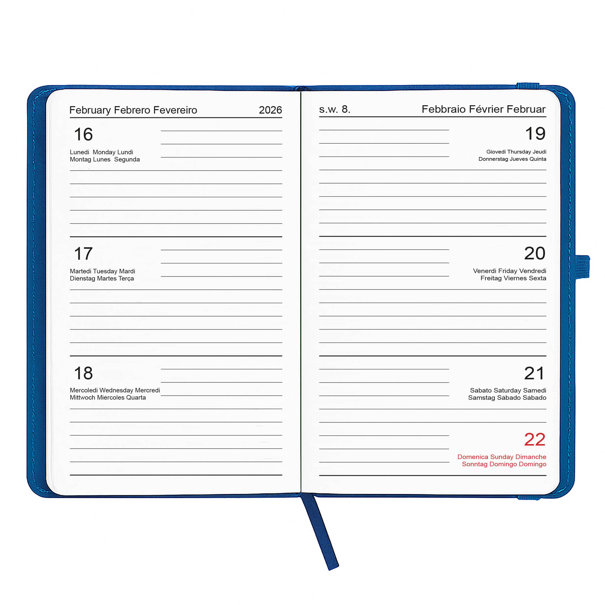 Agenda tascabile settimanale 2026, copertina rigida in PU termovirante con impuntura perimetrale. Con elastico per la chiusura e anello porta penna. 12 mesi. 64 pagine in carta da 70 g/m2 e stampa a due colori. Dimensioni agenda 9×14 cm. La copertina è personalizzabile. Scatola opzionale 25795