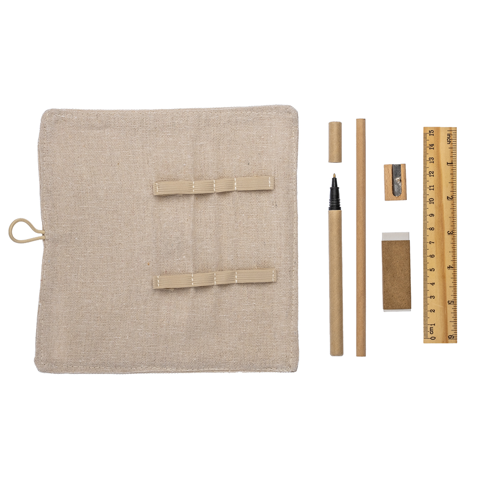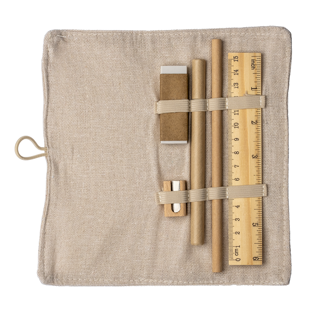 Astuccio arrotolabile in cotone. Chiusura con bottone ed elastico. Al suo interno gomma, temperino, matita, penna e righello