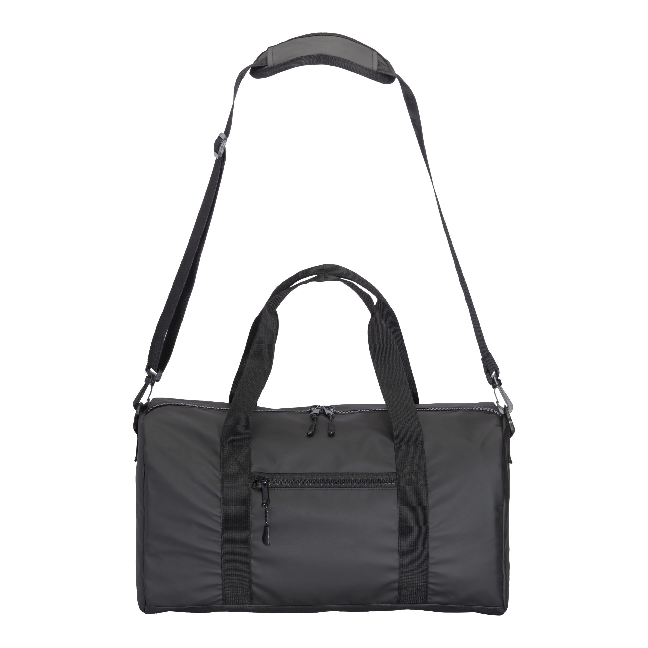 Borsa Duffle in poliestere water resistant. Tracolla regolabile e removibile con fibbia, tasca frontale con cerniera