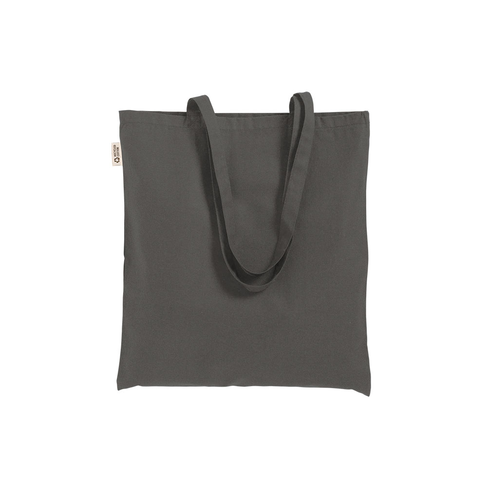 Borsa shopper a tinta unita in cotone riciclato da 220 g/m2. Dotata di manici lunghi per un comodo trasporto a mano e a spalla. È certificata GRS (Global Recycled Standard)