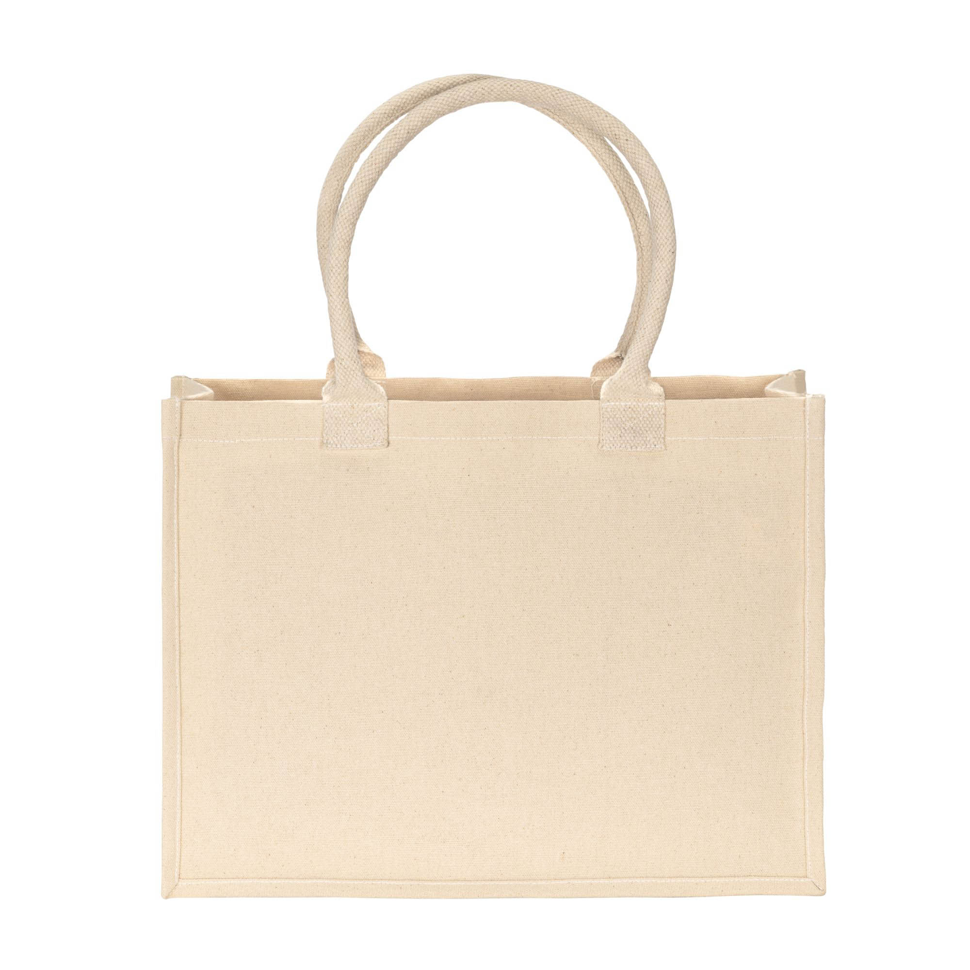 Borsa shopper in cotone laminato da 300 g/m2. Dotata di soffietto e manici lunghi per un comodo trasporto a mano e a spalla