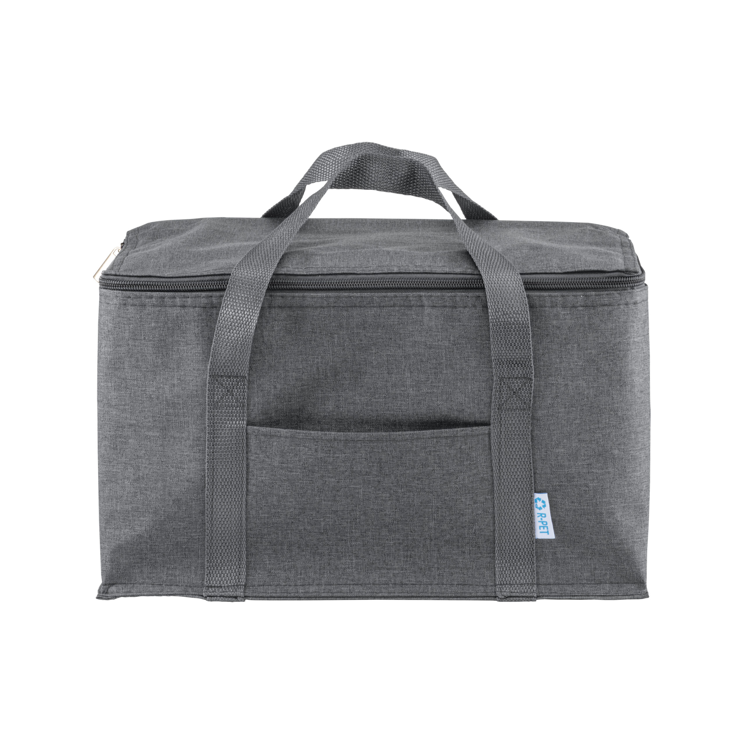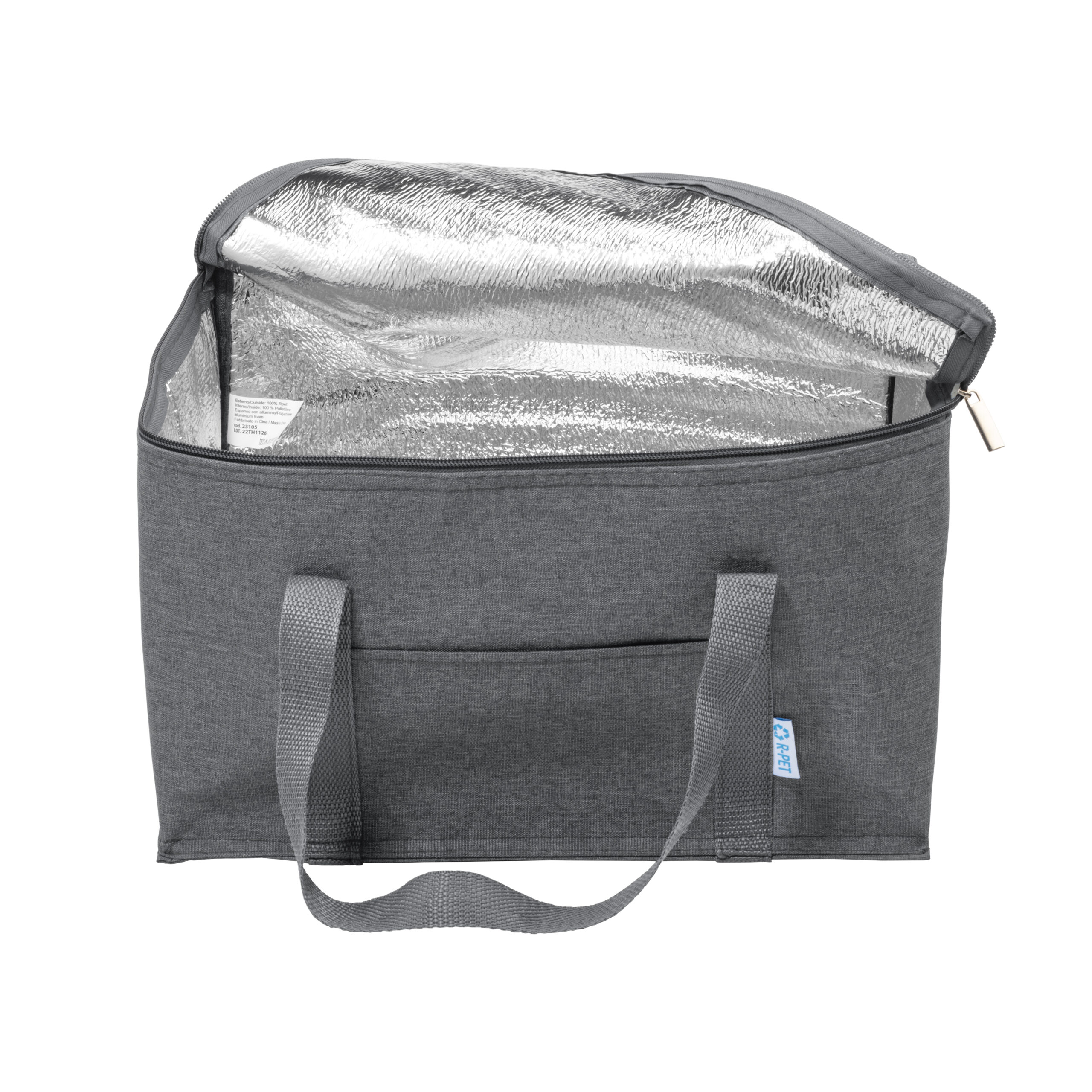 Borsa termica in r-pet melange con interno argentato e chiusura con zip e tasca frontale