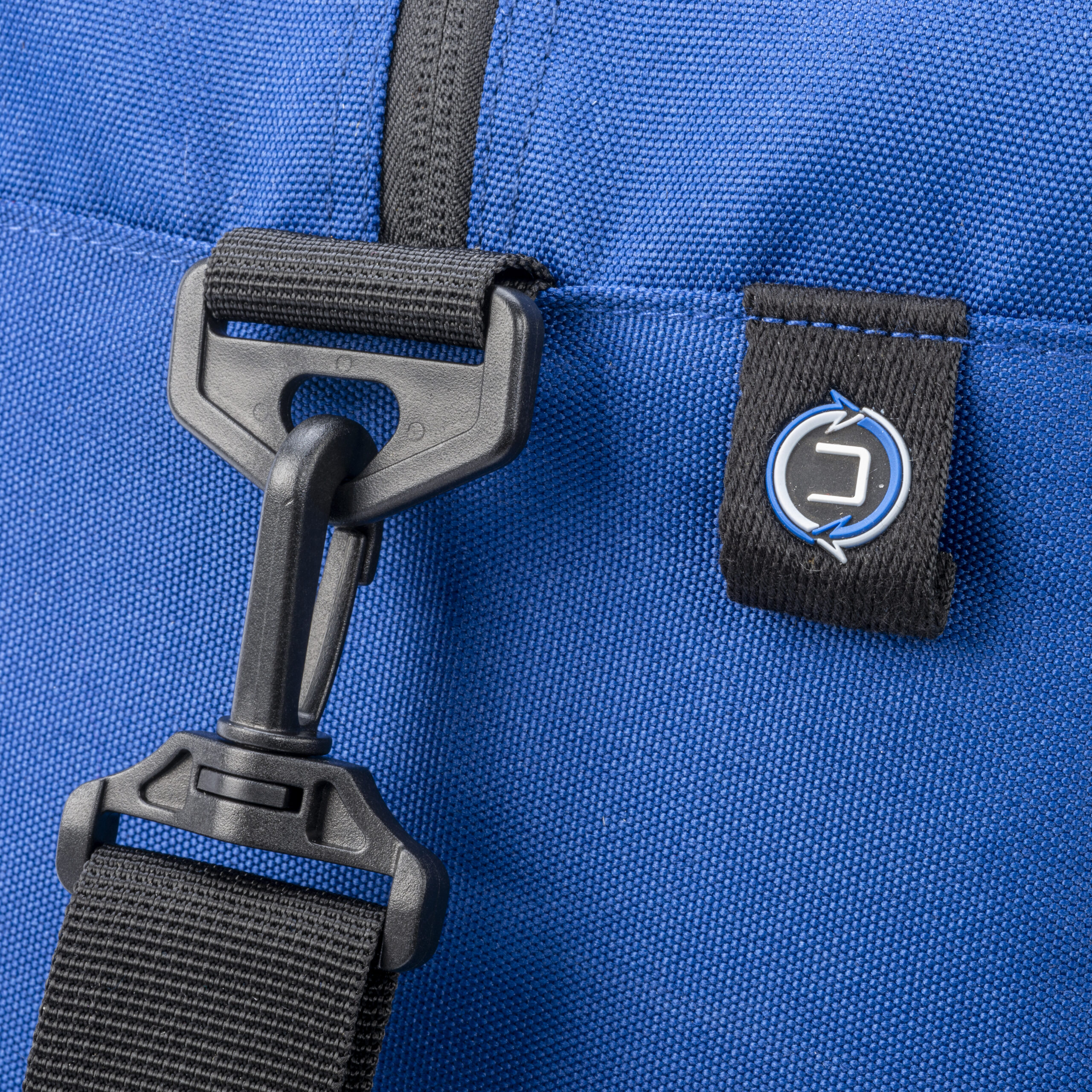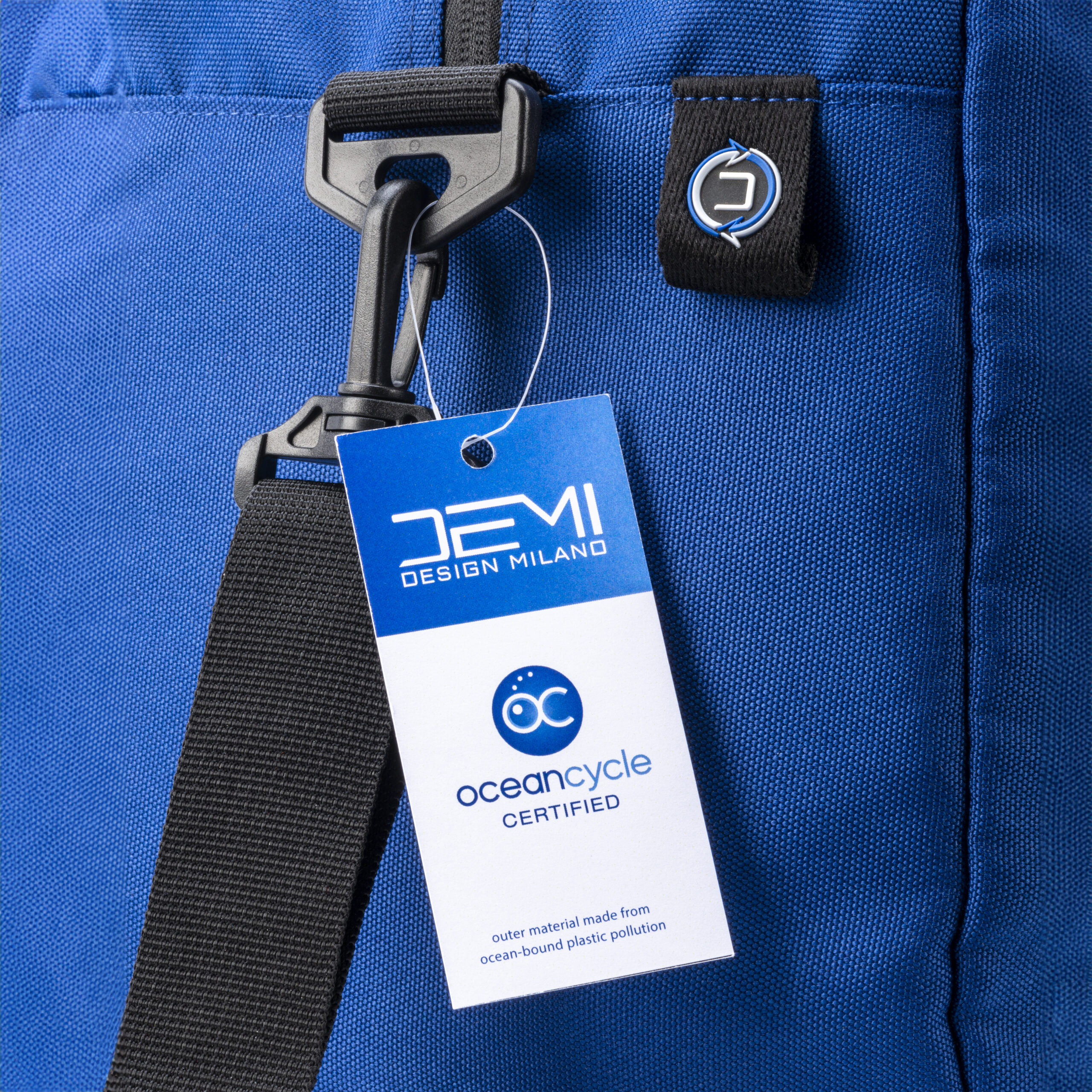 Borsone in Rpet Oceancycle. Dotato di tasca frontale con cerniera waterproof, manici lunghi e tracolla regolabile. Dispone di tasca interna con cerniera e sistema di aggancio al trolley.