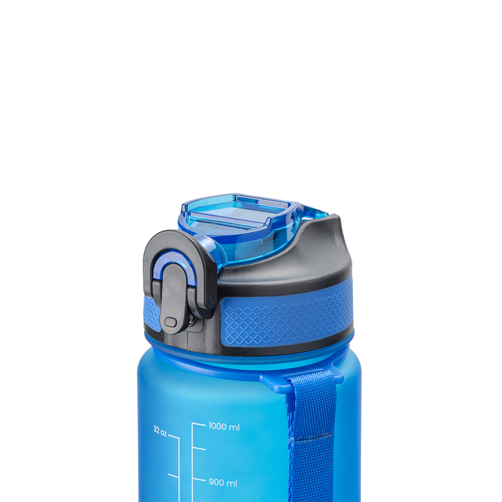 Bottiglia trasparente in PETG da 1 l. Con indicatore della quantità residua. Tappo in plastica con cannuccia rimovibile. Con cordino
