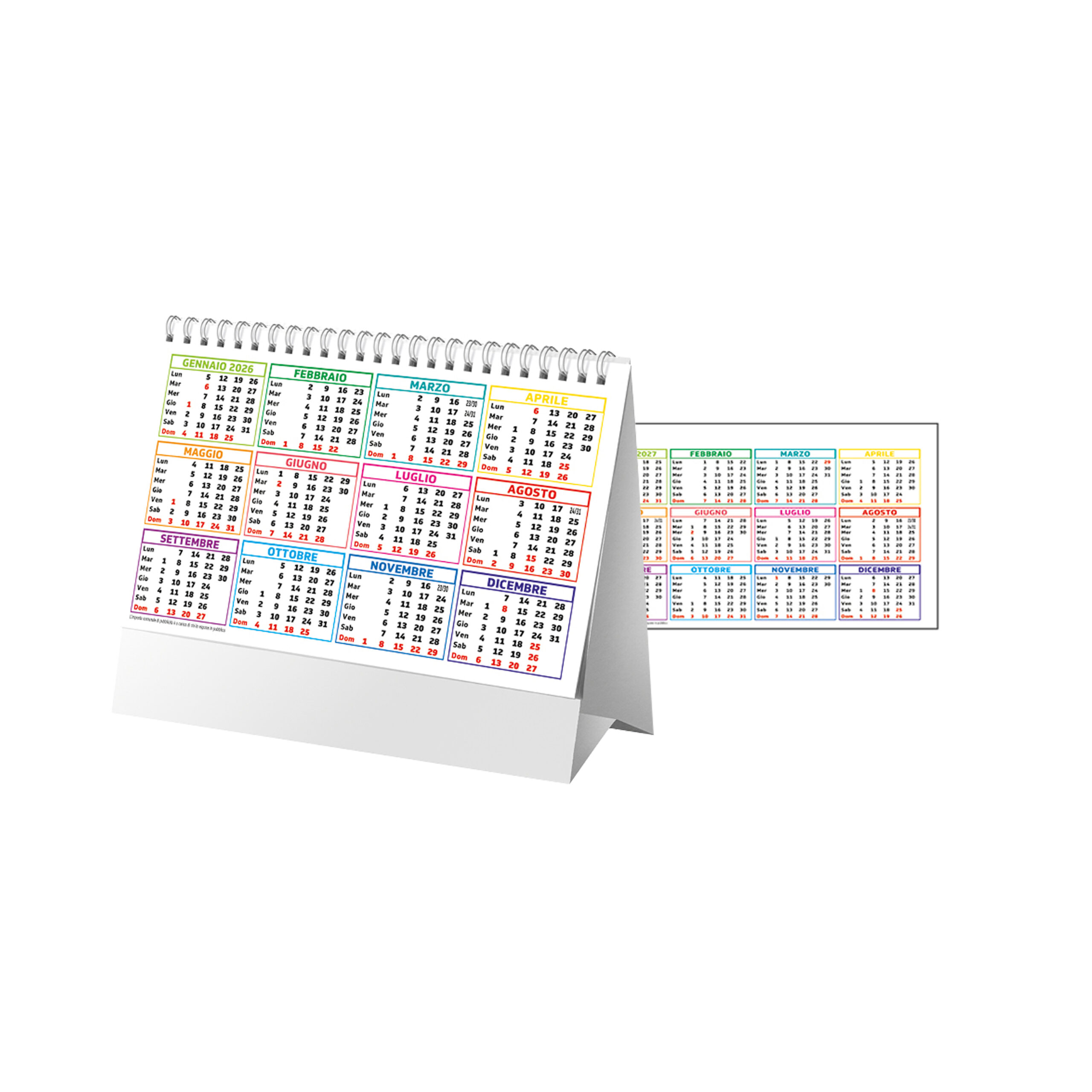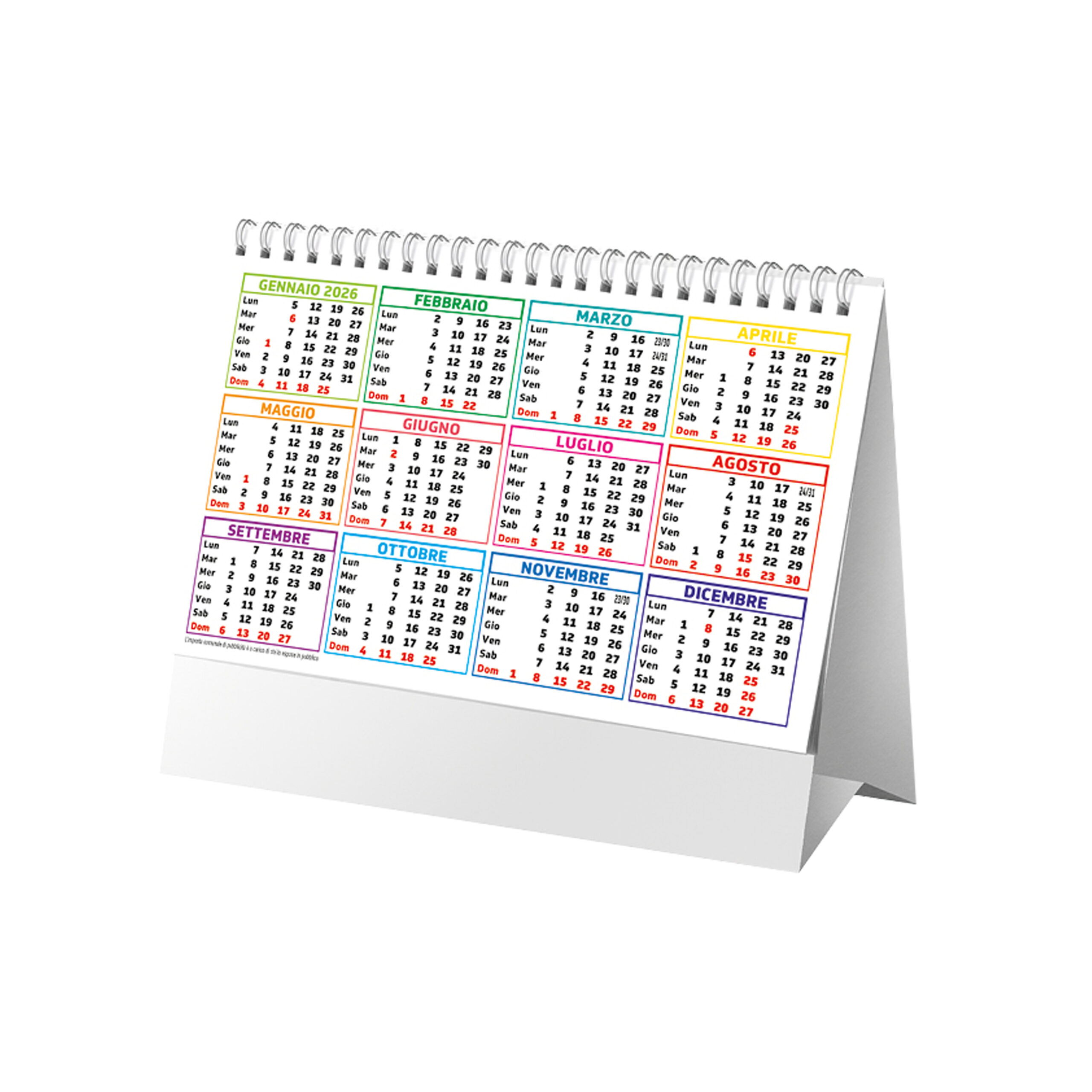 Calendario 2026 da tavolo mensile multicolore, 13 fogli su carta patinata opaca, spiralato, tabella 2027 in ultima pagina