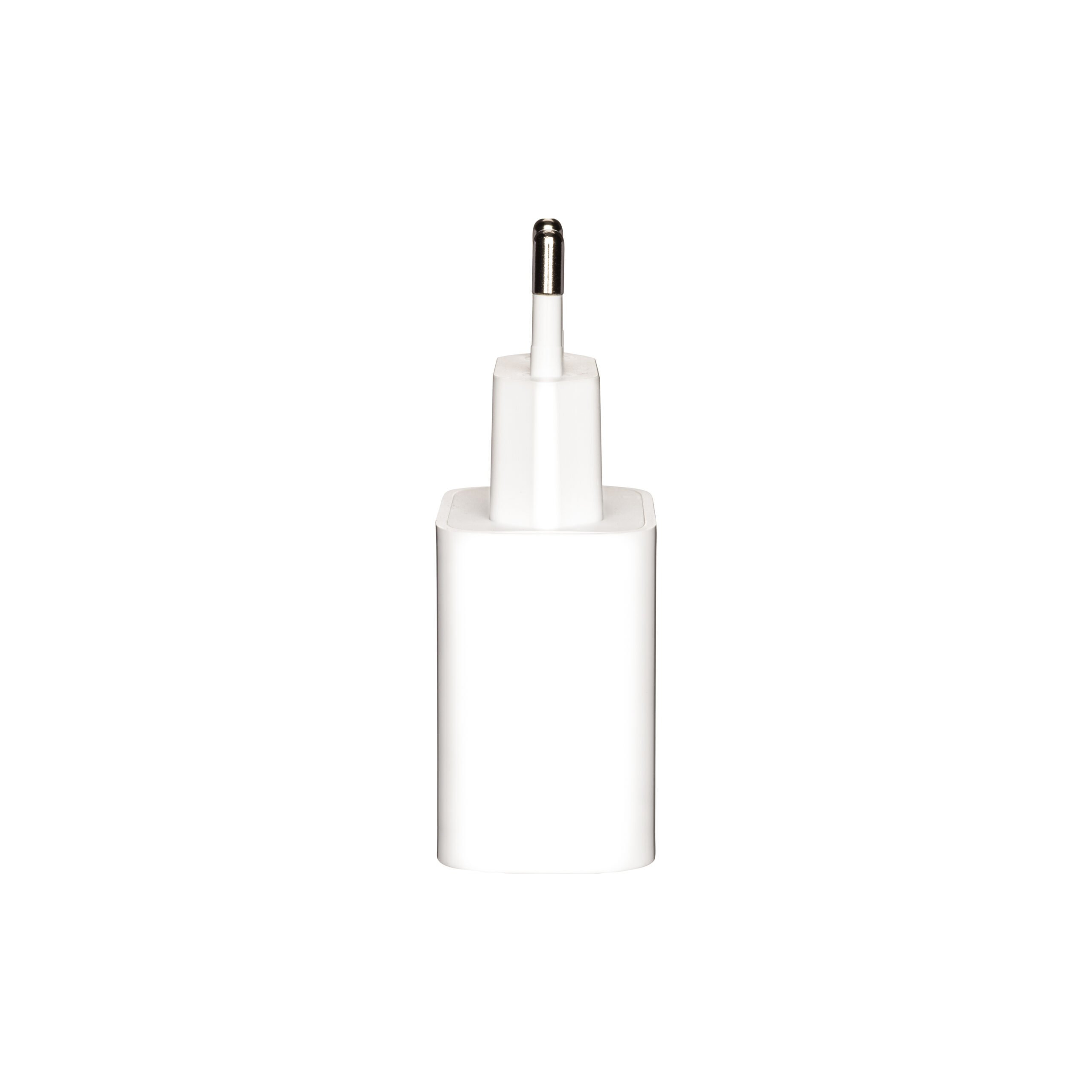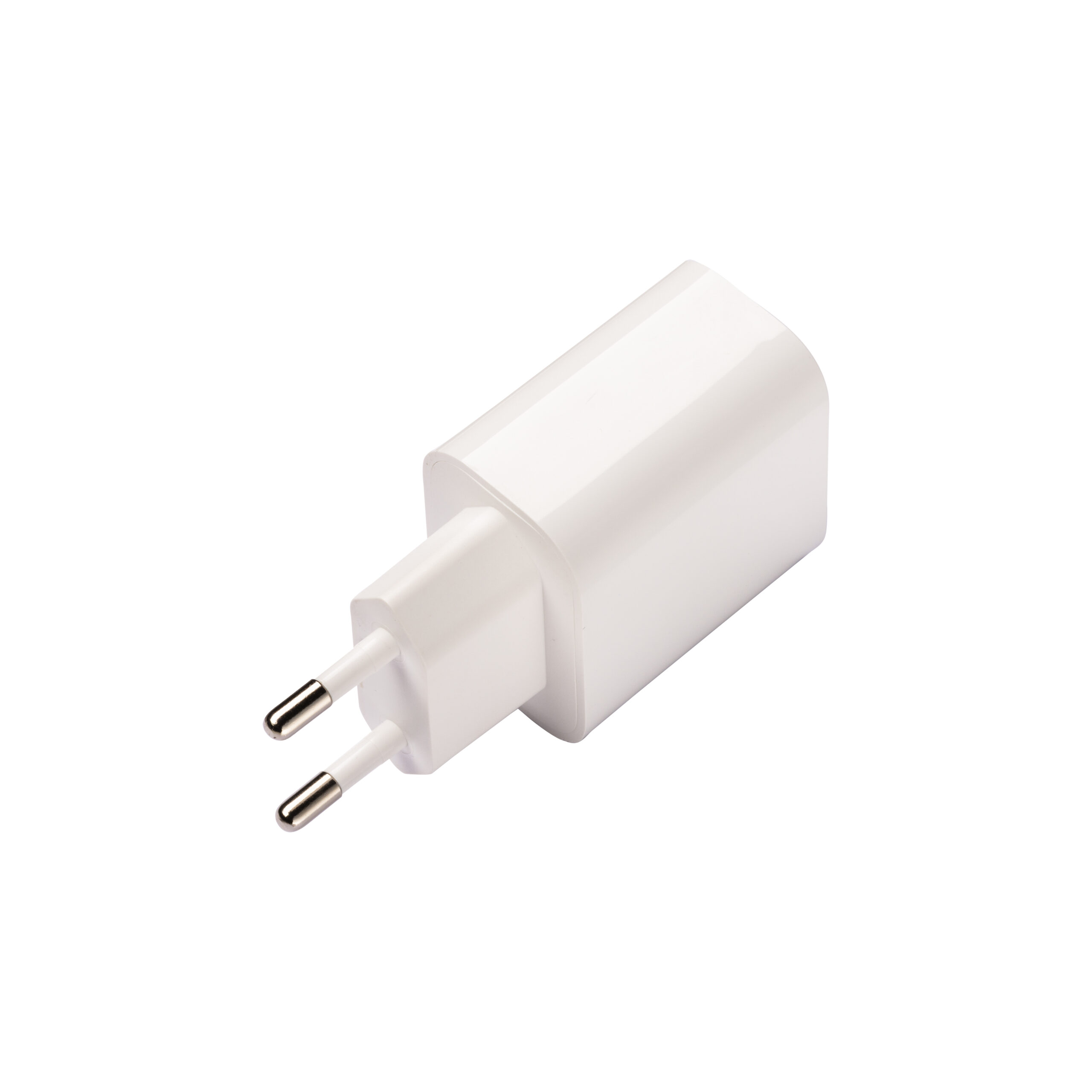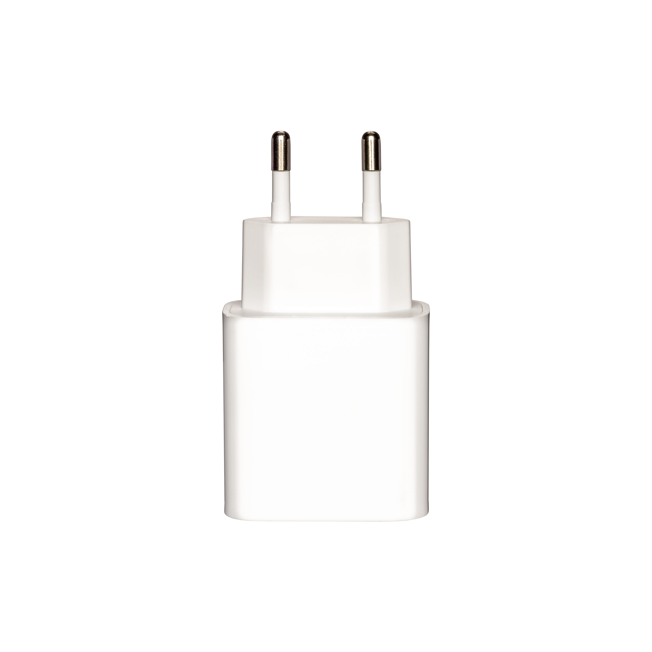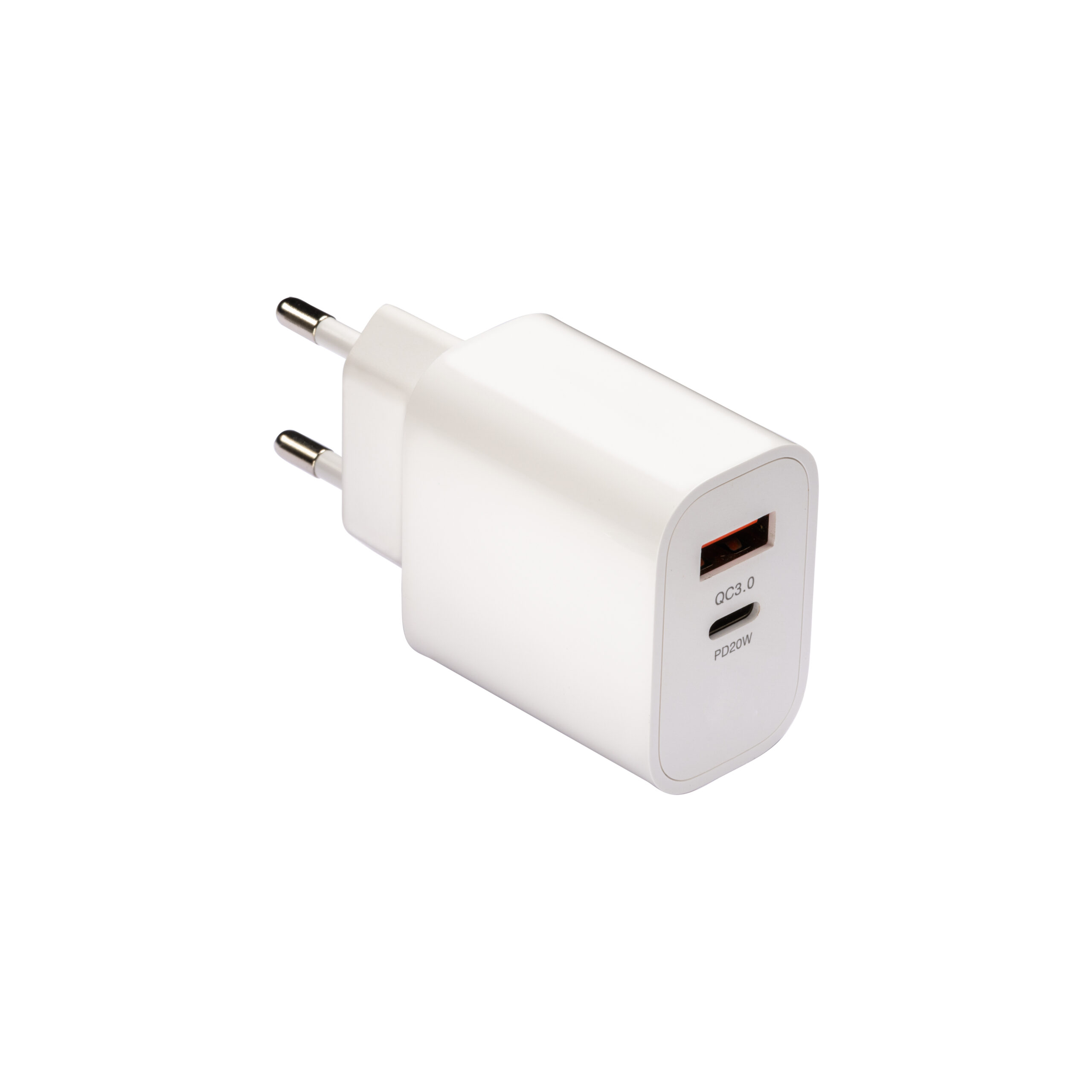 Caricabatterie USB da parete in ABS a ricarica rapida con porta USB A e porta USB-C.Con spina europea a 2 poli. Input: AC100-240V; 50/60Hz; 0.8A max. Output totale: 20W (max.) Output singola porta: USB-A:5V-3A, 9V-2A, 12V-1.5A. Type C: 5V-3A, 9V-2.22A, 12V-1.67A Output doppia porta: USB-A: 5V-1.5A Type C: 5V-1.5A