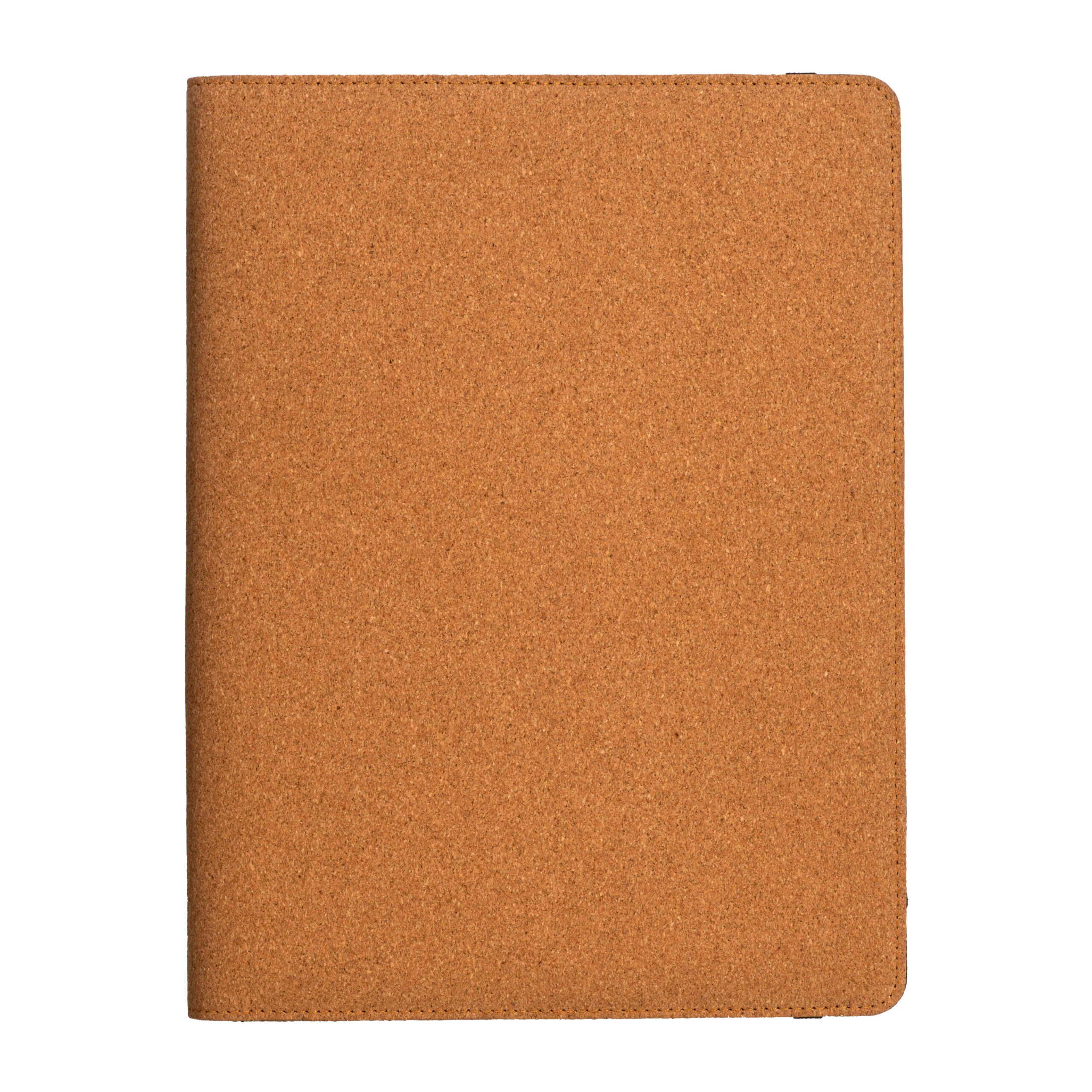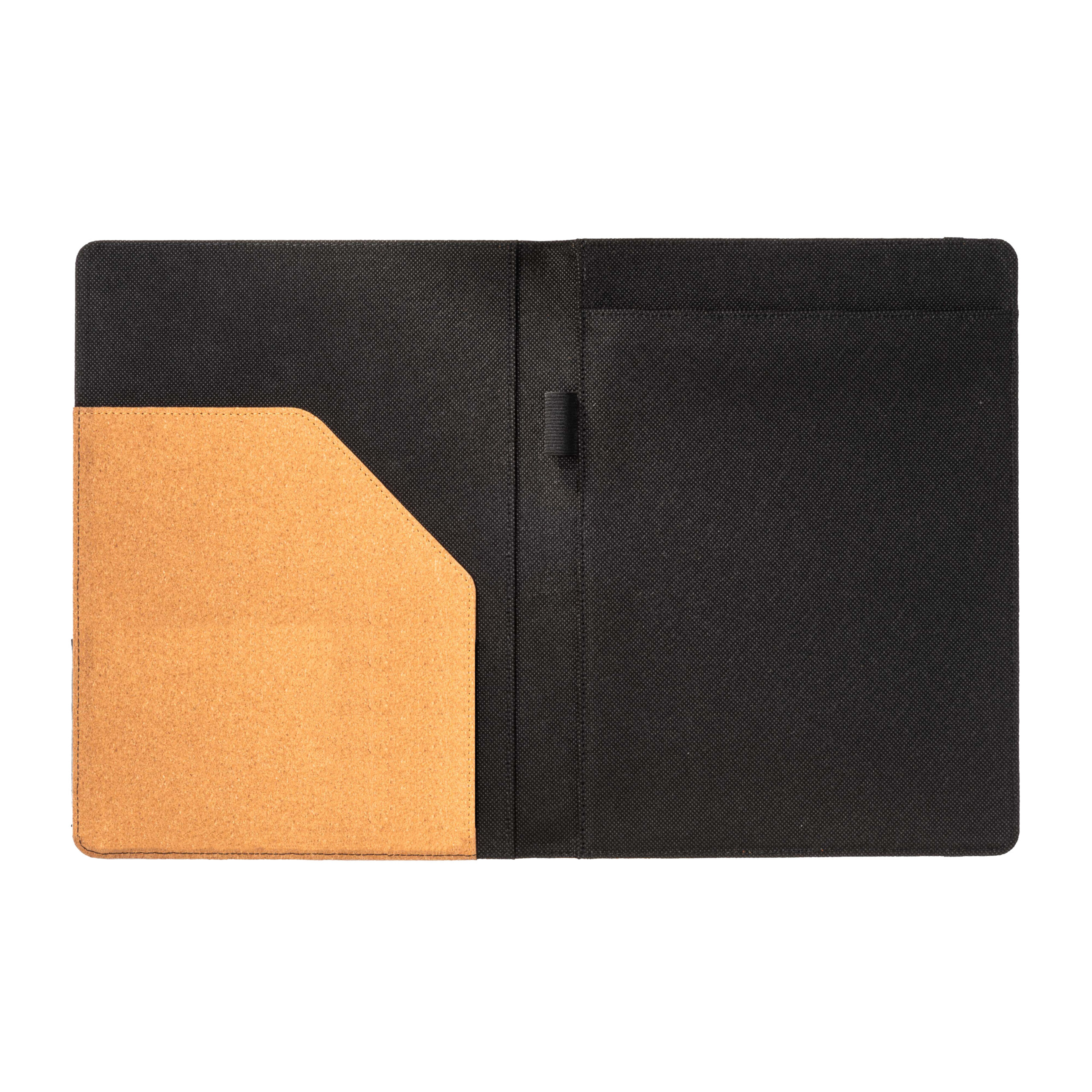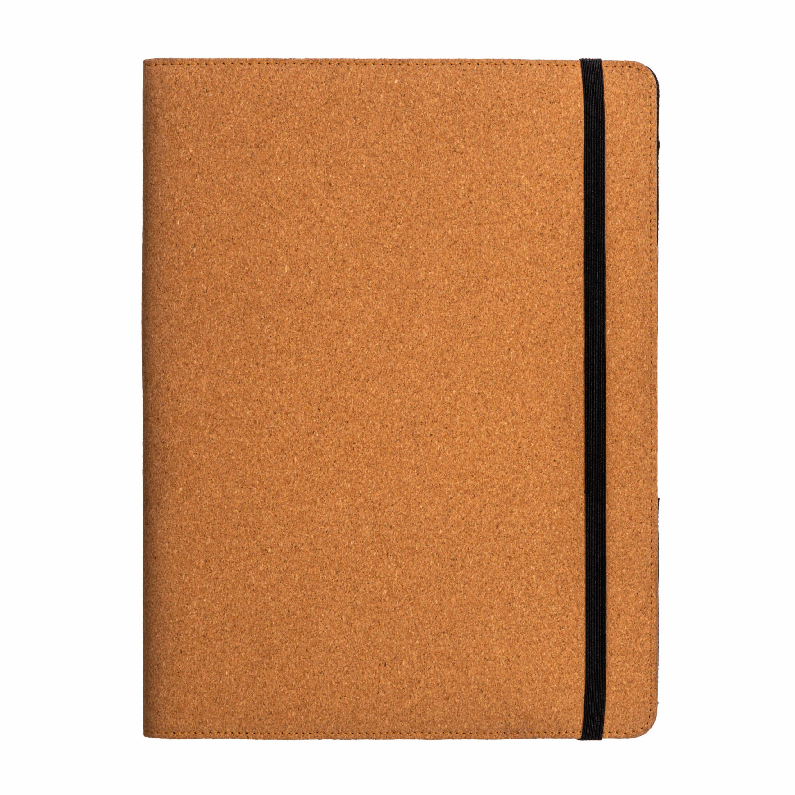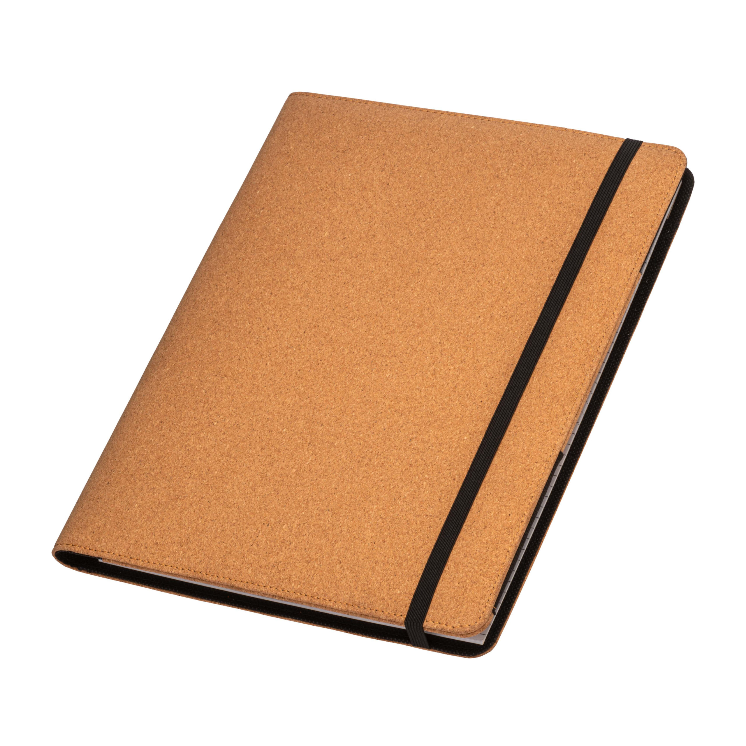 Cartella congresso e organizer in sughero A4 con elastico, blocco 20 fogli a righe, asola interna porta penna