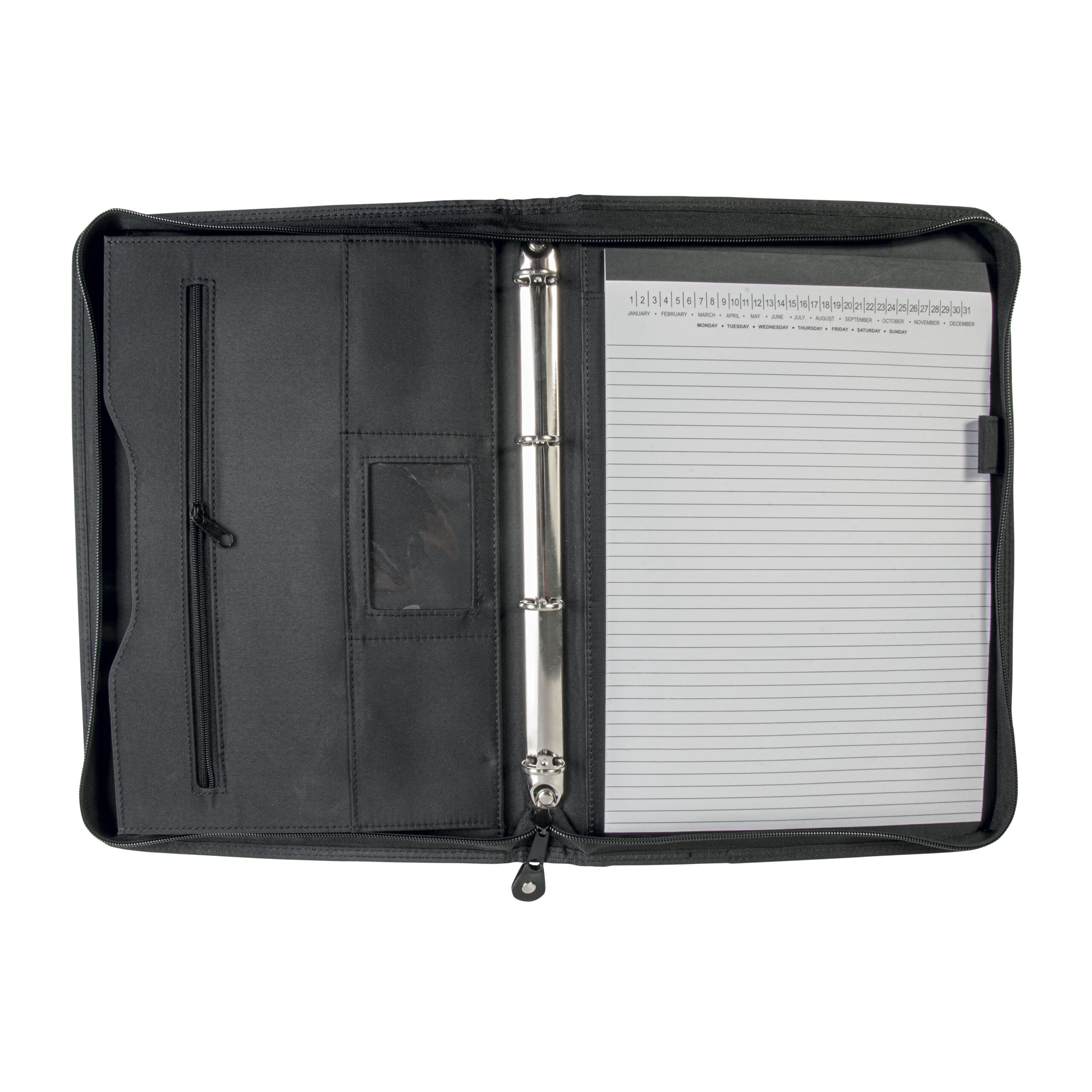Cartella porta documenti in microfibra e similpelle . Raccoglitore ad anelli. Tasche interne, blocco di 20 fogli a righe e portapenne (penna non inclusa).