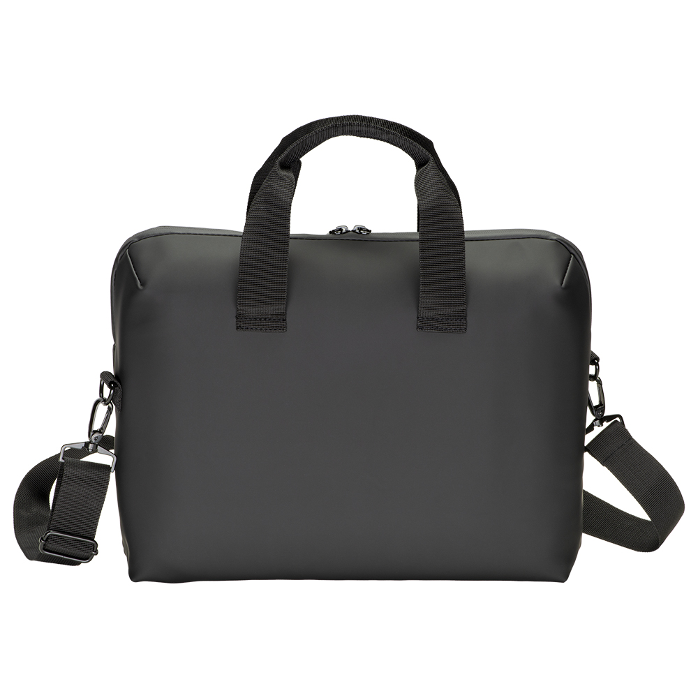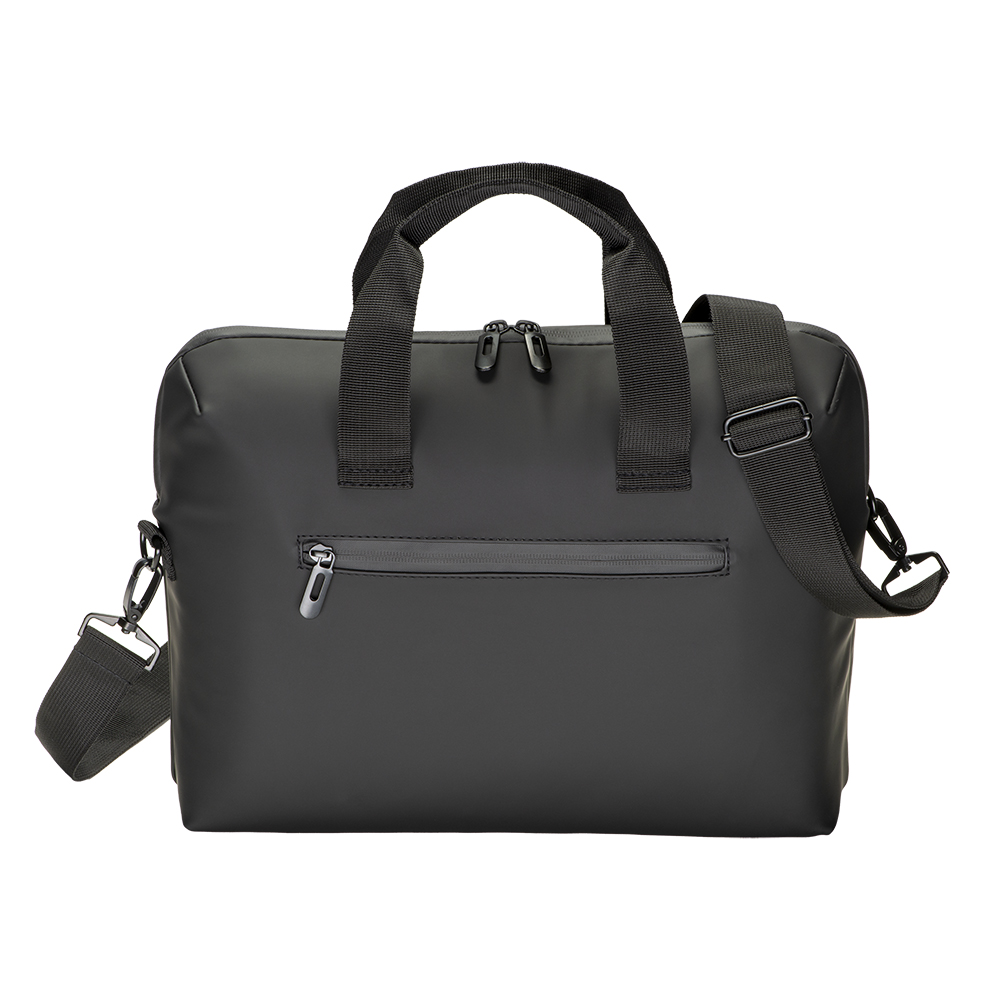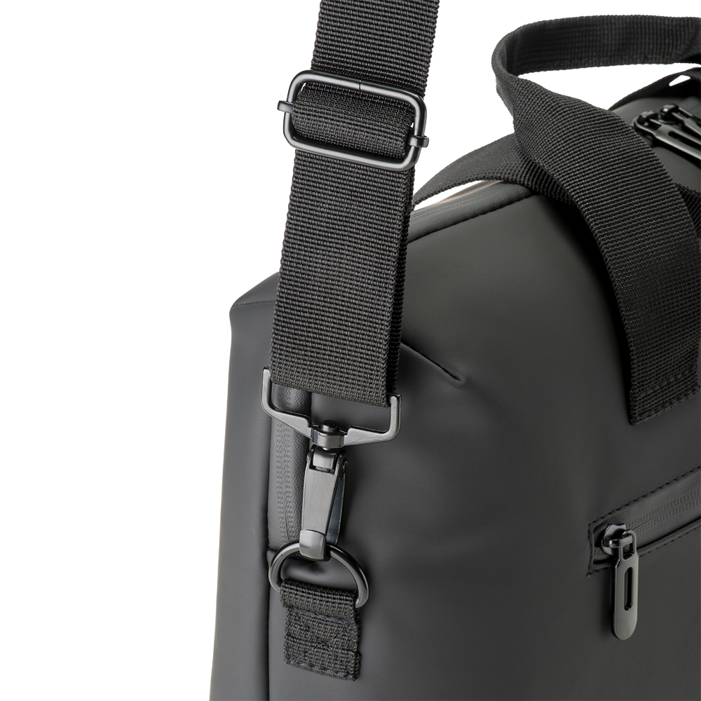Cartella porta pc (15) in soft PU water resistant. Compartimento imbottito per notebook. Una tasca frontale. Tracolla regolabile e removibile con fibbia in metallo
