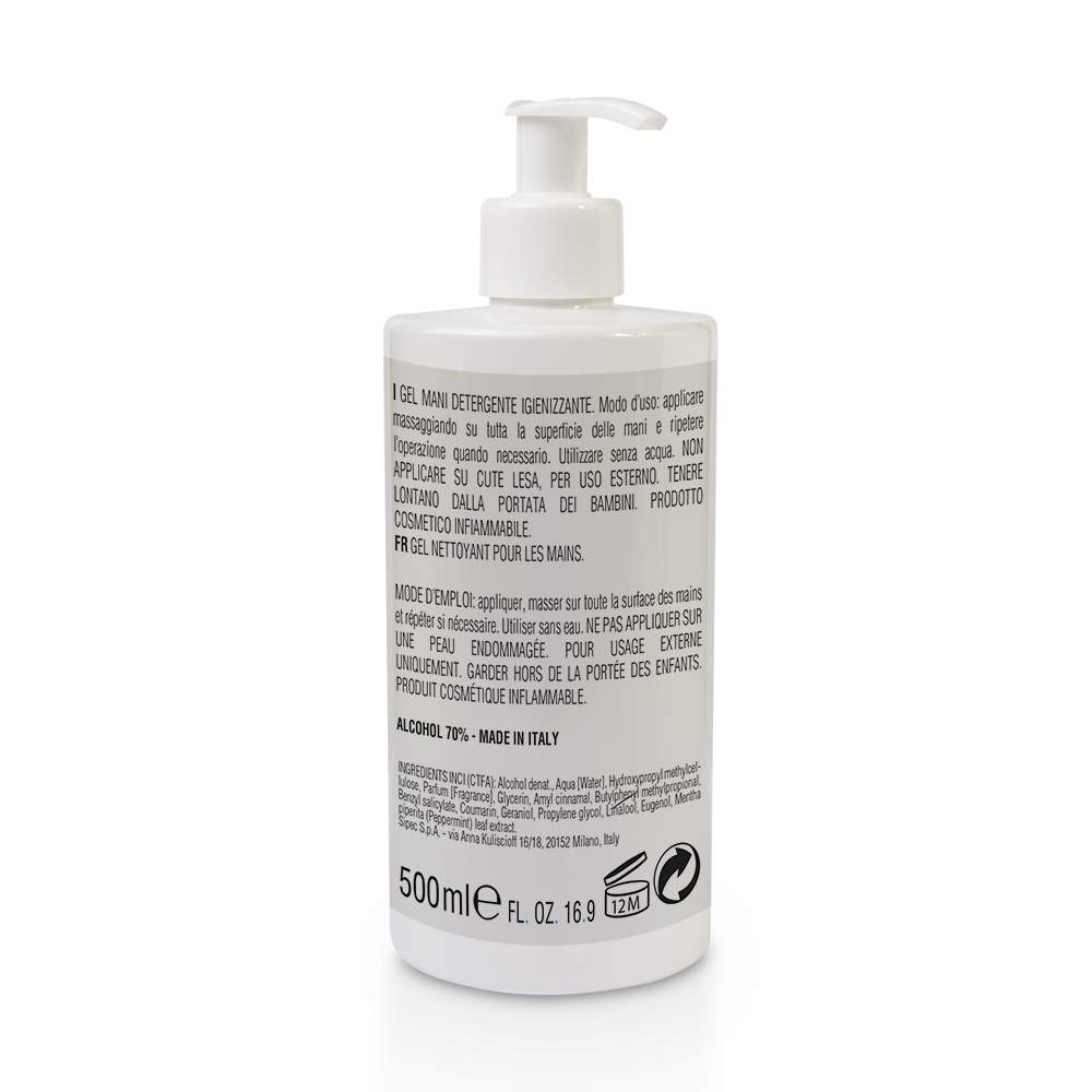 Gel detergente igienizzante mani (500 ml) con estratto di menta piperita. Made in Italy