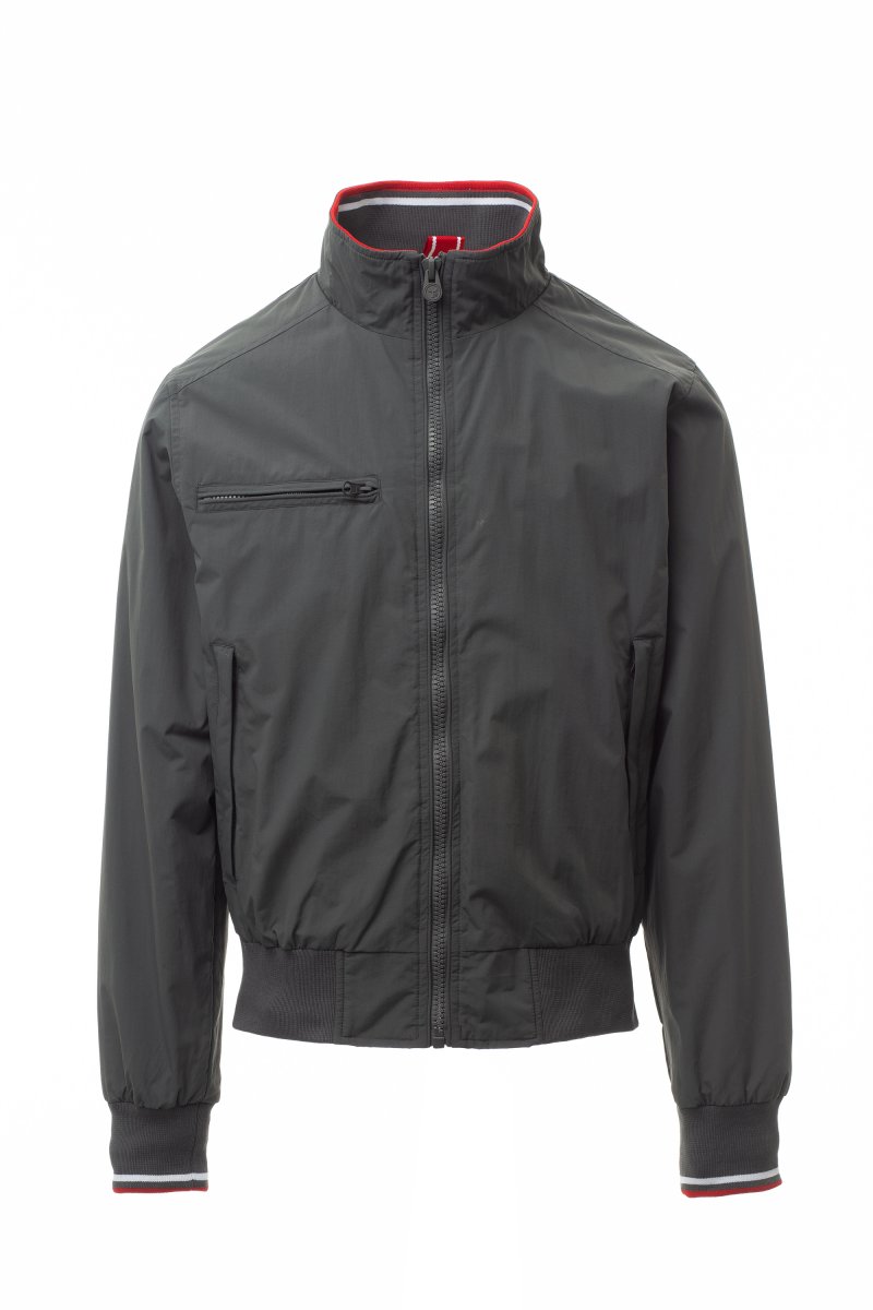 Giubbotto da uomo, zip da 8mm, in plastica con cursore in metallo, con colletto, polsini e vita in rib elasticizzato con righe, due tasche esterne con zip in plastica. Interno non imbottito, retinato, una tasca con cerniera porta smartphone con predisposizione per cavo