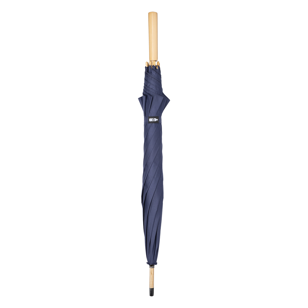 Ombrello con apertura automatica in R-PET pongee 190T. Manico dritto in legno. Fusto e puntale in legno. Struttura in metallo