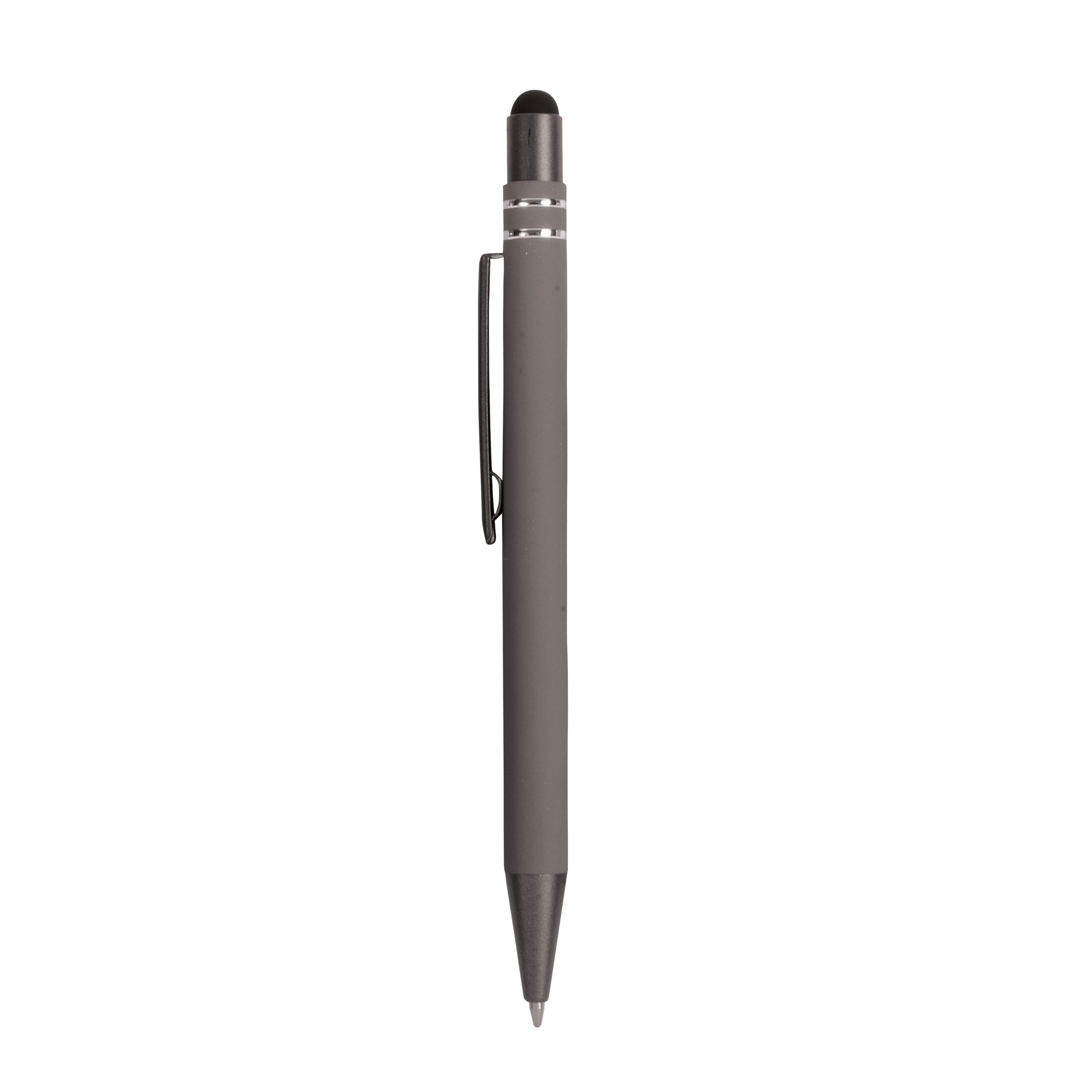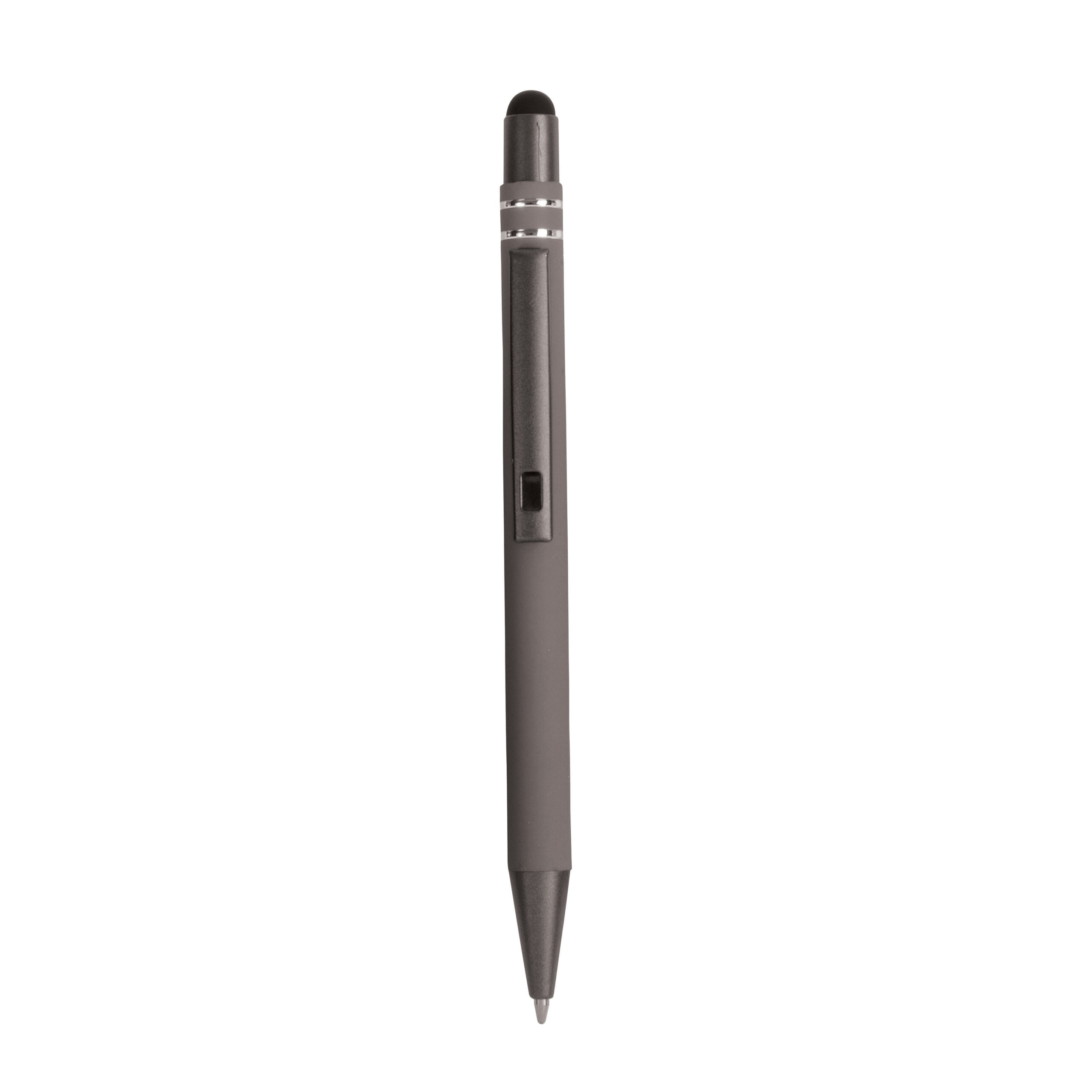 Penna a scatto in alluminio gommato con decorazione a 2 anelli e particolari bruniti con touch screen