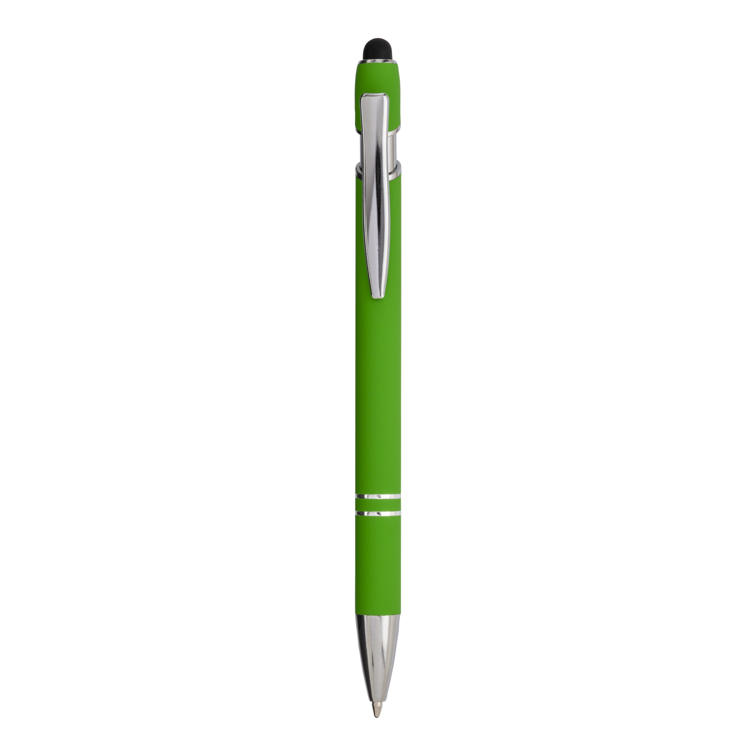 Penna a scatto in alluminio gommato con gommino per touch screen e clip in metallo