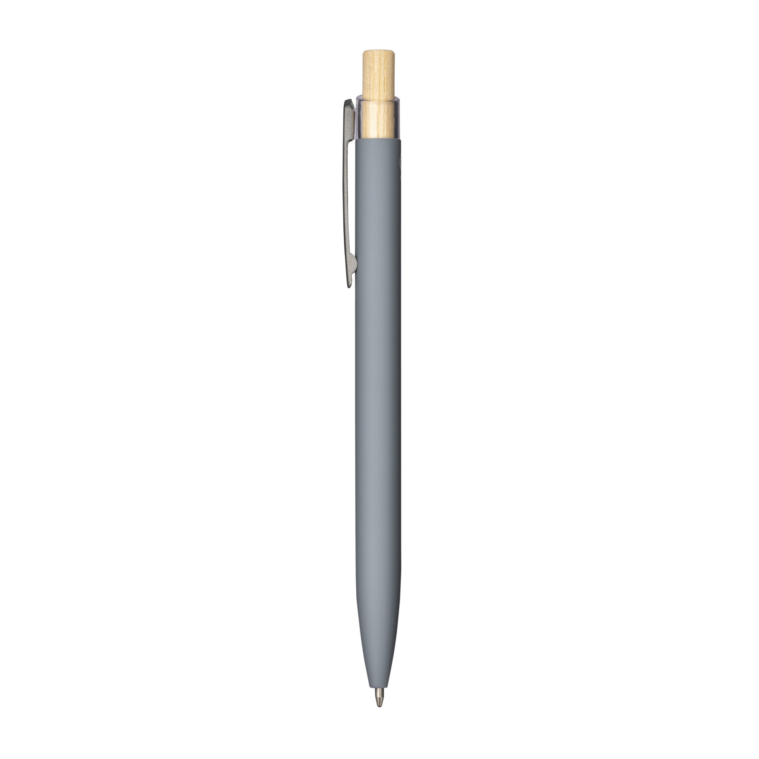 Penna a scatto in alluminio riciclato gommato. Particolari bruniti , pulsante in bambù