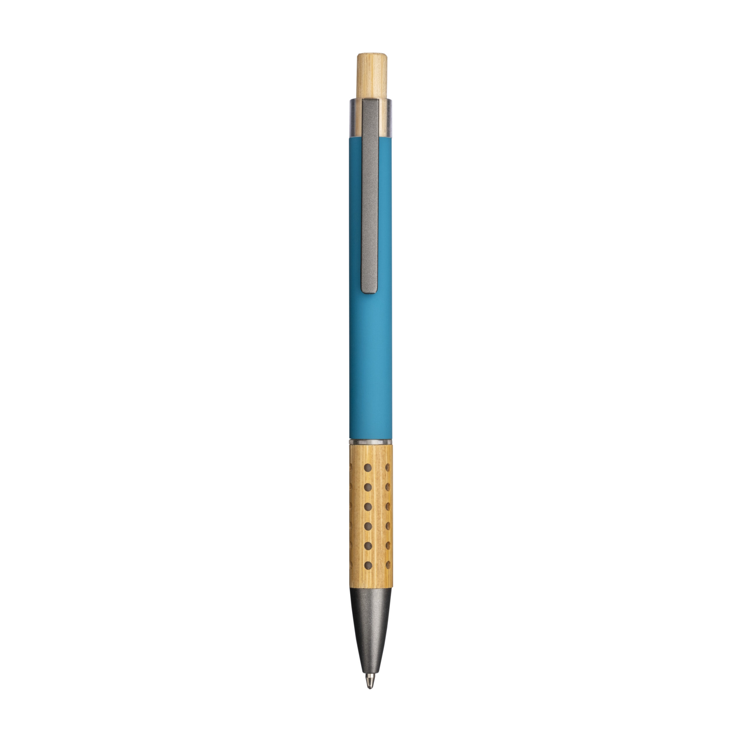 Penna a scatto in alluminio riciclato gommato. Particolari bruniti , pulsante e impugnatura in bambù
