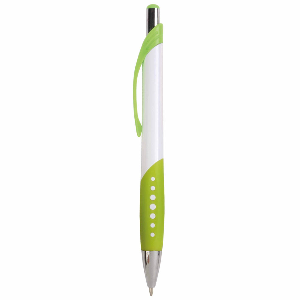 Penna a scatto in plastica con fusto bianco, impugatura gommata e colorata, in tinta con la clip e il particolare del pulsante. Punta e pulsante color cromato