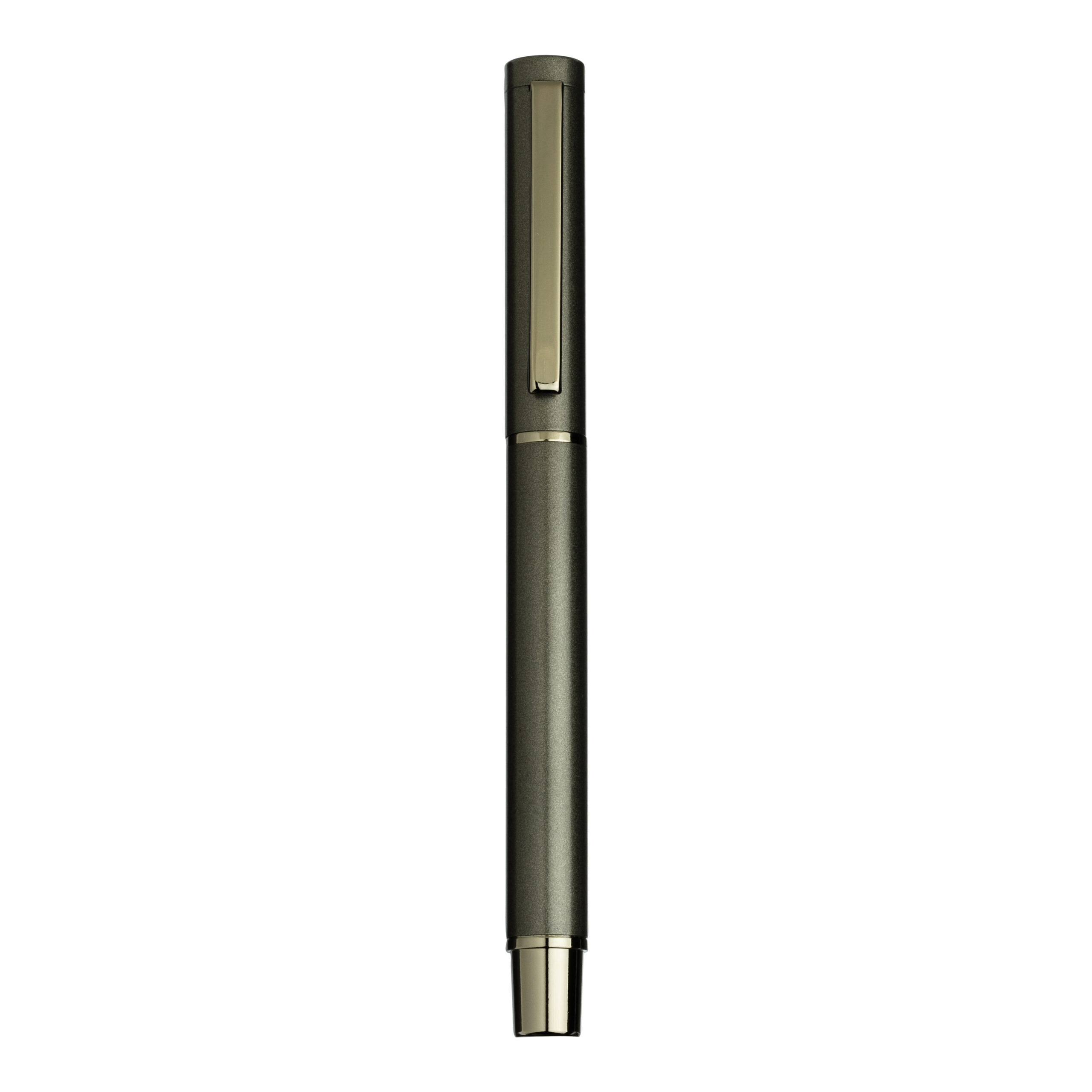 Penna a sfera in alluminio laccato metallizzato opaco. Con cappuccio e clip in metallo. Finiture in plastica placcata canna di fucile. Refill roller da 0,7 mm (nero). Confezionata in scatola singola in cartoncino con logo DEMI