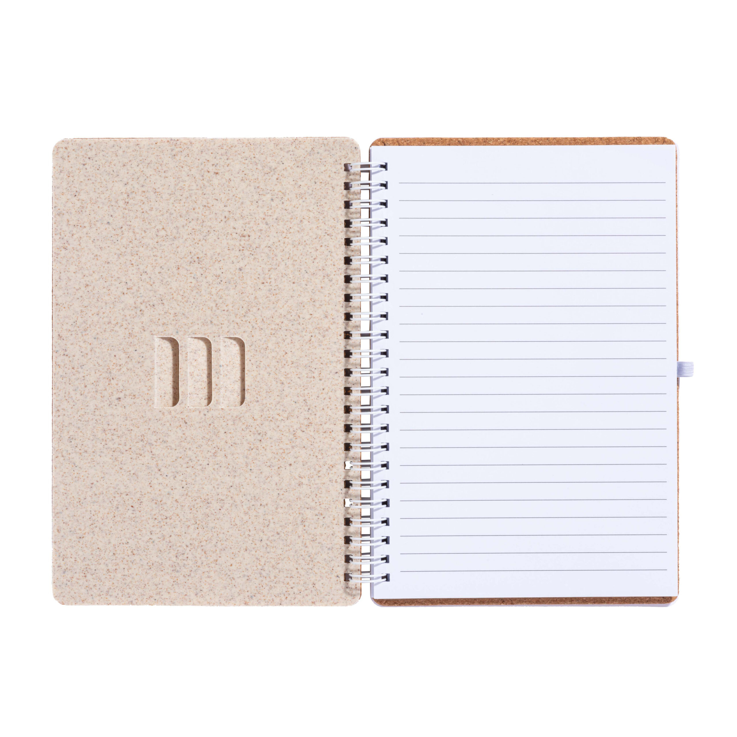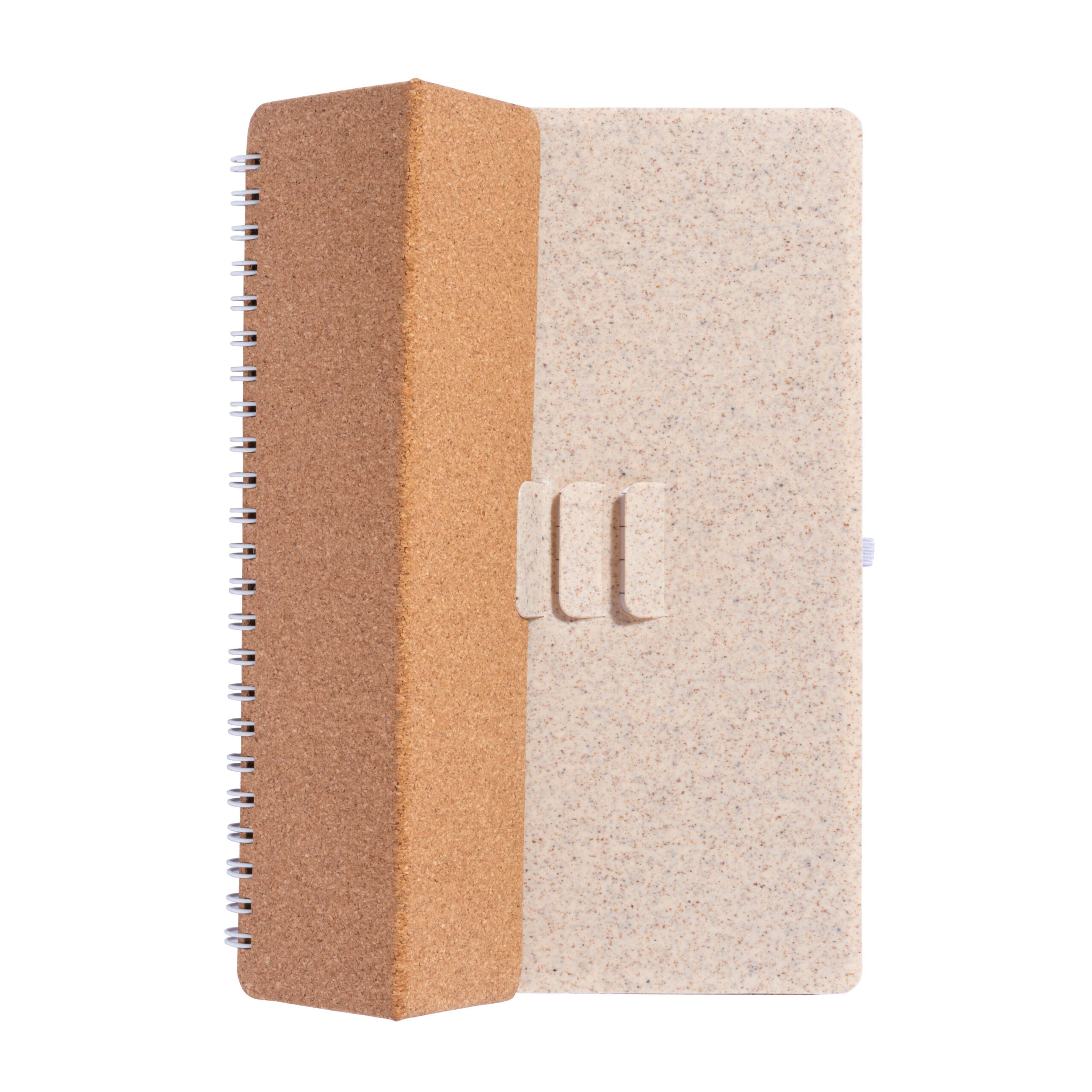 Quaderno ad anelli in sughero trasformabile in stand portacellulare, pagina interna di supporto in PP e paglia di grano, fogli a righe 70pag., con asola porta penna laterale (penna non inclusa)