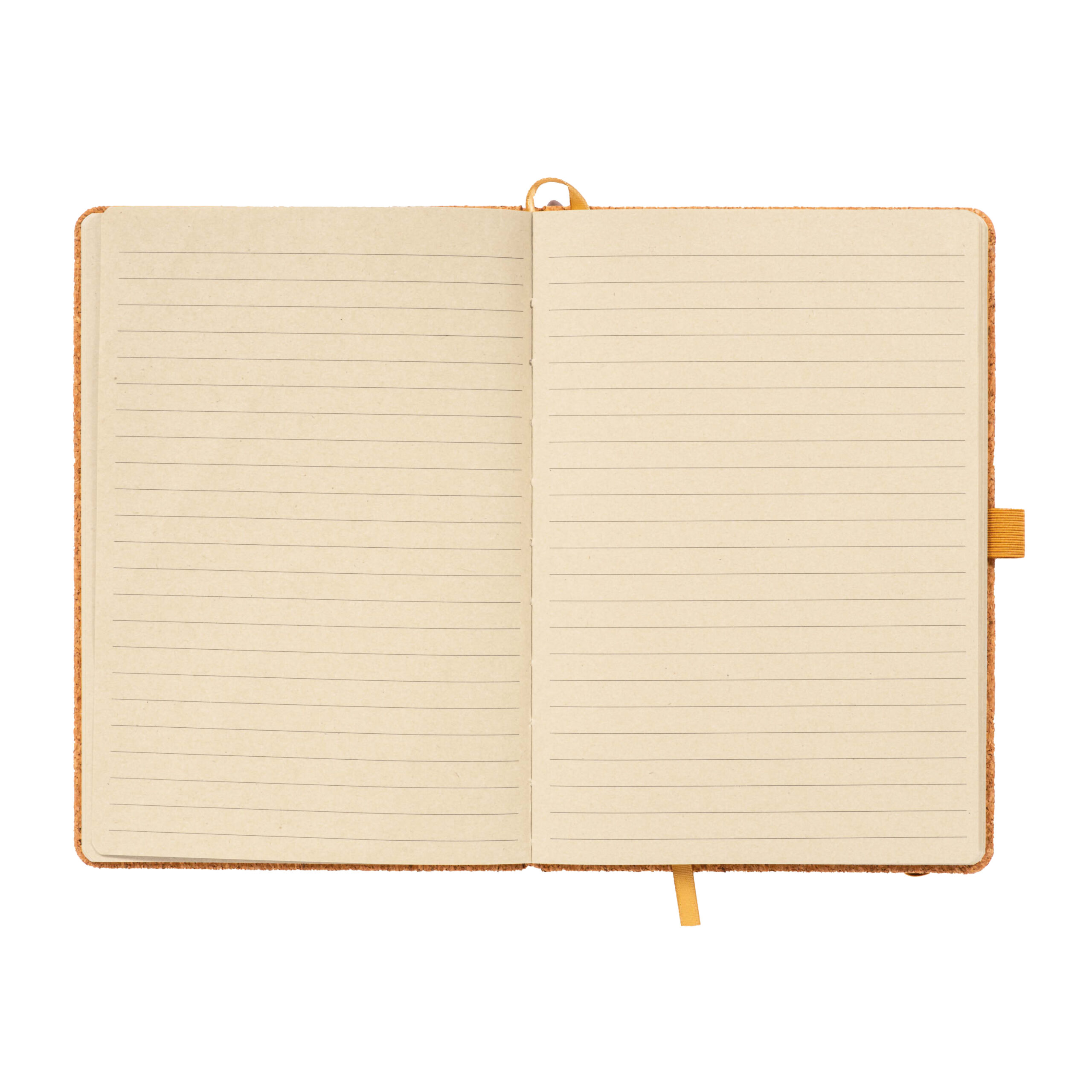 Quaderno in sughero, fogli a righe 80 pag. da 70 gr. in color avorio, carta riciclata, chiusura con elastico e anello portapenna.