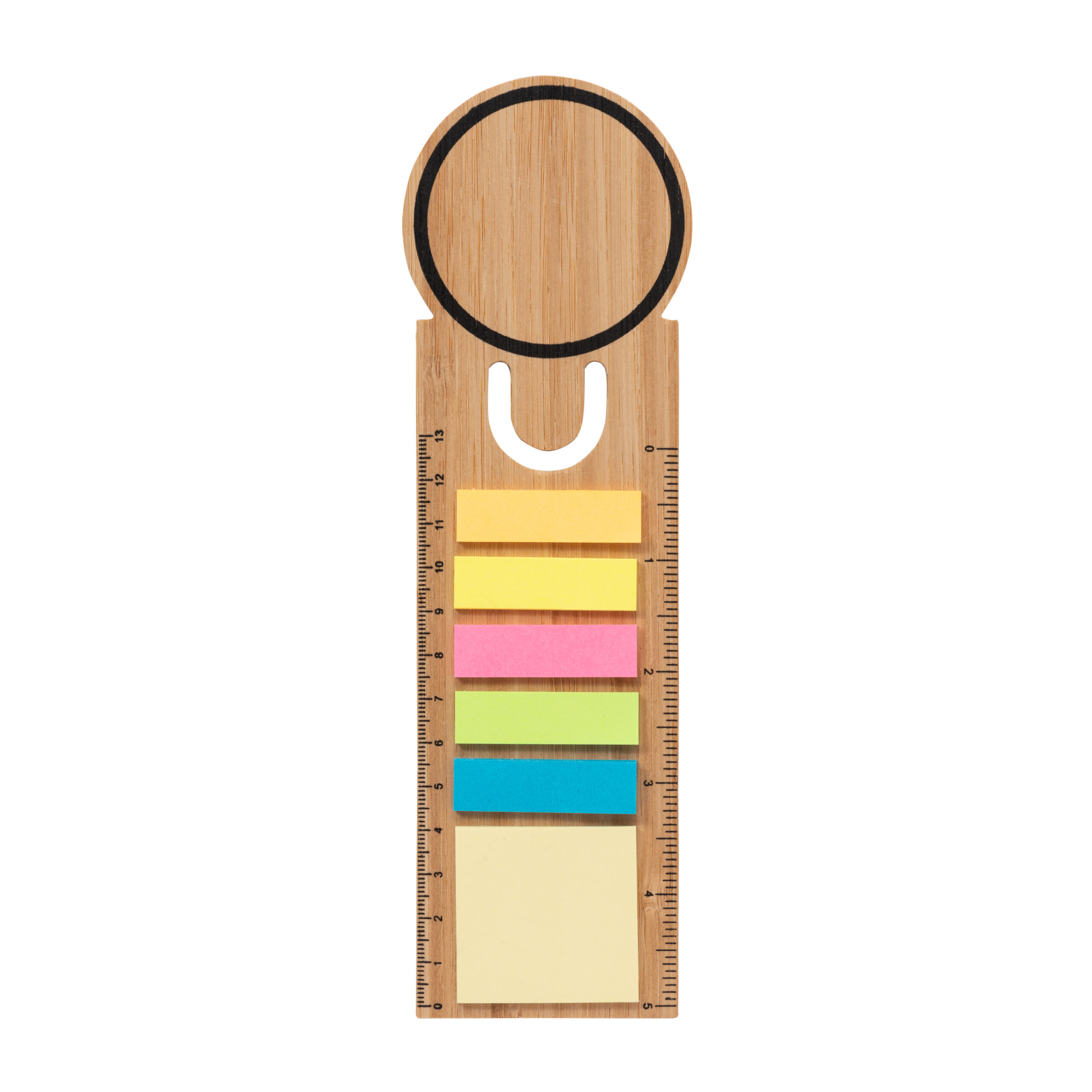 Righello segnalibro in bambù. Include 25 post-it medi e 125 post-it mini. Sistema metrico in centimetri e pollici