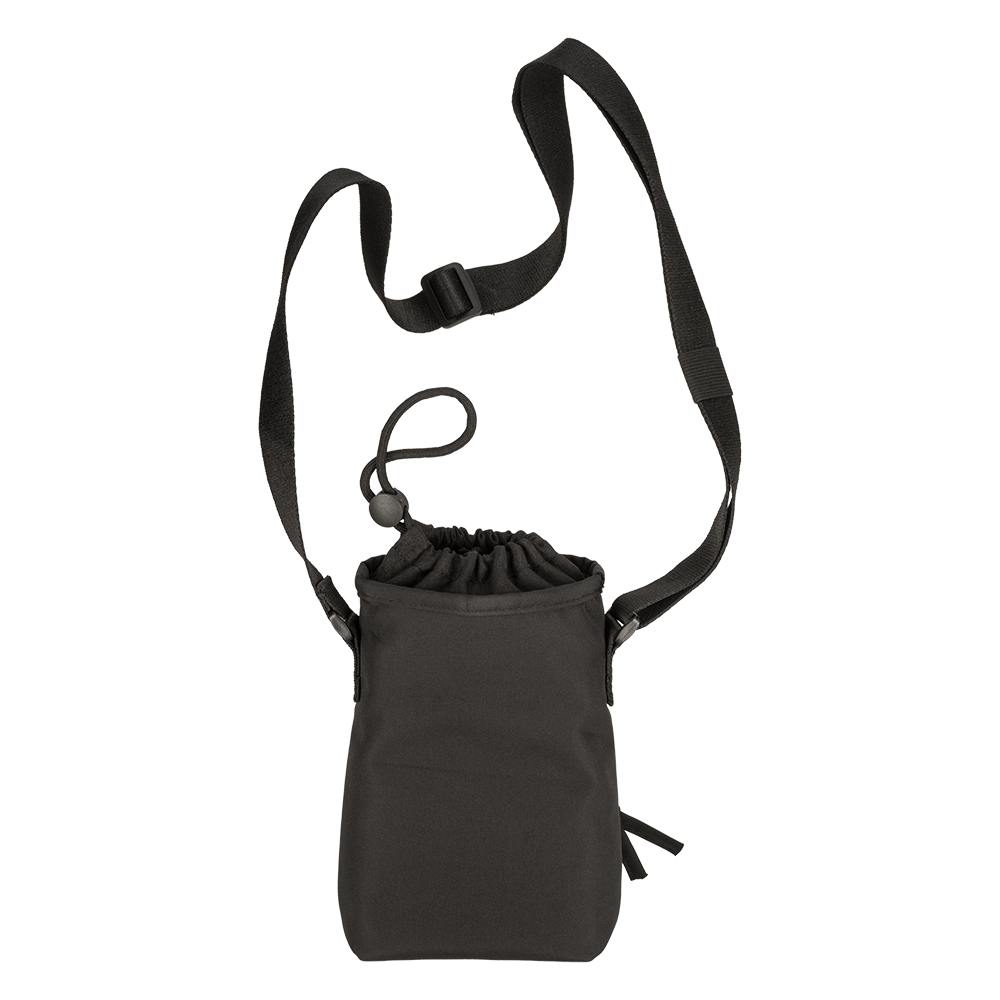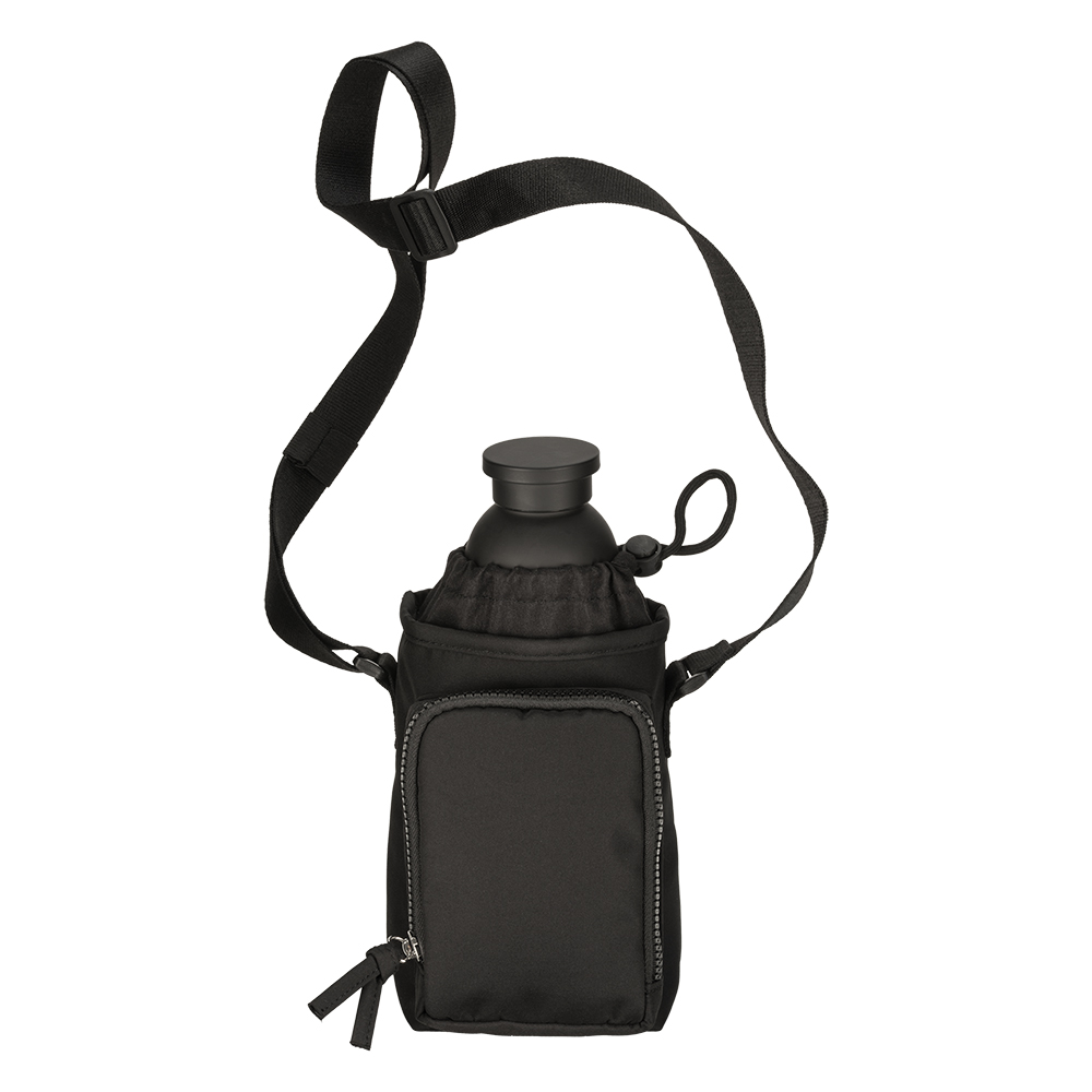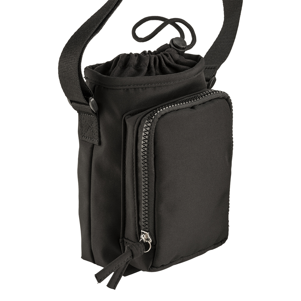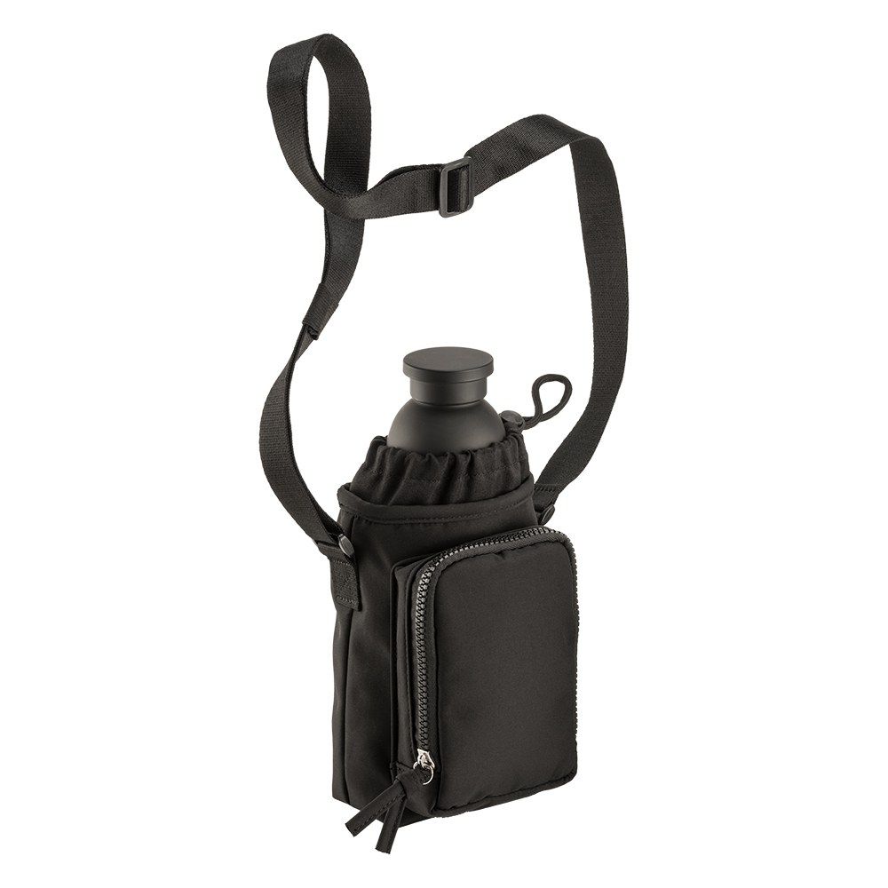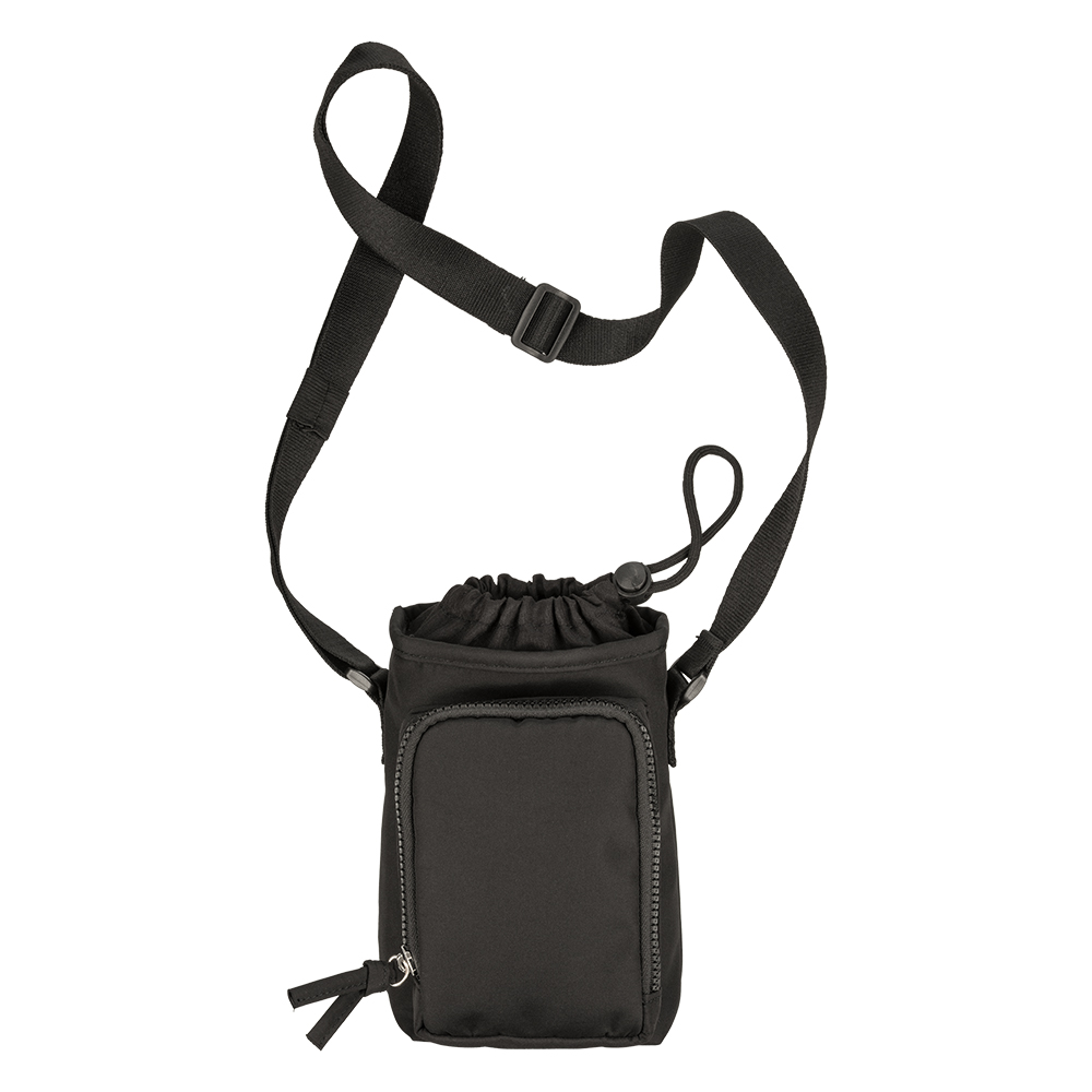 Sacca porta borraccia in poliestere 410T. Chiusura superiore a coulisse e tasca frontale con zip. Con tracolla