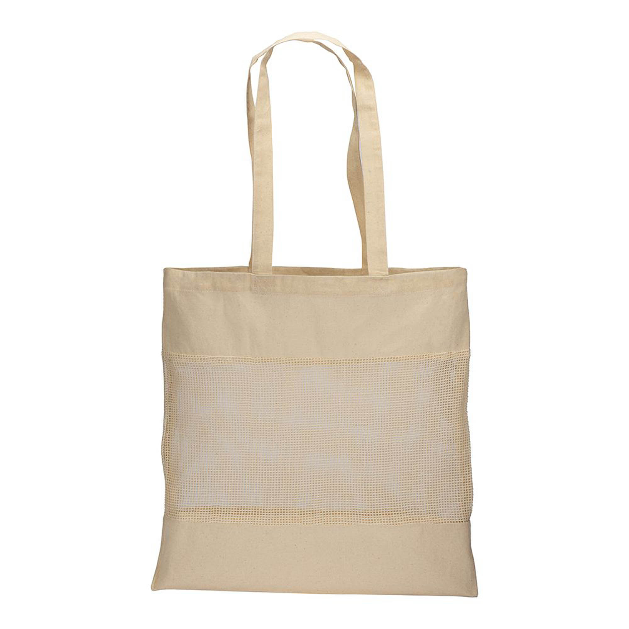 Shopper in cotone naturale da 135 g/m2 con rete sulla parte centrale, manici lunghi da 70 cm. Altezza rete fronte e retro della shopper 22 cm