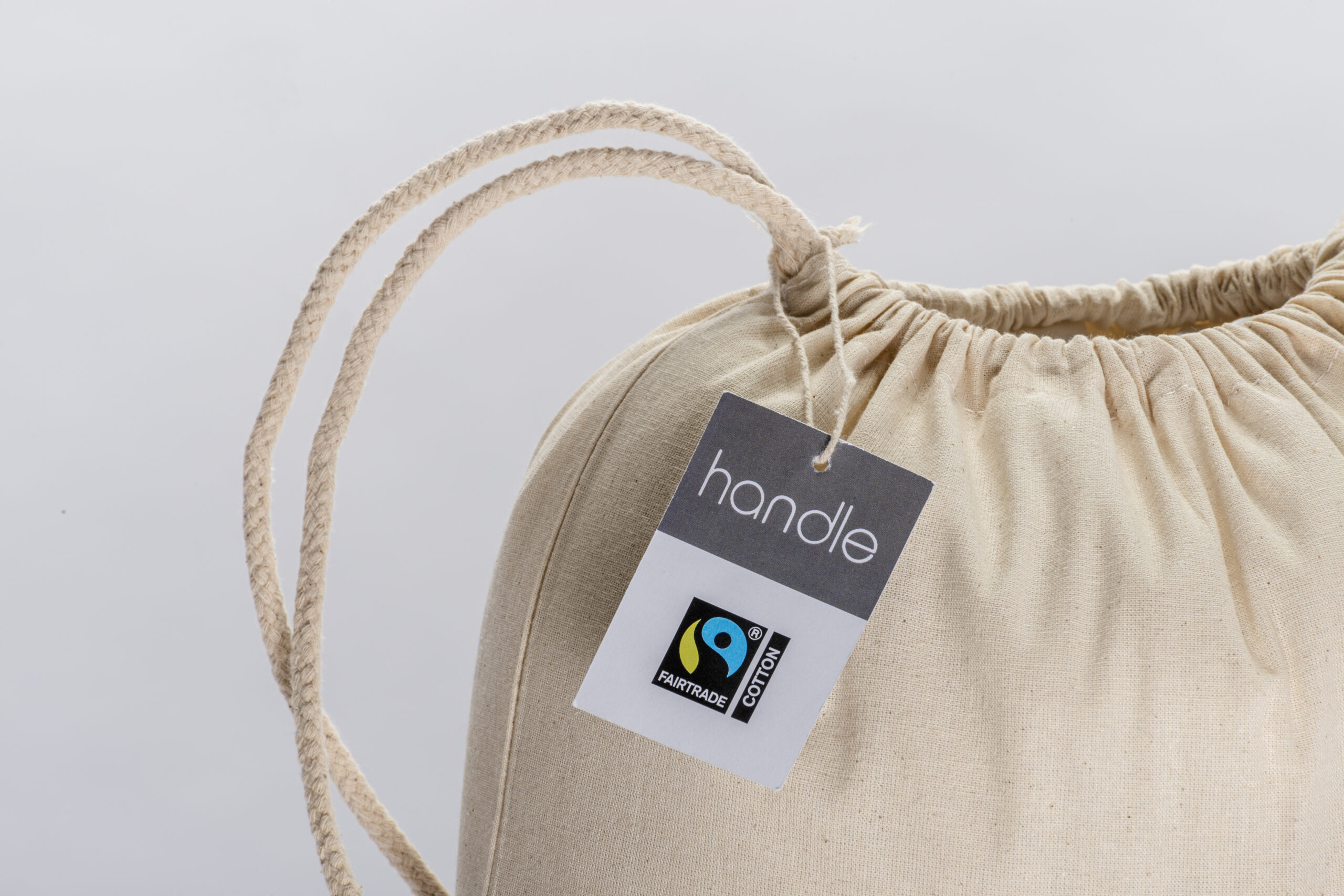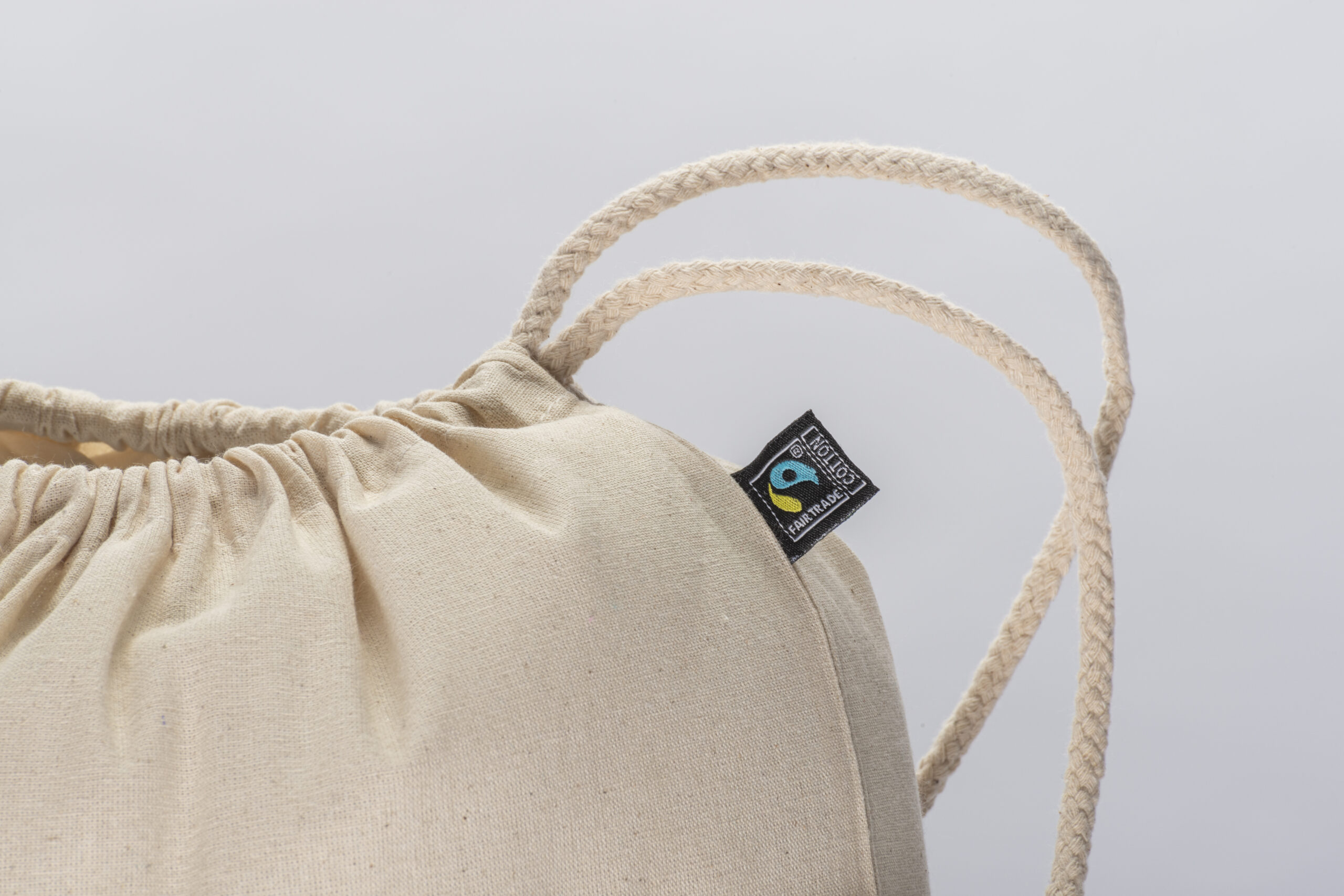 Zainetto in cotone FAIRTRADE ® 140 g/m2 con chiusura a strozzo