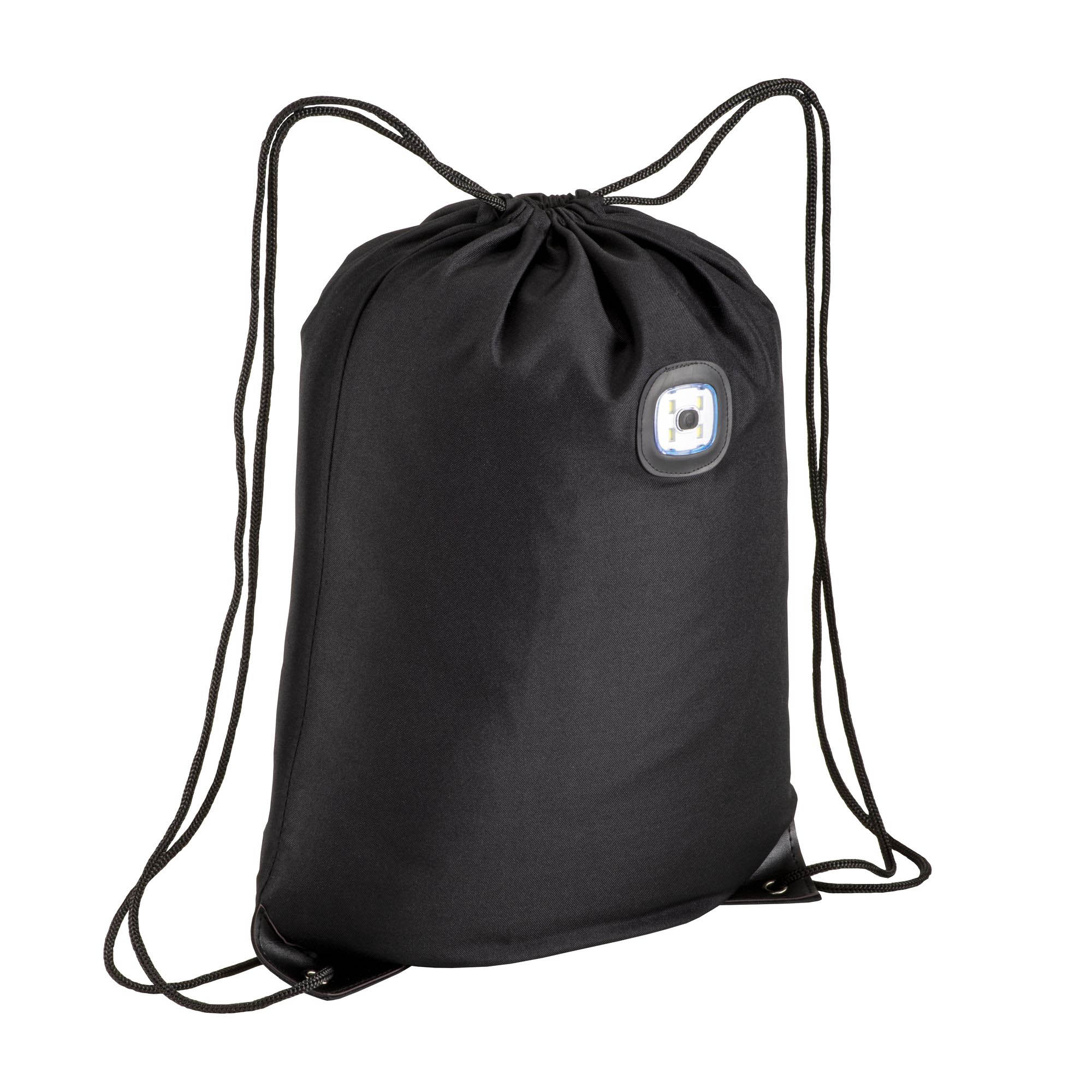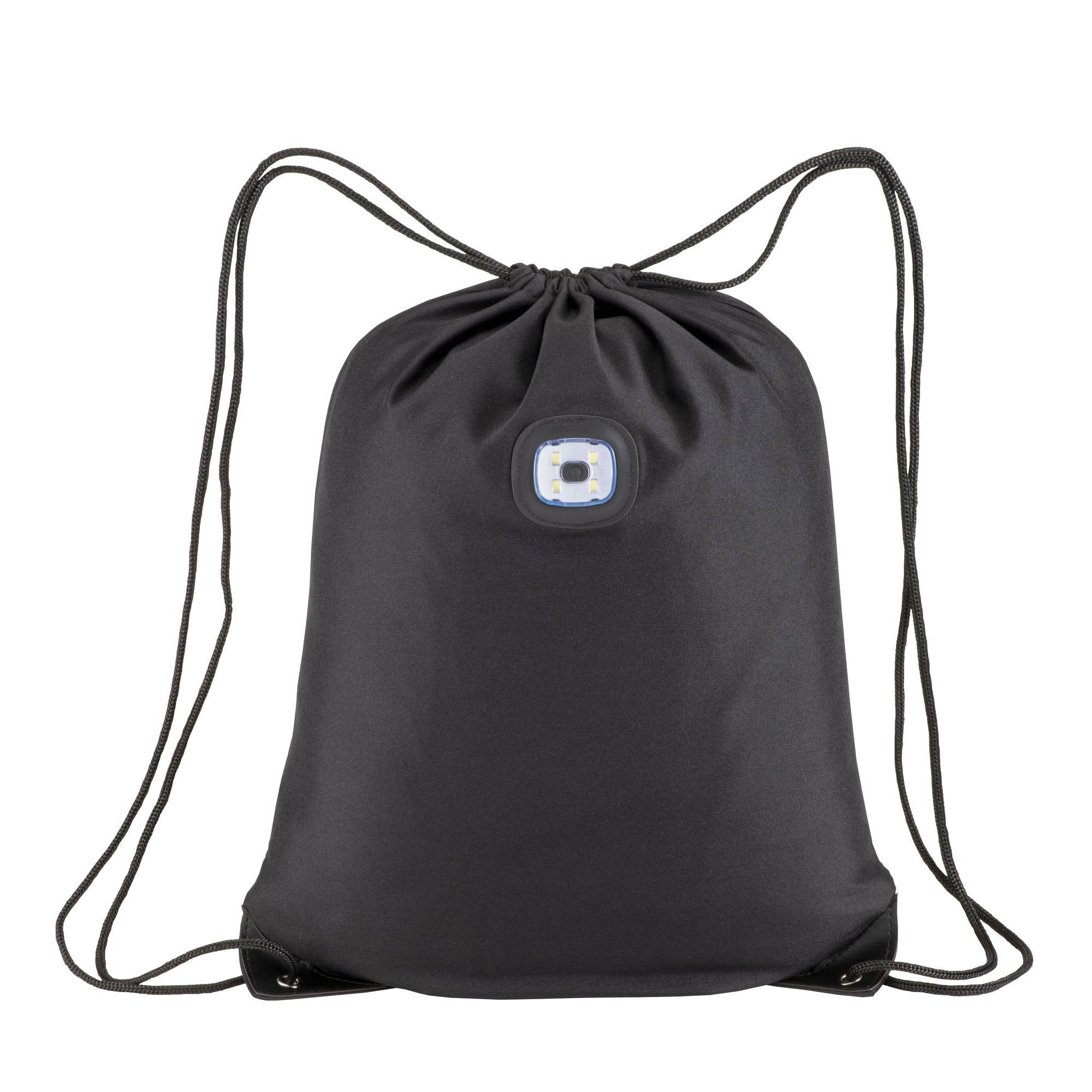 Zainetto in poliestere 300T con luce LED COB, angoli rinforzati.
