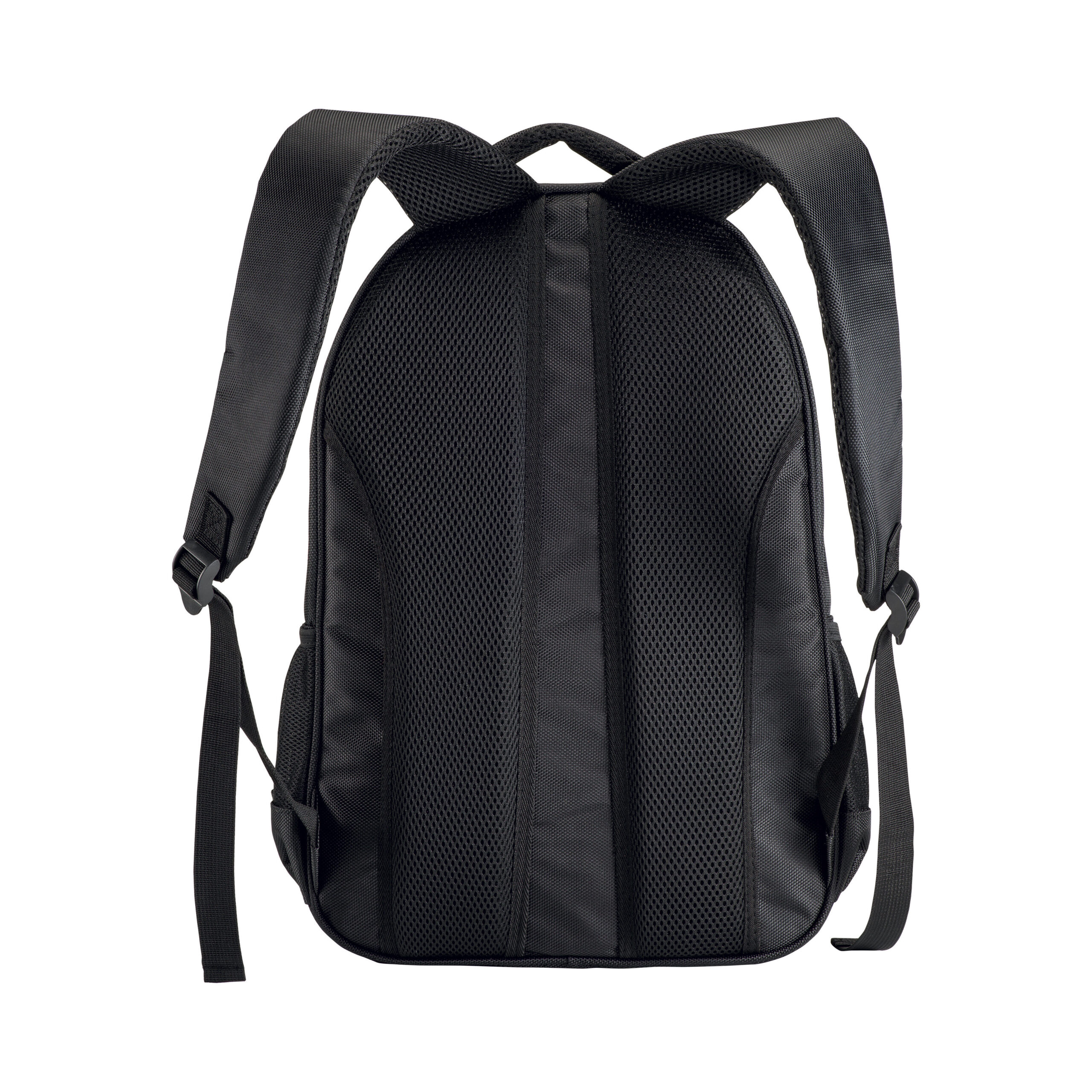 Zaino porta computer poliestere 1680D con tre tasche. Tasca principale porta pc e tasca frontale accessoriata. Schienale e spallacci imbottiti con materiale traspirante traspirante