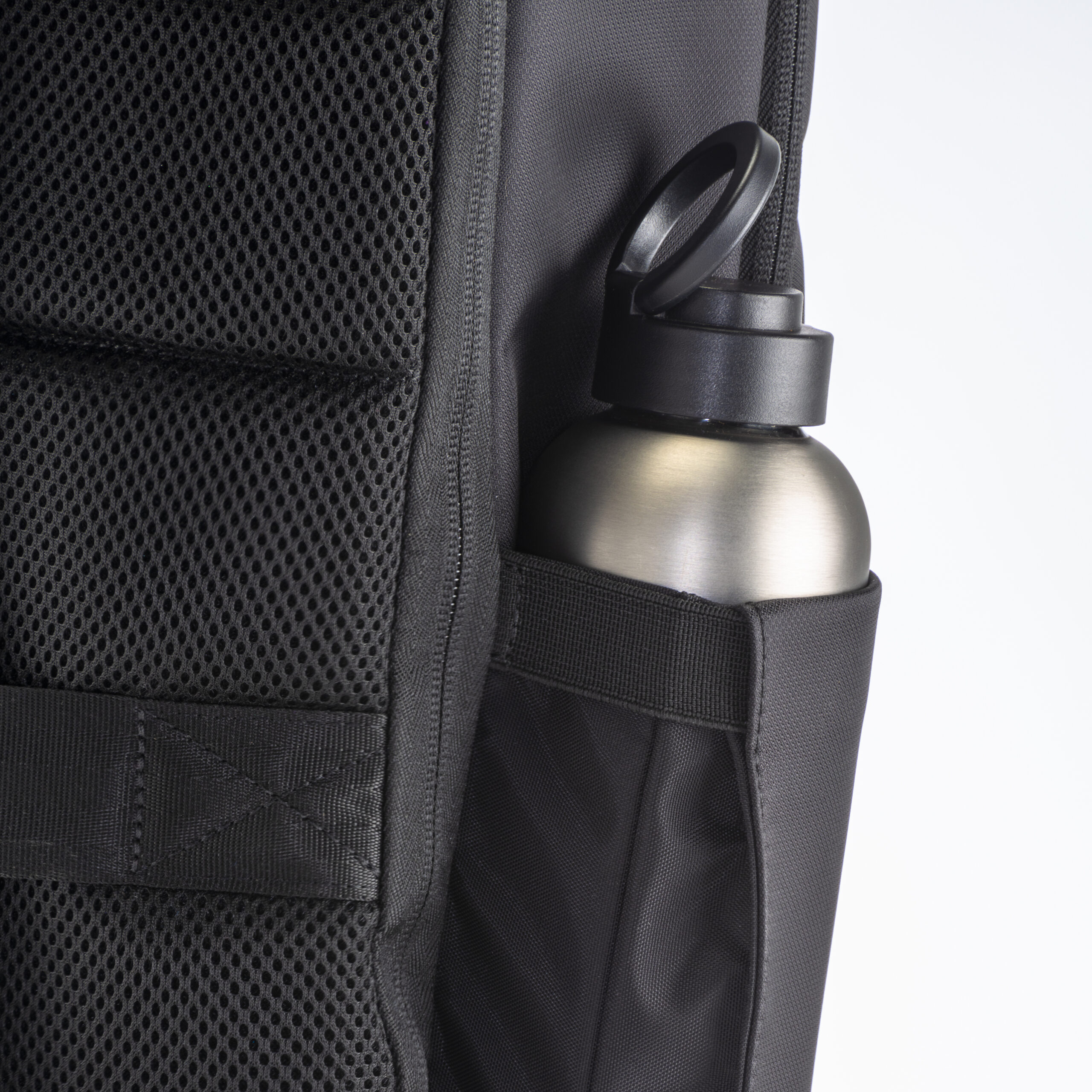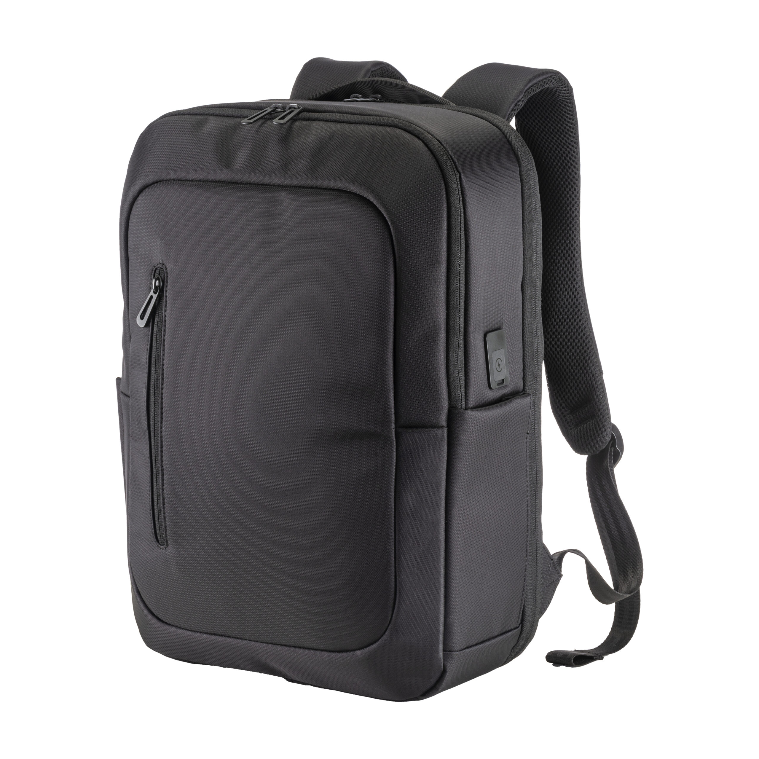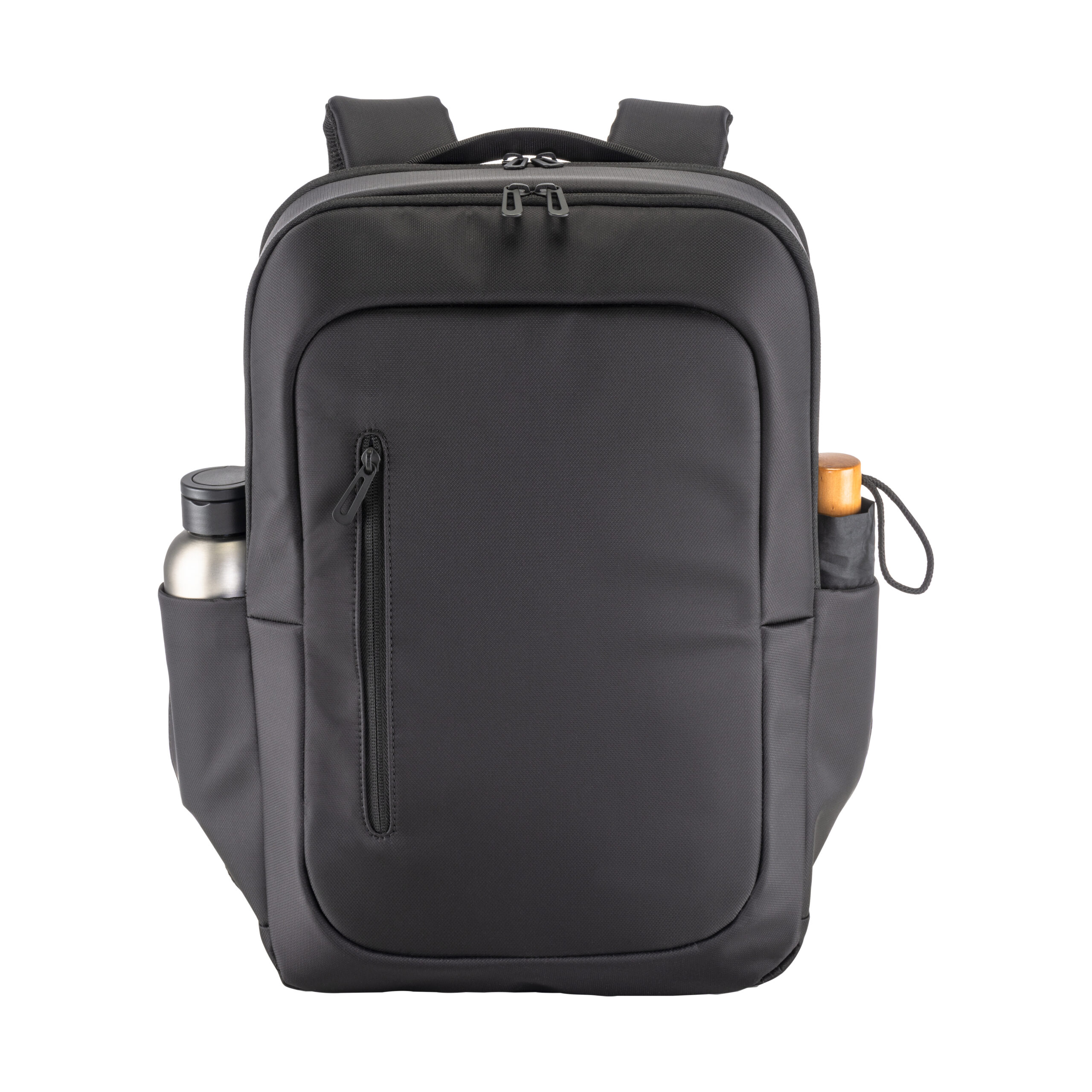 Zaino porta pc (15) in poliestere 210D. Tasca frontale con cerniera. Ampio scomparto principale e tasche laterali porta bottiglie. Presa USB. Schienale e spallacci imbottiti con materiale traspirante. Sistema aggancio ai trolley