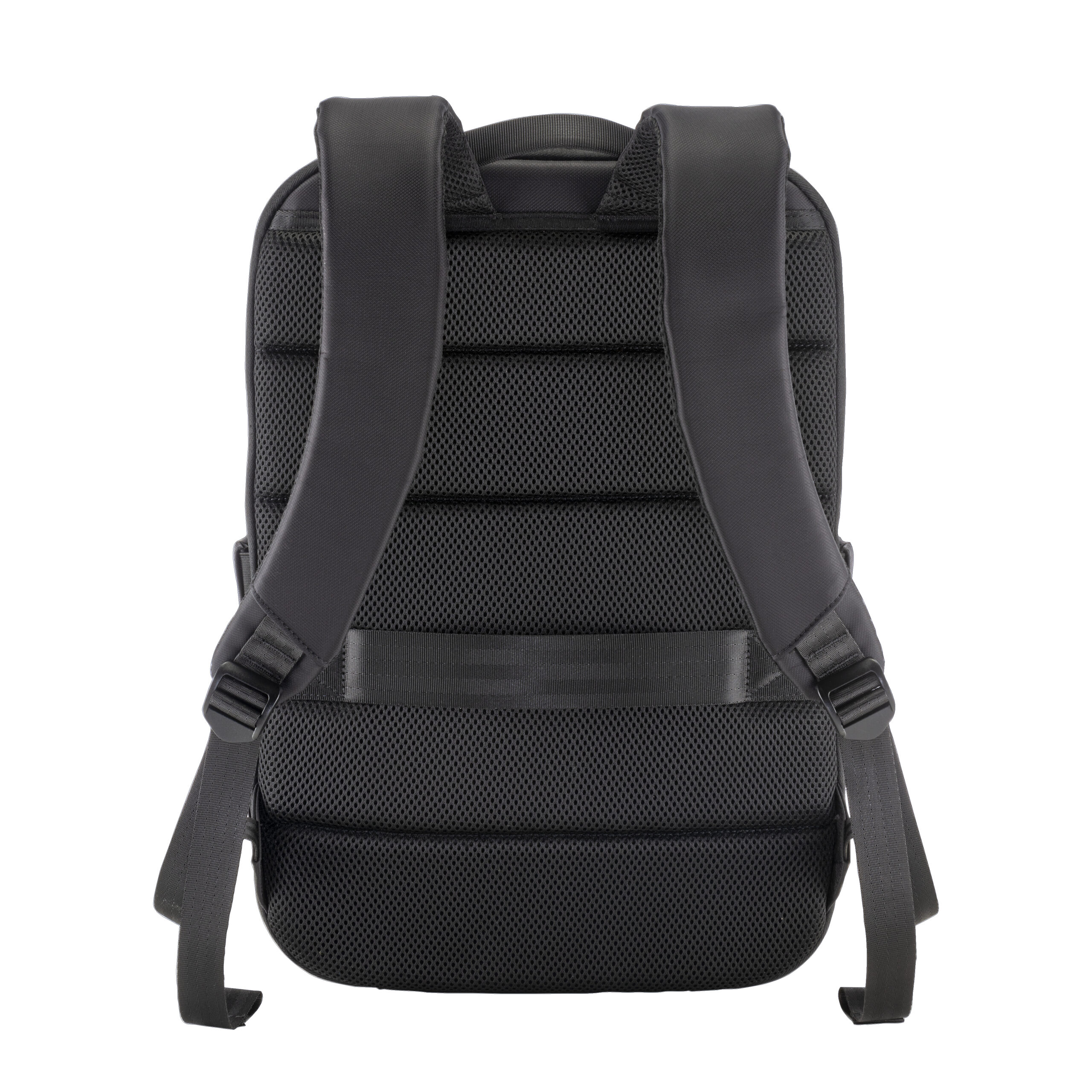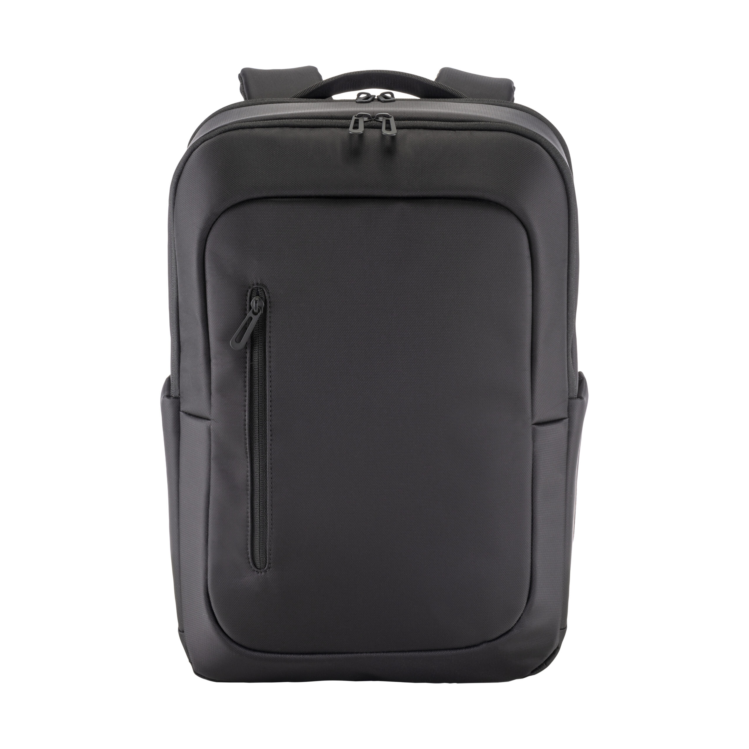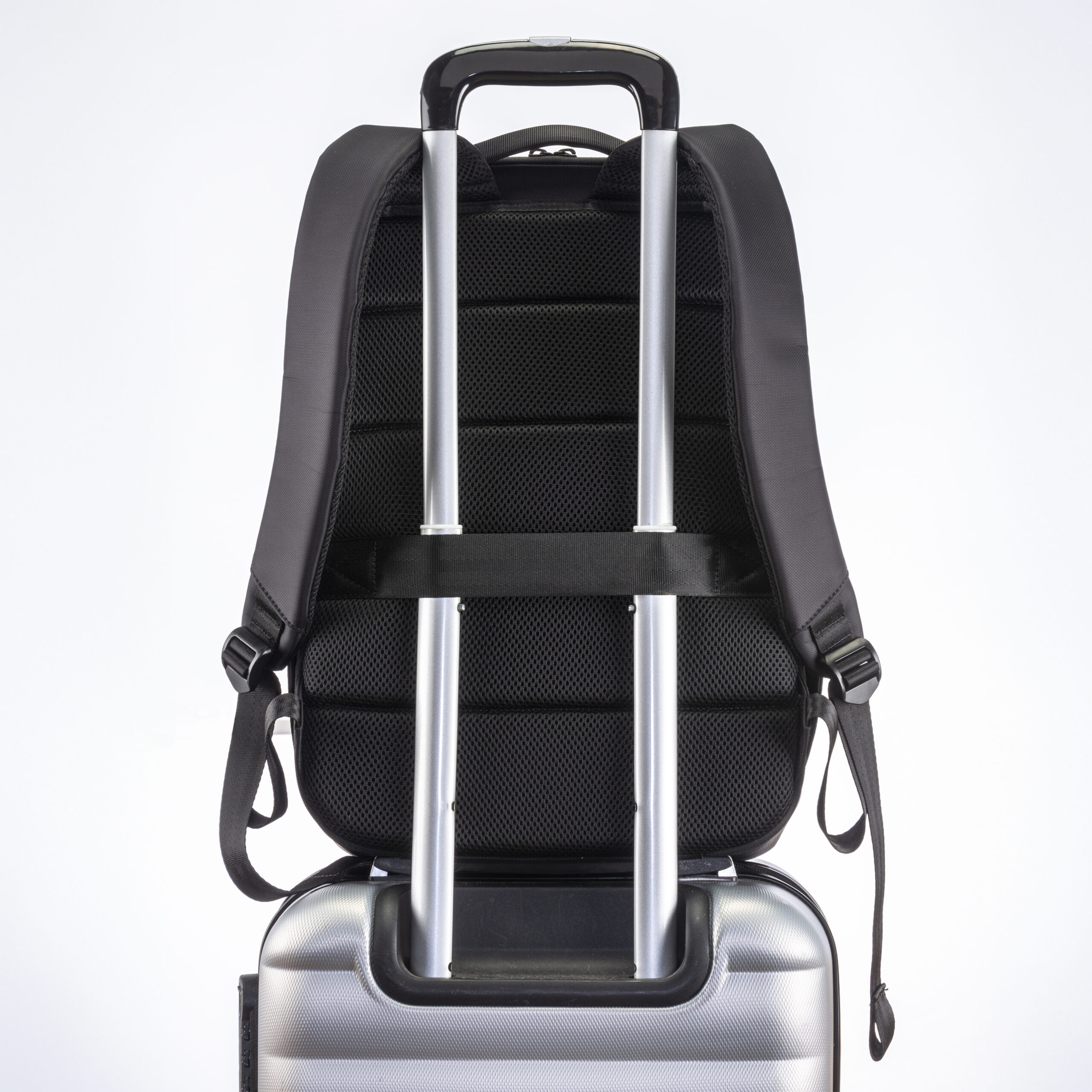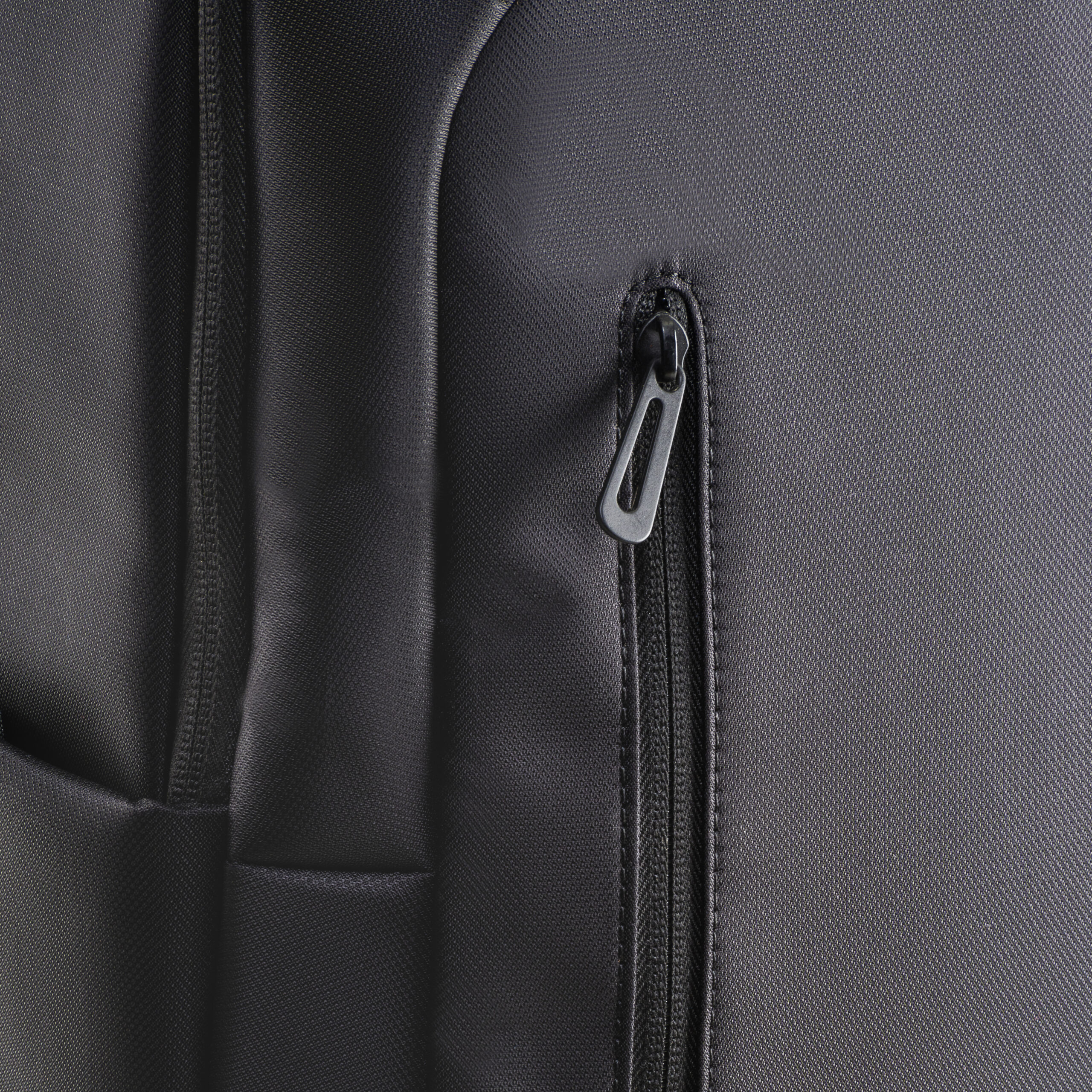Zaino porta pc (15) in poliestere 210D. Tasca frontale con cerniera. Ampio scomparto principale e tasche laterali porta bottiglie. Presa USB. Schienale e spallacci imbottiti con materiale traspirante. Sistema aggancio ai trolley