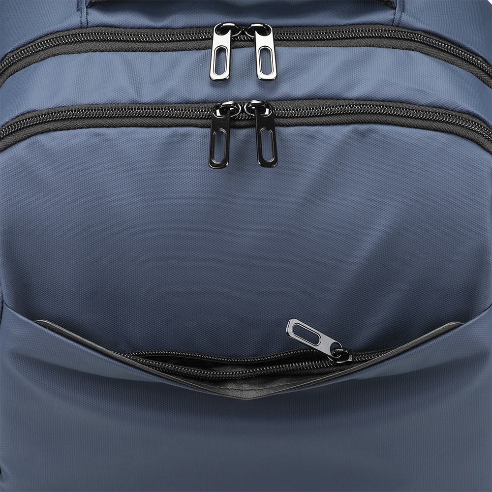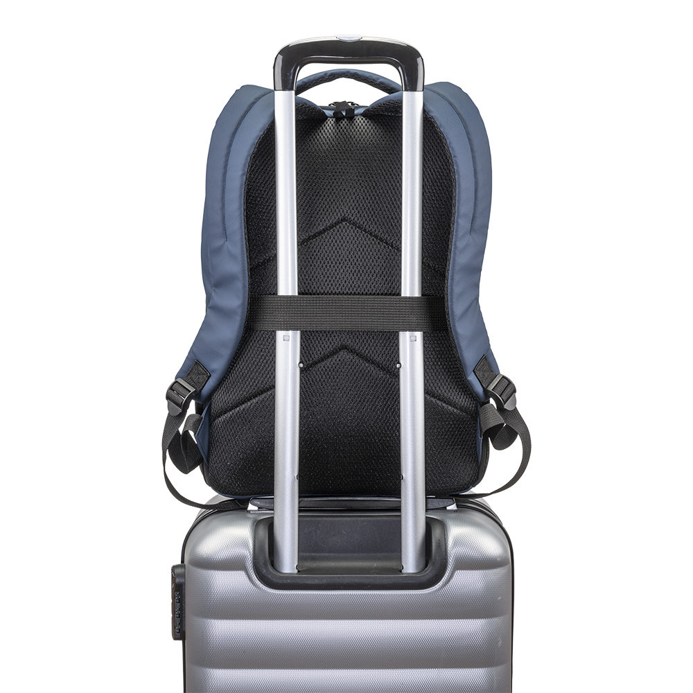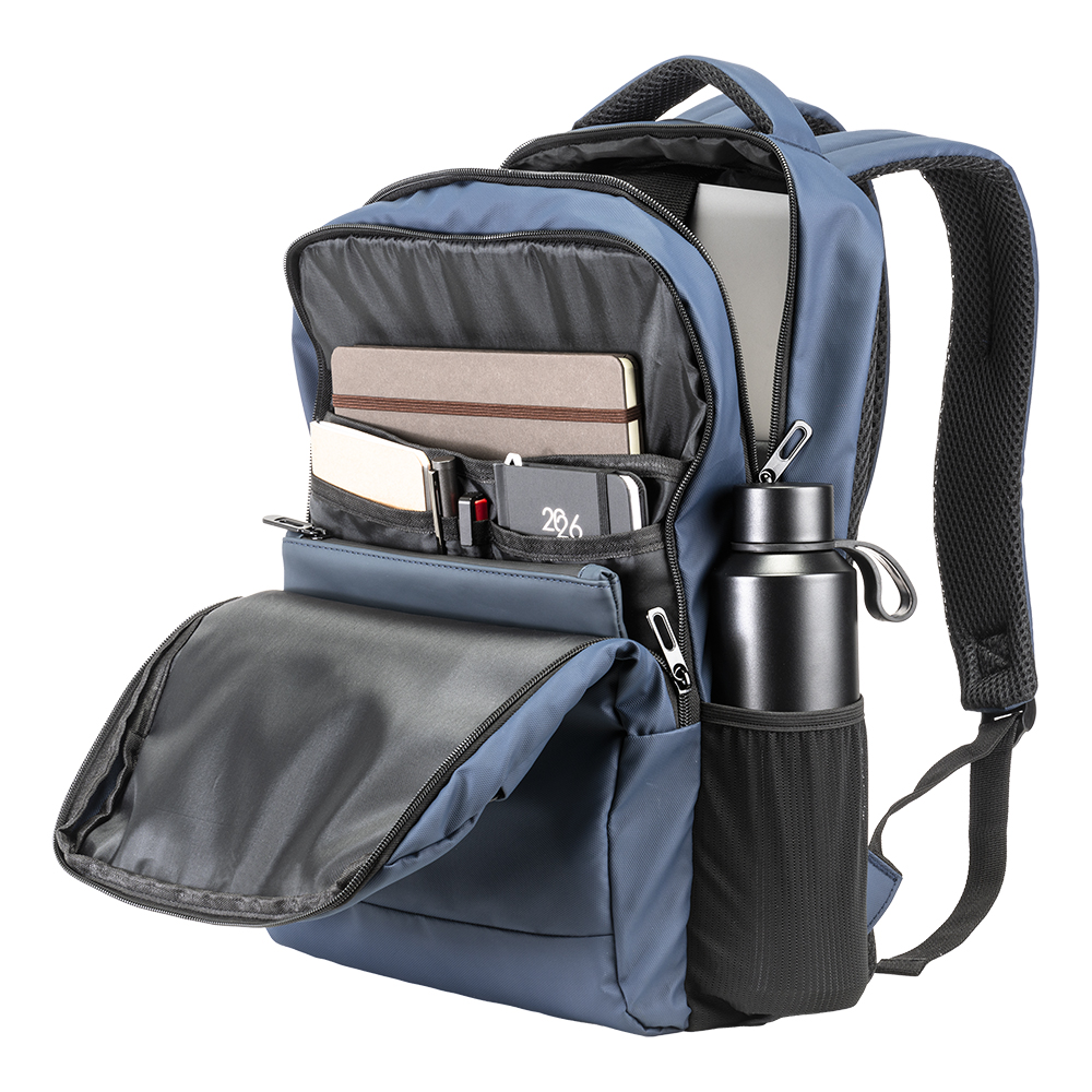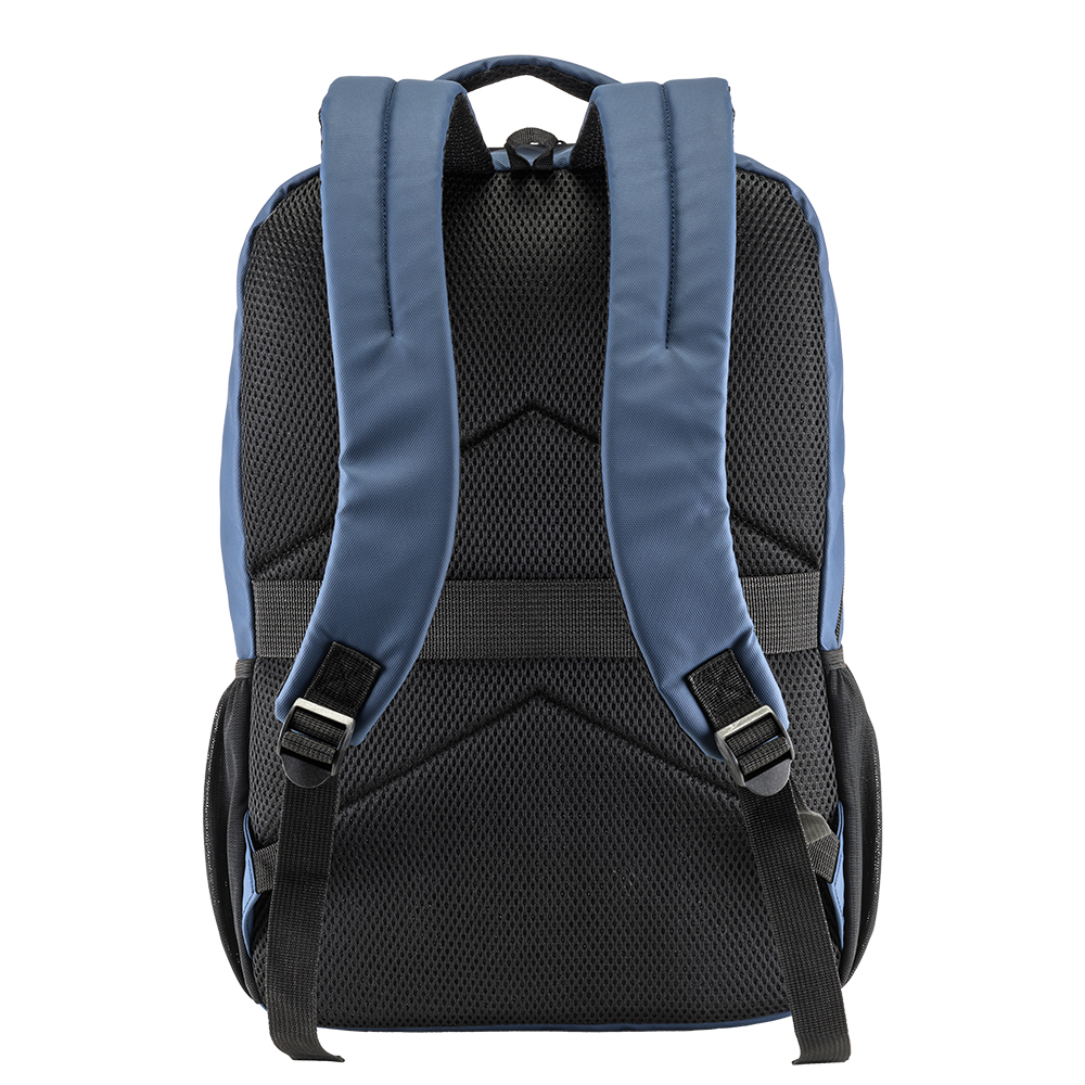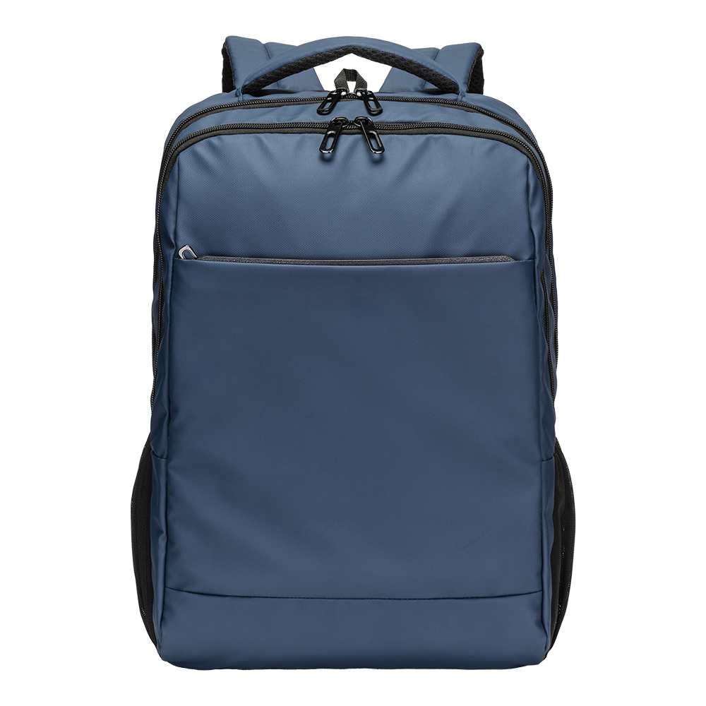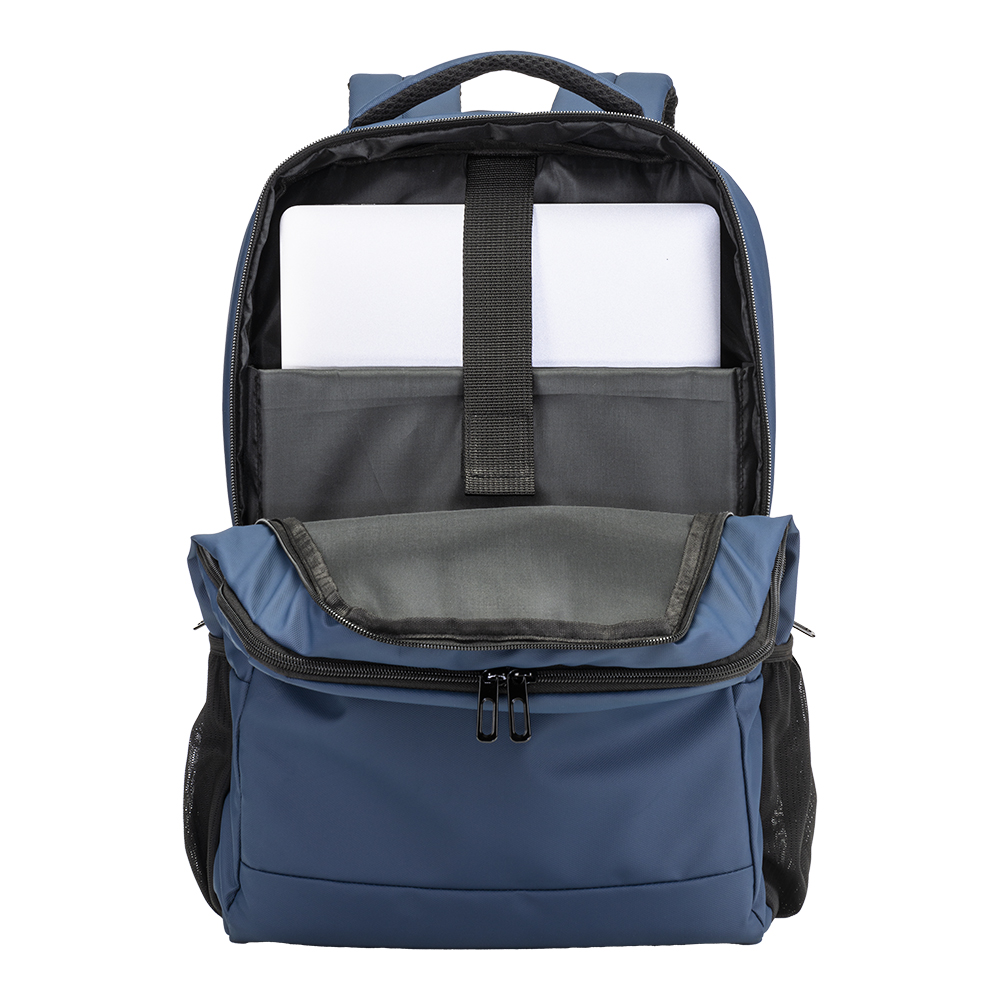 Zaino porta pc in poliestere 600D con rivestimento in PU water resistant. Compartimento imbottito per notebook. Tasca frontale con cerniera e tasche laterali in rete. Schienale e spallacci imbottiti con materiale traspirante. Sistema d’aggancio ai trolley.