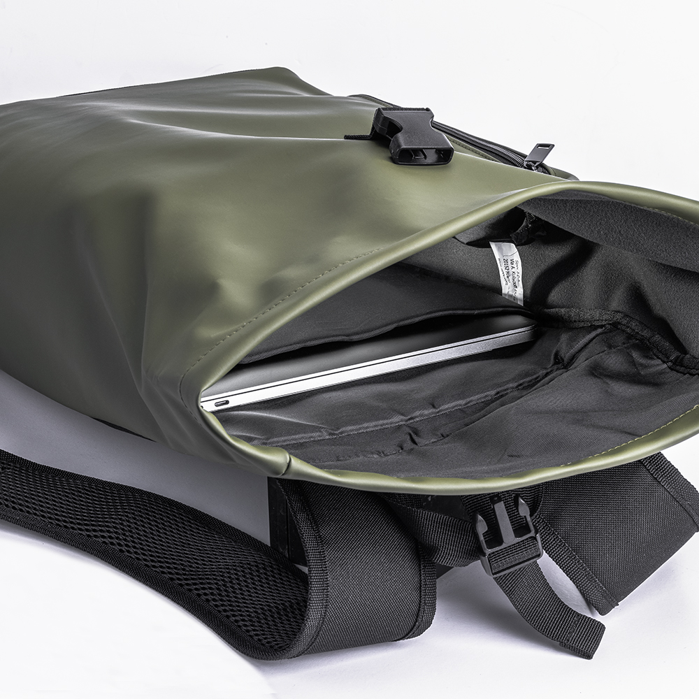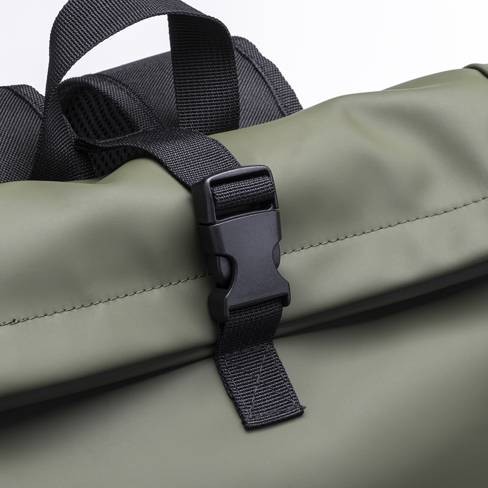 Zaino porta pc (15) in PU. Compartimento imbottito per notebook. Tasca frontale con zip verticale. Spallacci con materiale traspirante