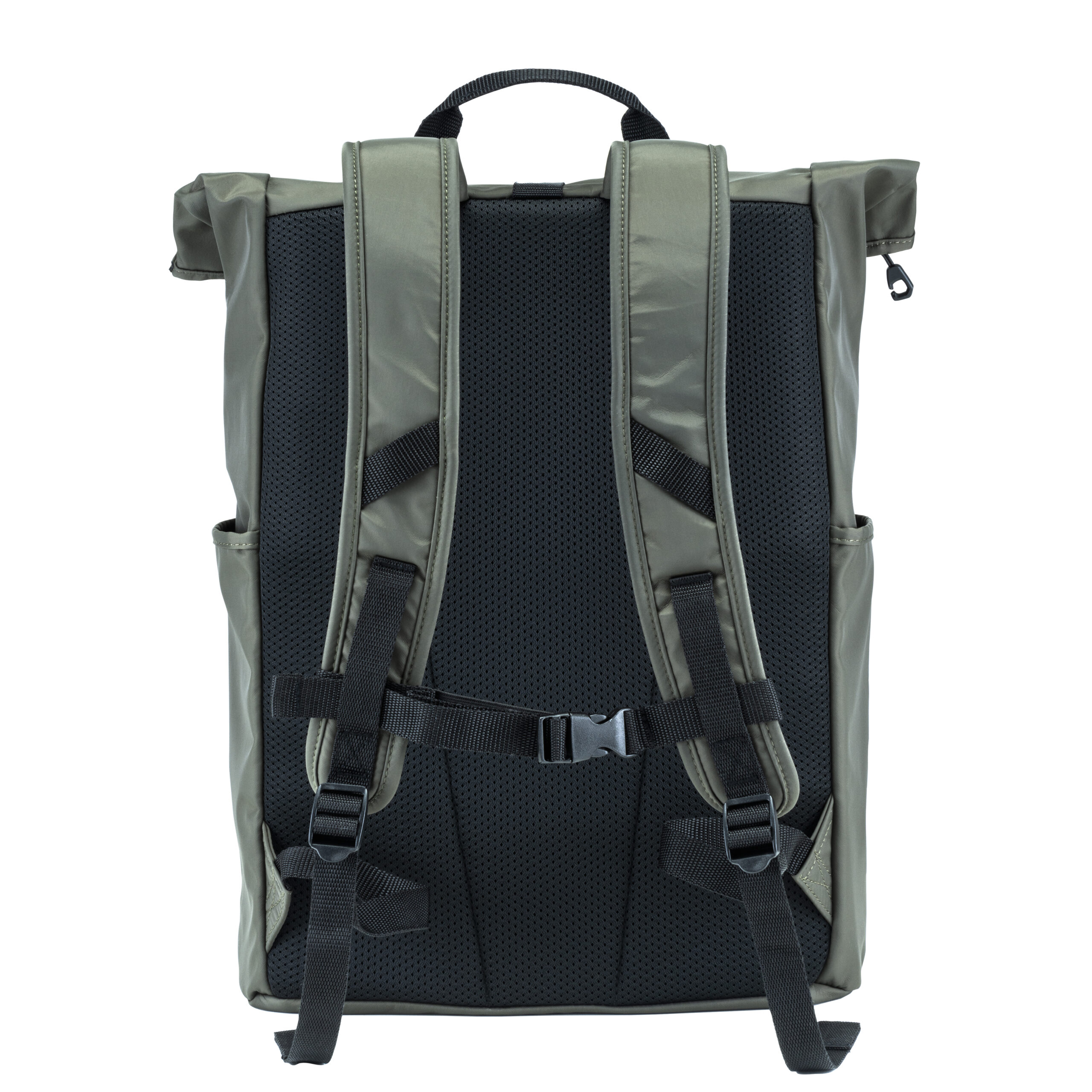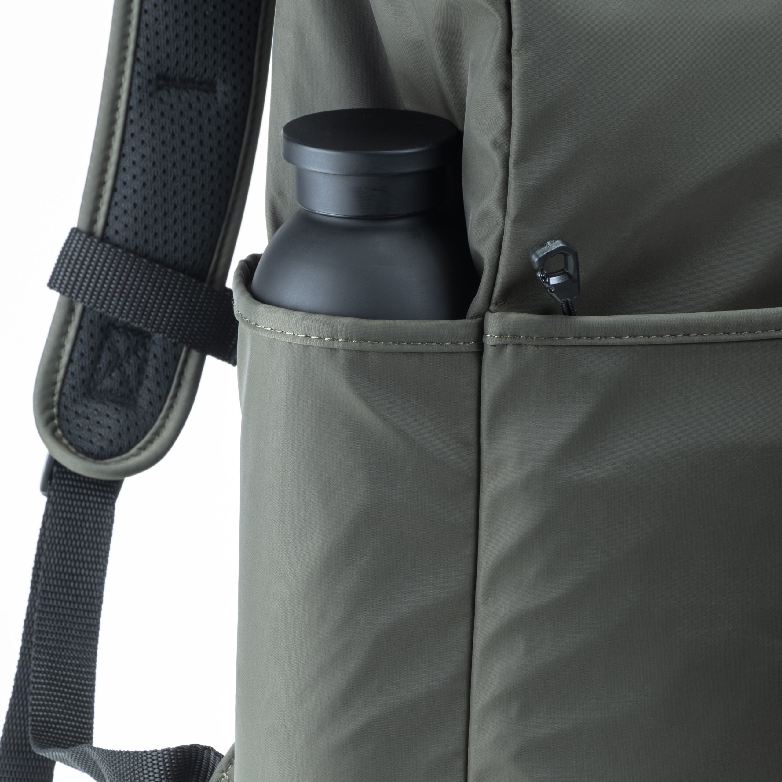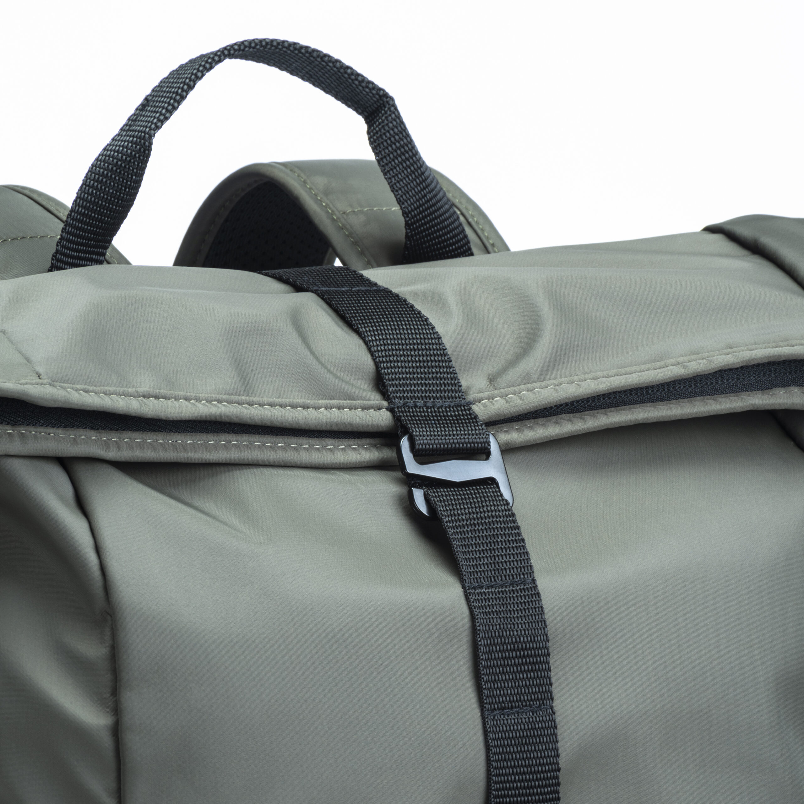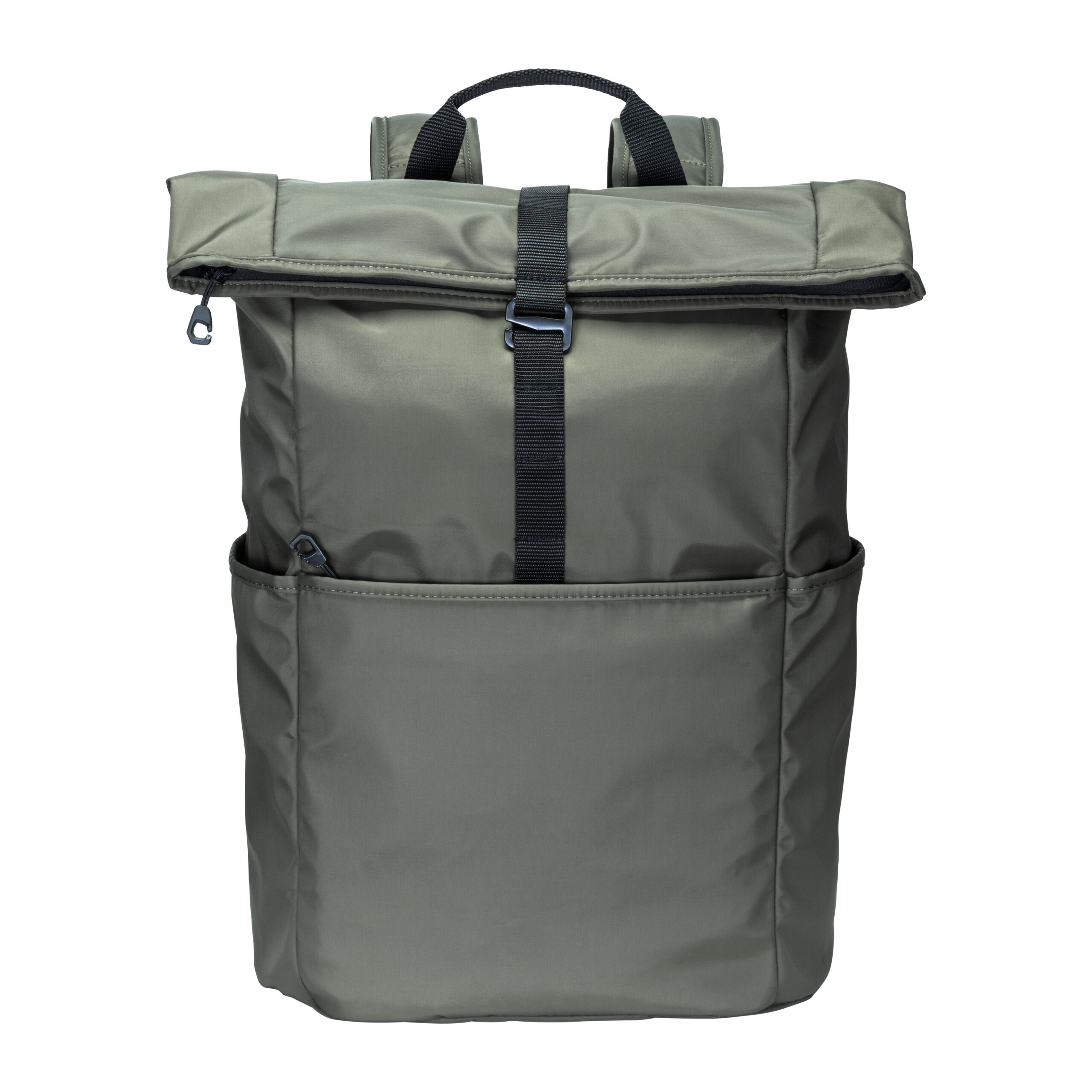 Zaino porta pc (15) pieghevole in nylon 310T. Questo zaino si arrotola su se stesso per diventare compatto e facile da trasportare. Ampio scomparto principale con chiusura con gancio in metallo. Tasca frontale con cerniera e 2 tasche laterali. Schienale e spallacci imbottiti con materiale traspirante