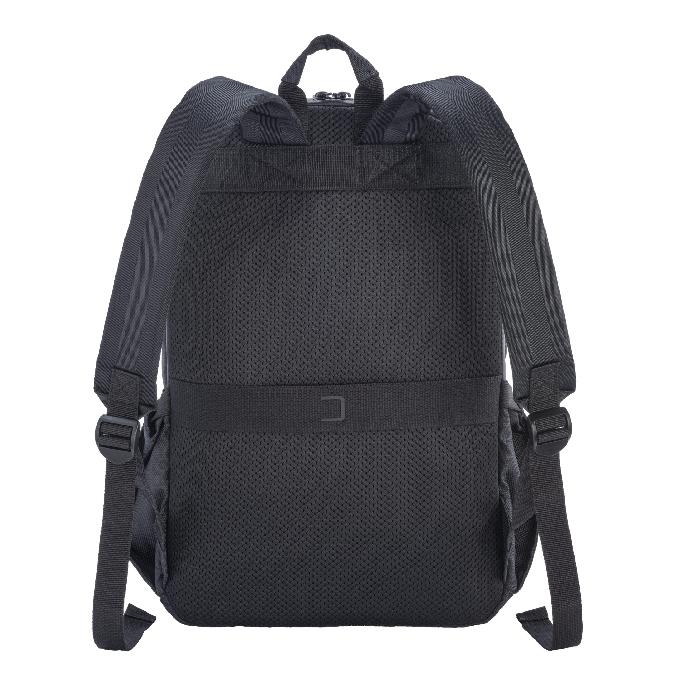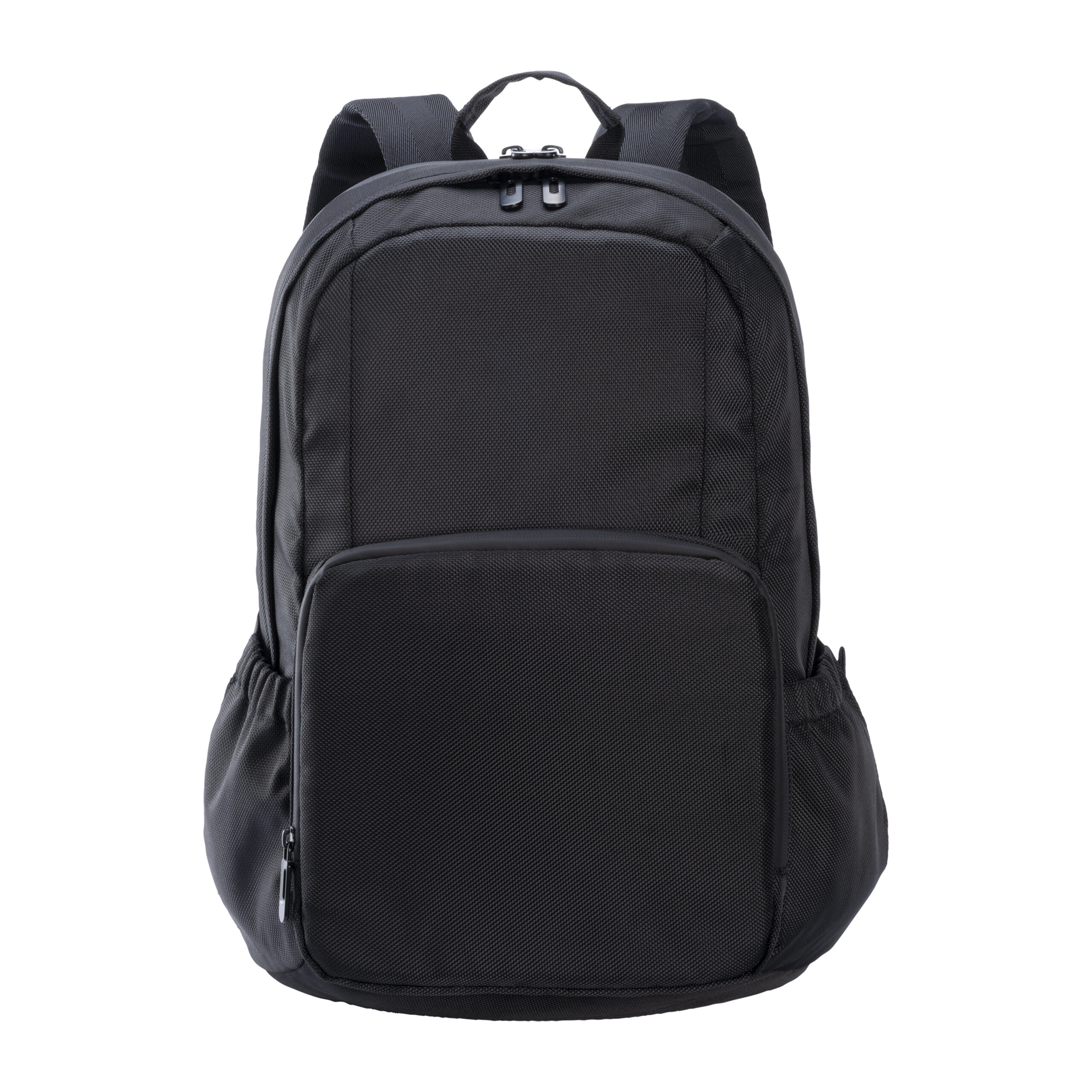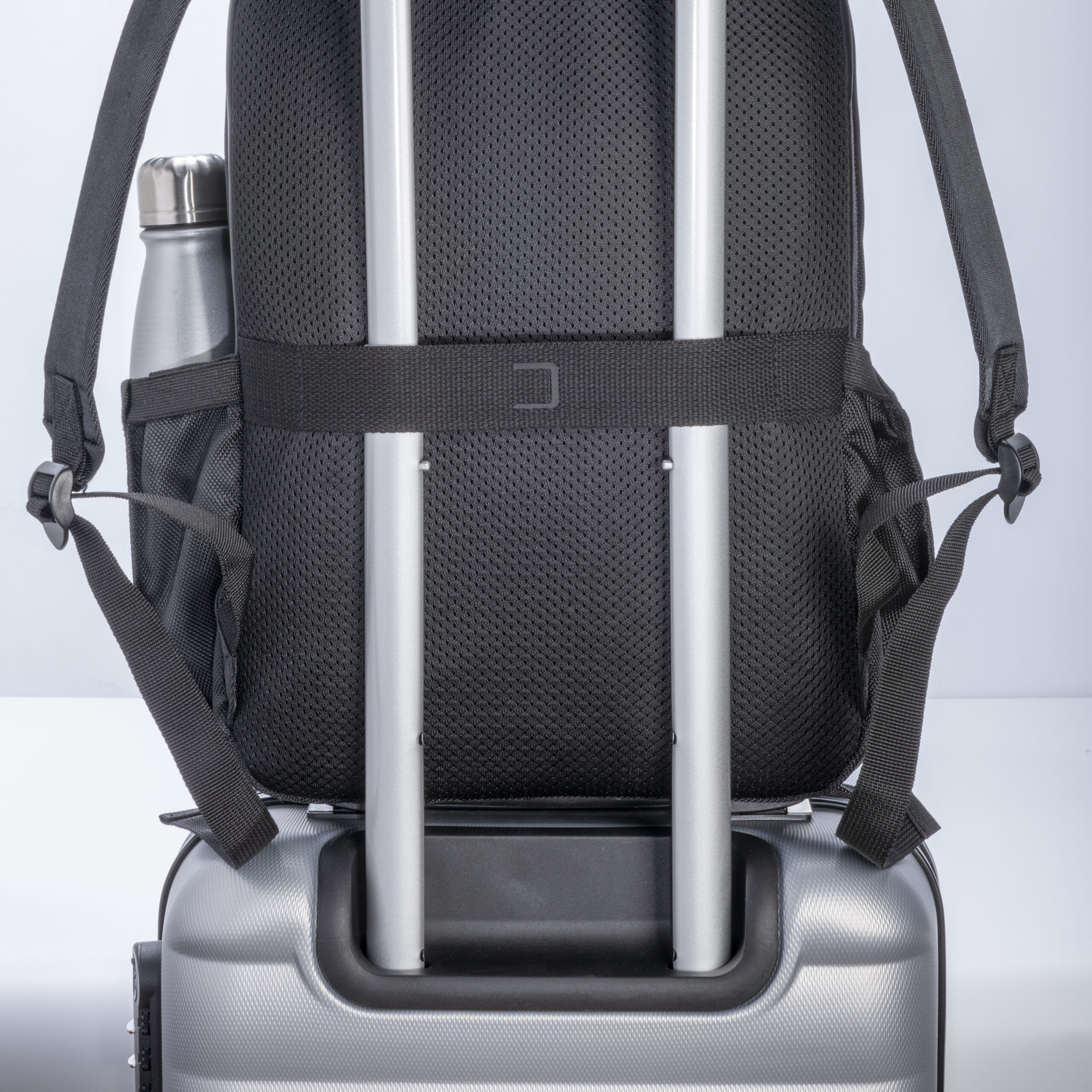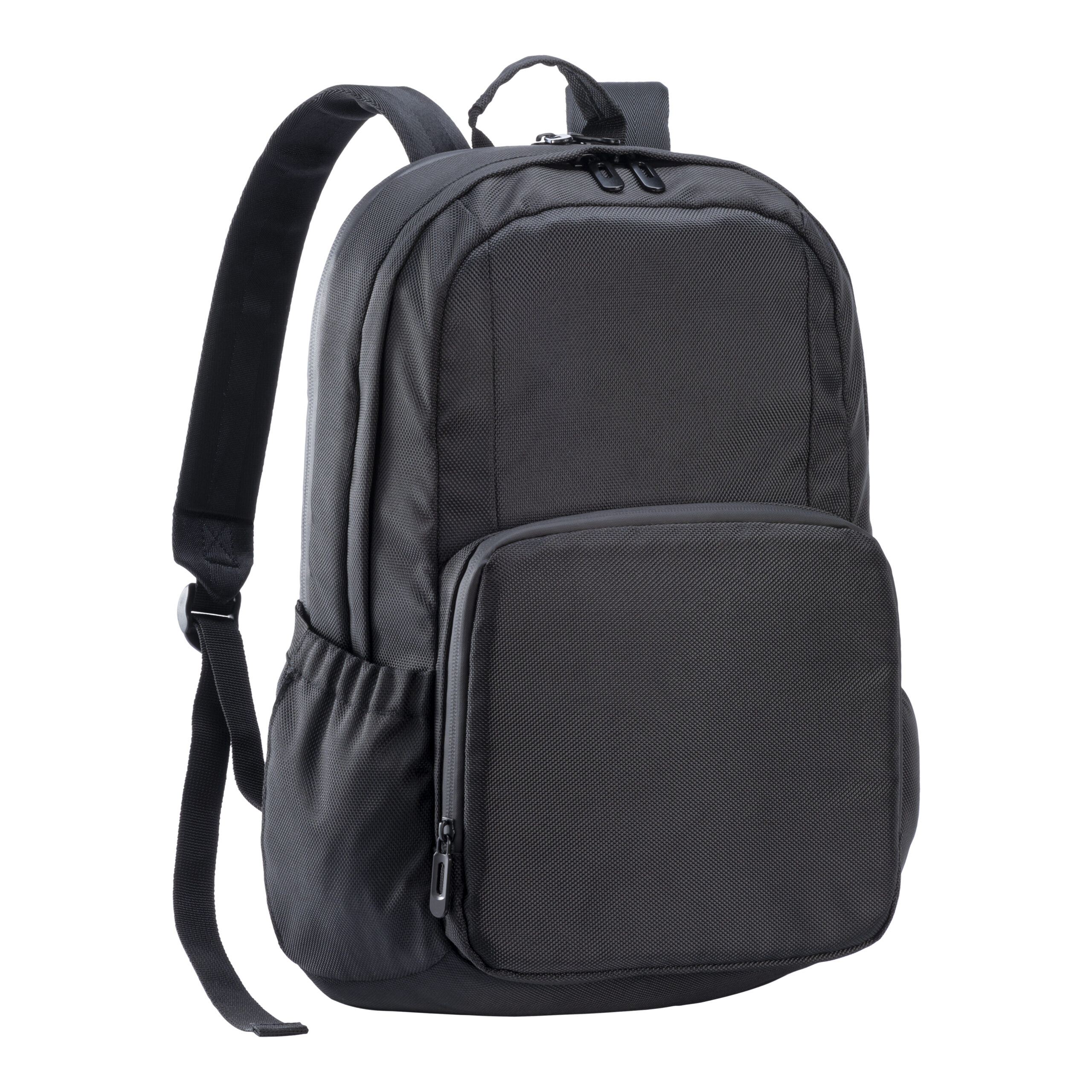 Zaino porta PC (15″) in PET riciclato. Tasca frontale con cerniera e tasche laterali con elastico. Compartimento imbottito per notebook, schienale e spallacci imbottiti con materiale traspirante. Sistema di aggancio ai trolley