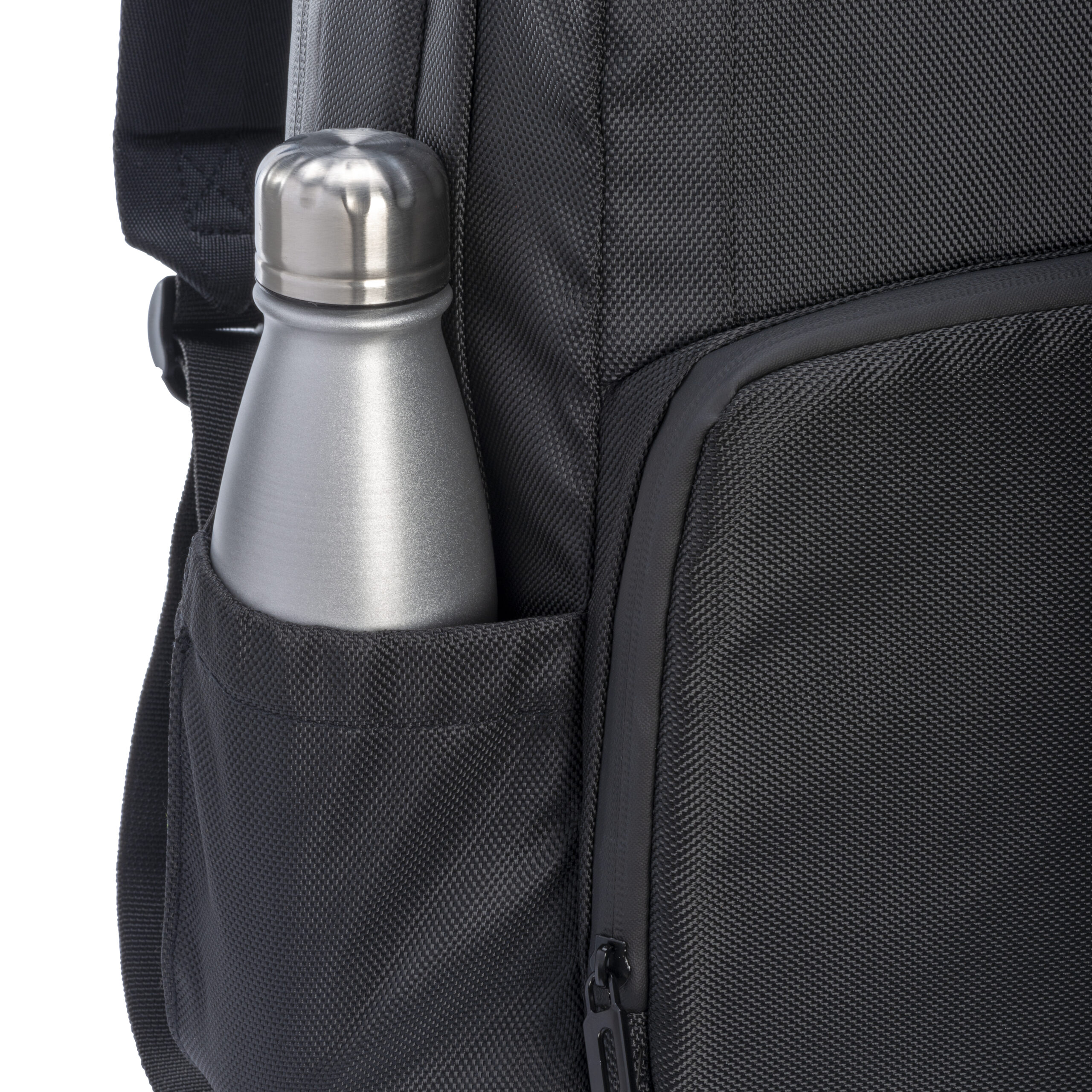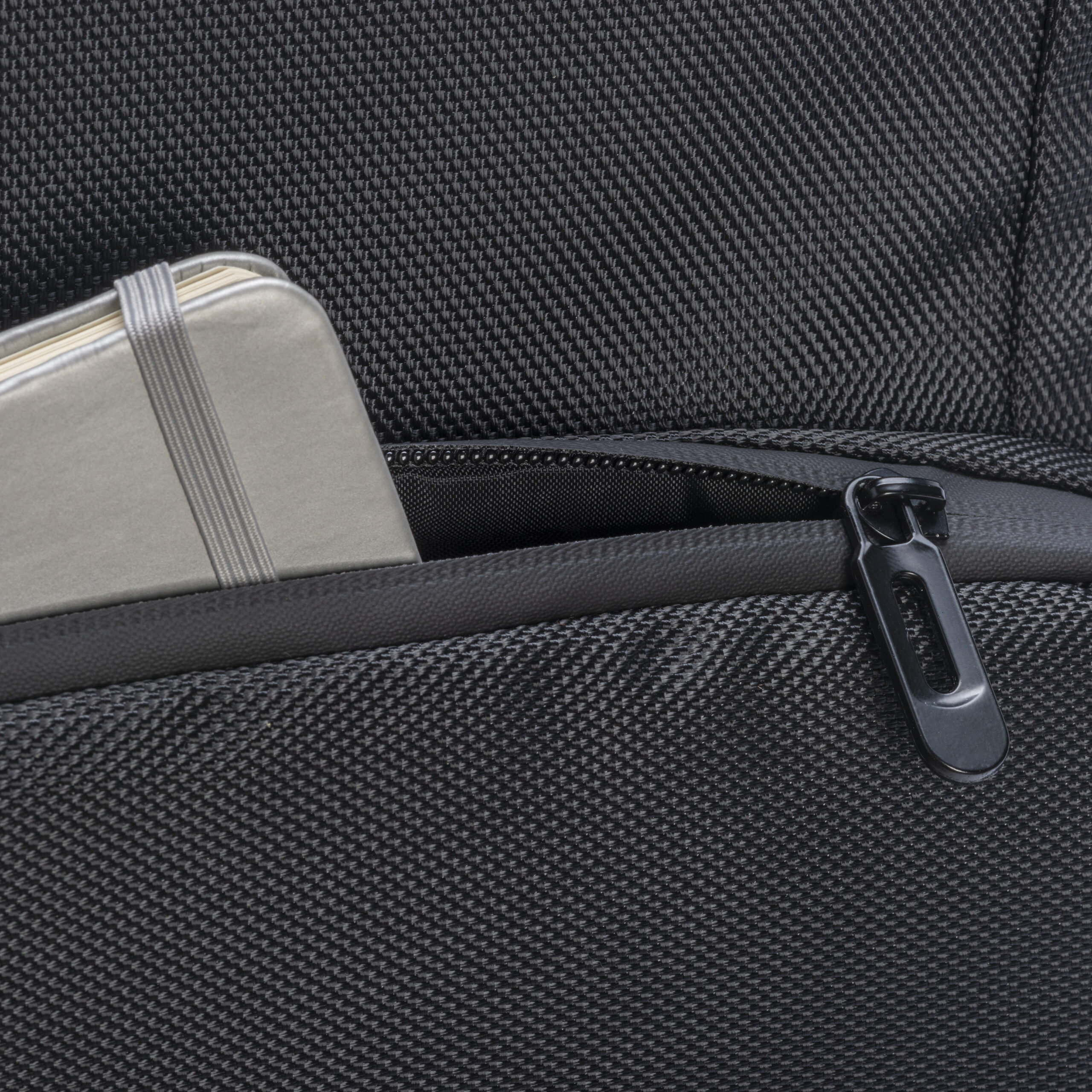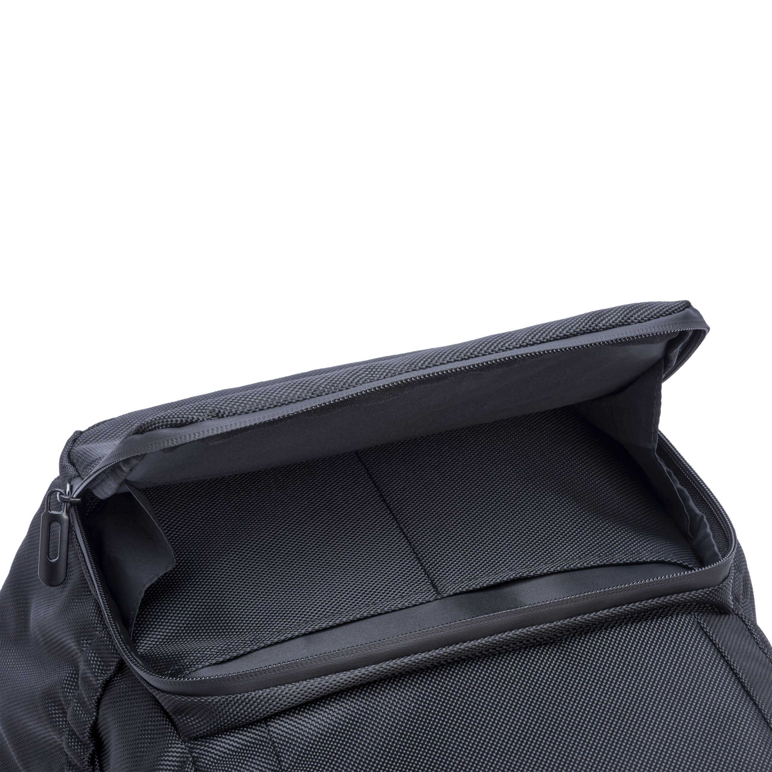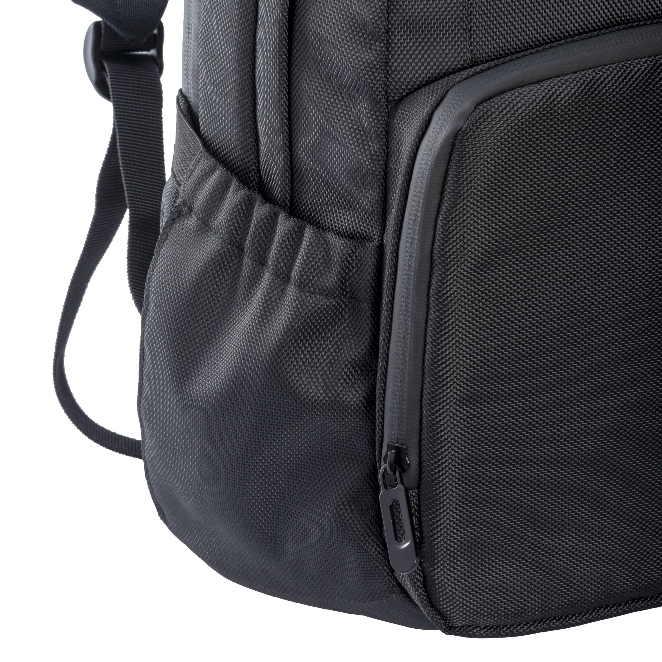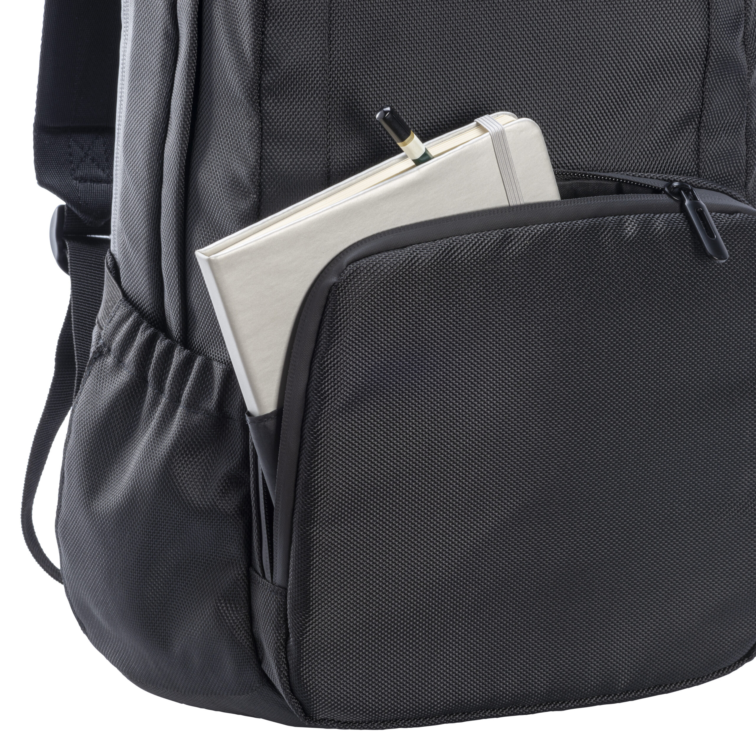 Zaino porta PC (15″) in PET riciclato. Tasca frontale con cerniera e tasche laterali con elastico. Compartimento imbottito per notebook, schienale e spallacci imbottiti con materiale traspirante. Sistema di aggancio ai trolley