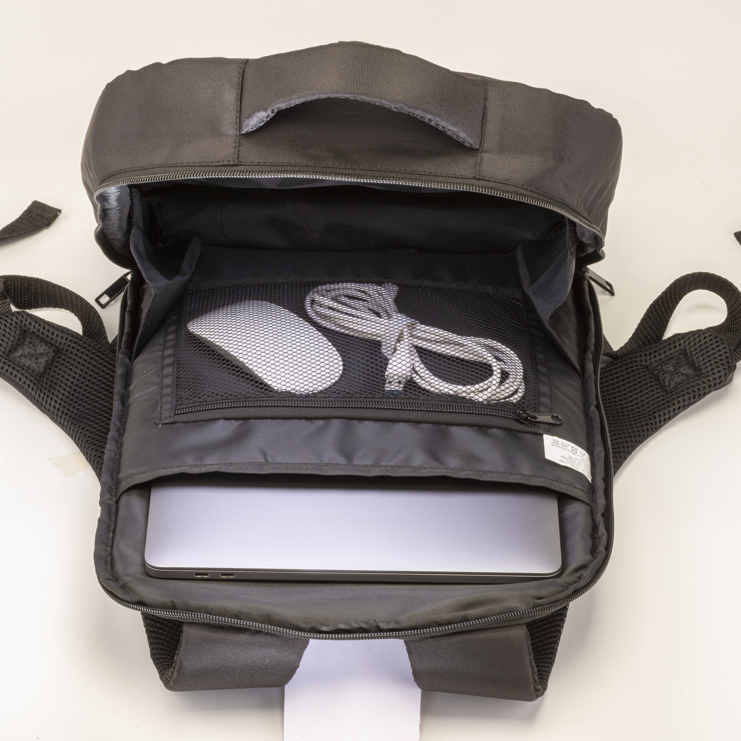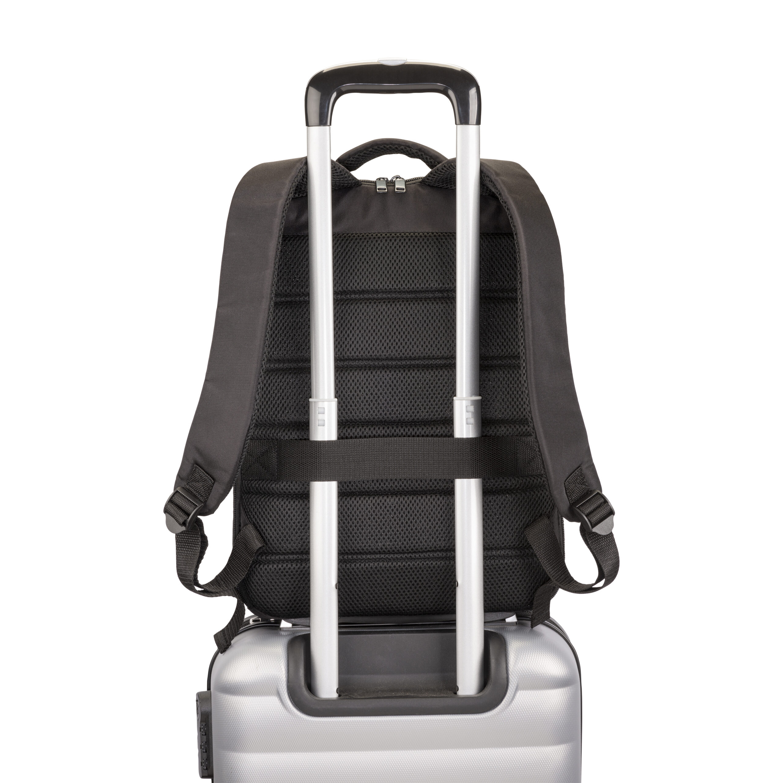 Zaino porta PC (15″)in PET riciclato. Compartimento imbottito per notebook, schienale e spallacci imbottiti con materiale traspirante. Sistema di aggancio ai trolley