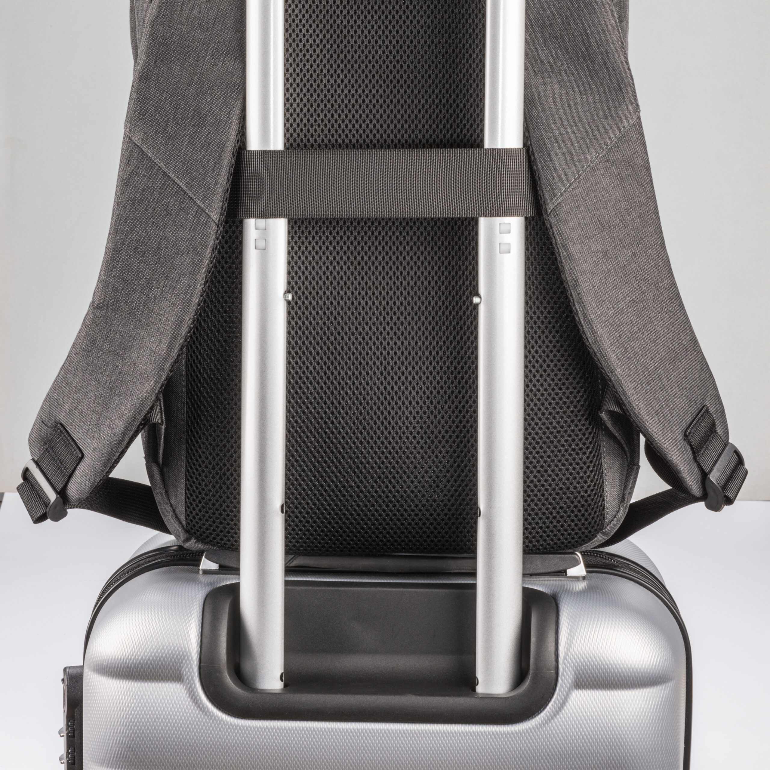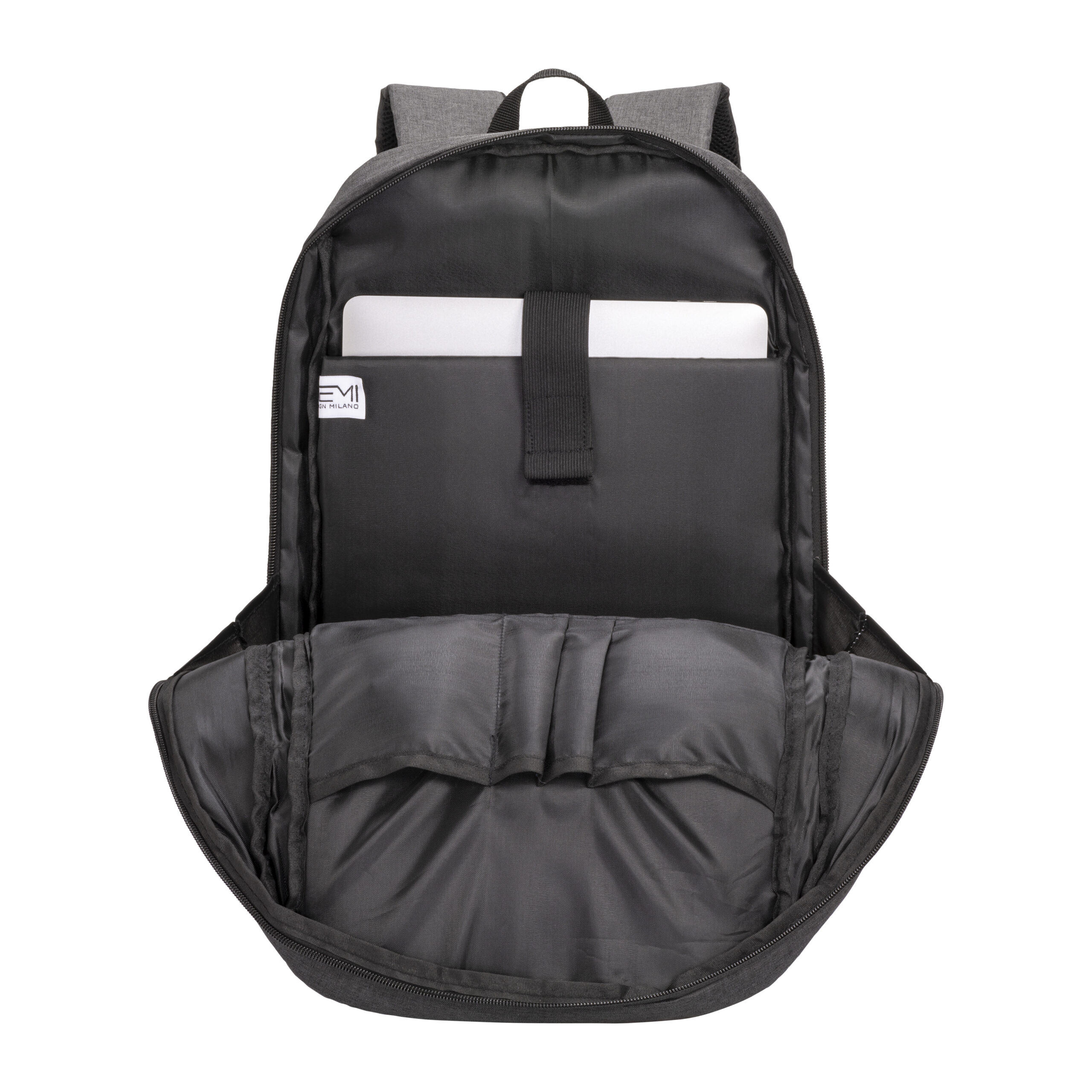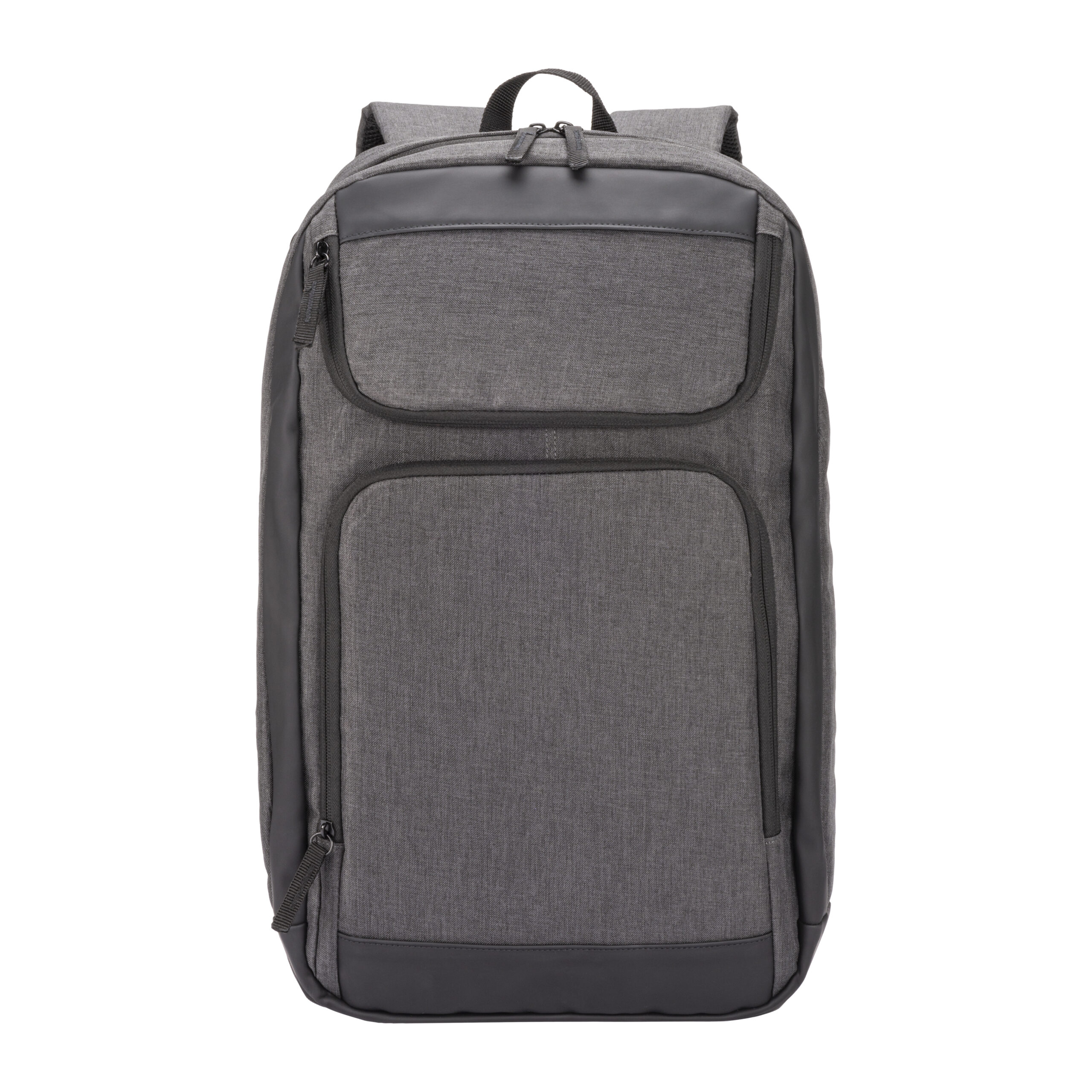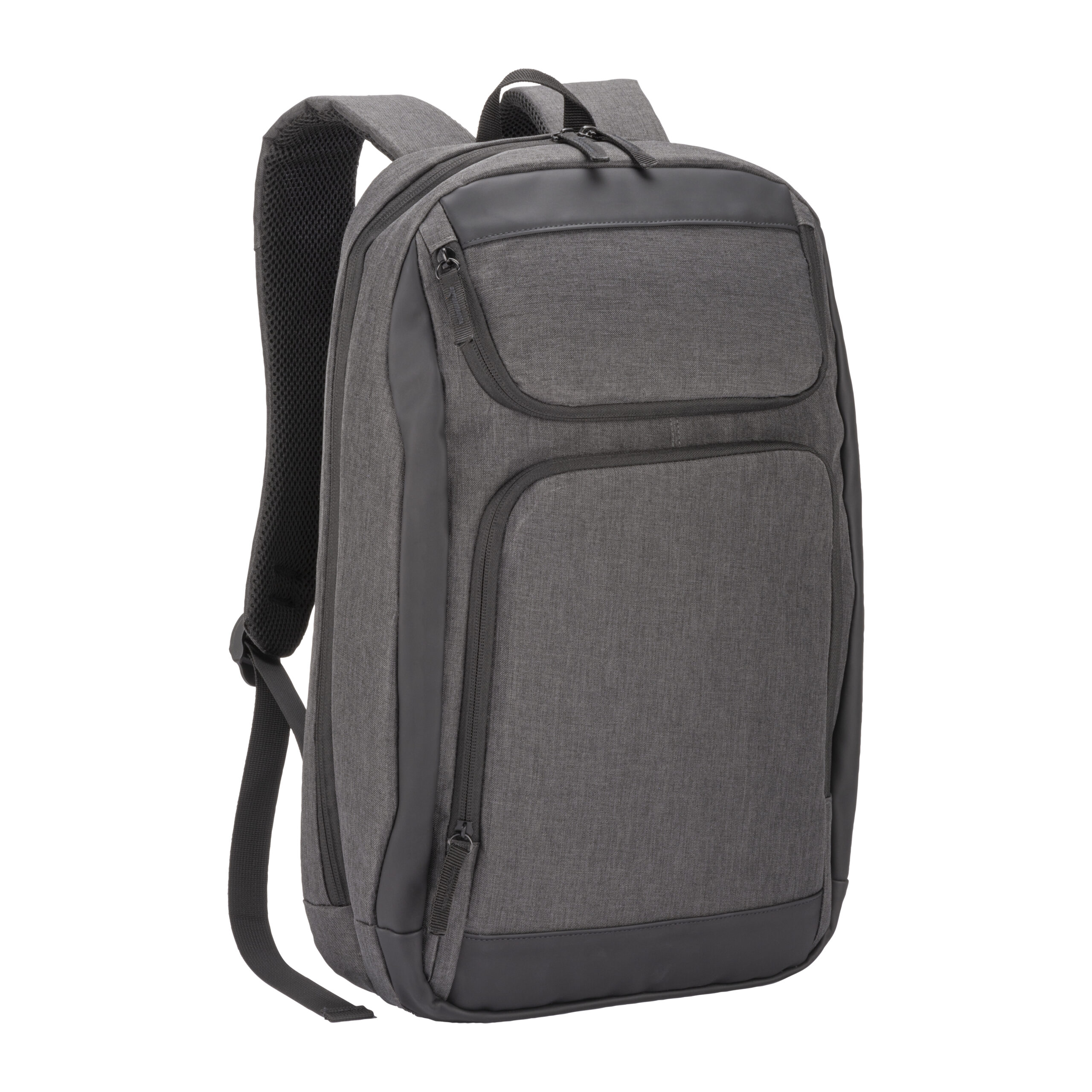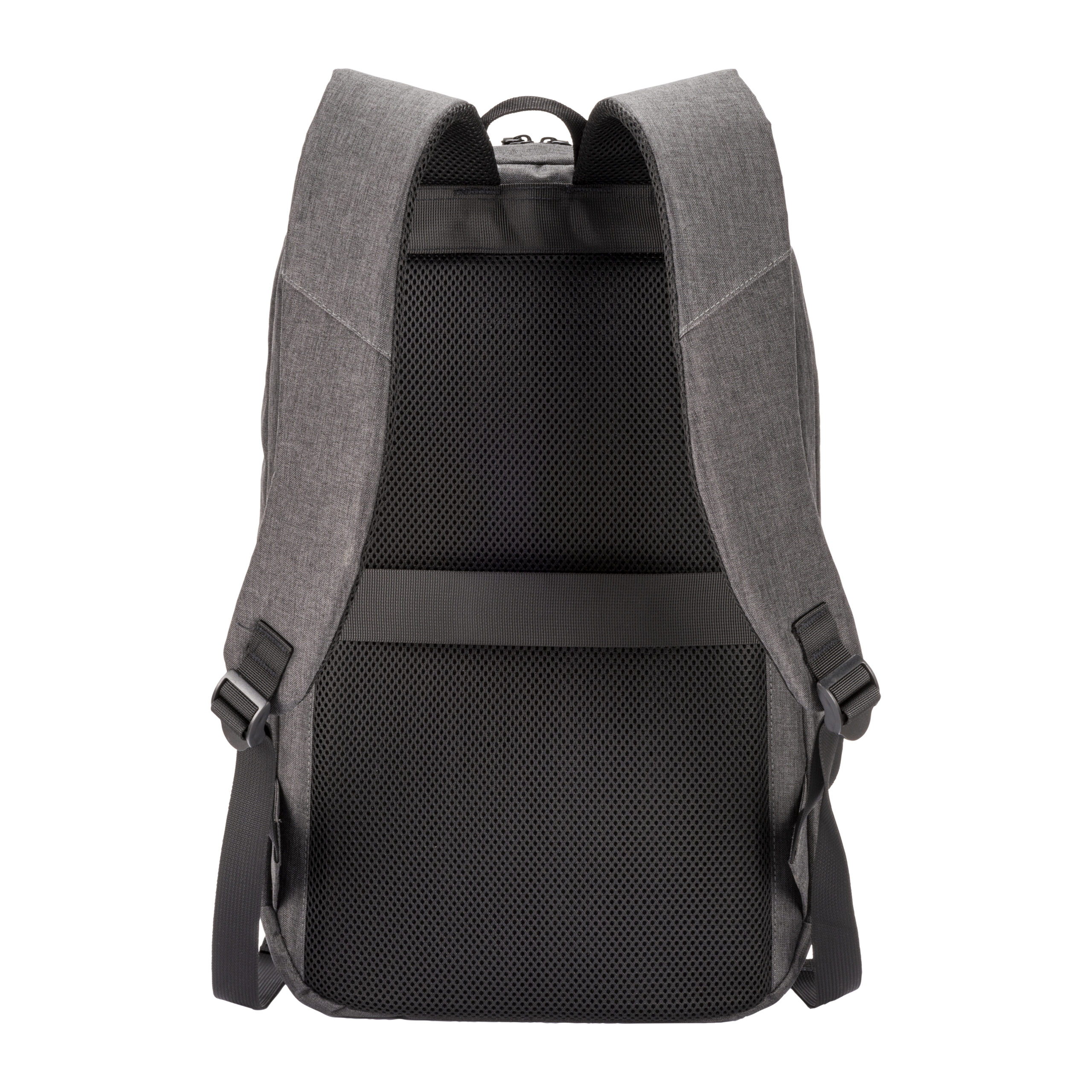 Zaino porta PC (15″) in PET riciclato. Due tasche frontali con cerniera. Compartimento imbottito per notebook, schienale e spallacci imbottiti con materiale traspirante. Sistema di aggancio ai trolley
